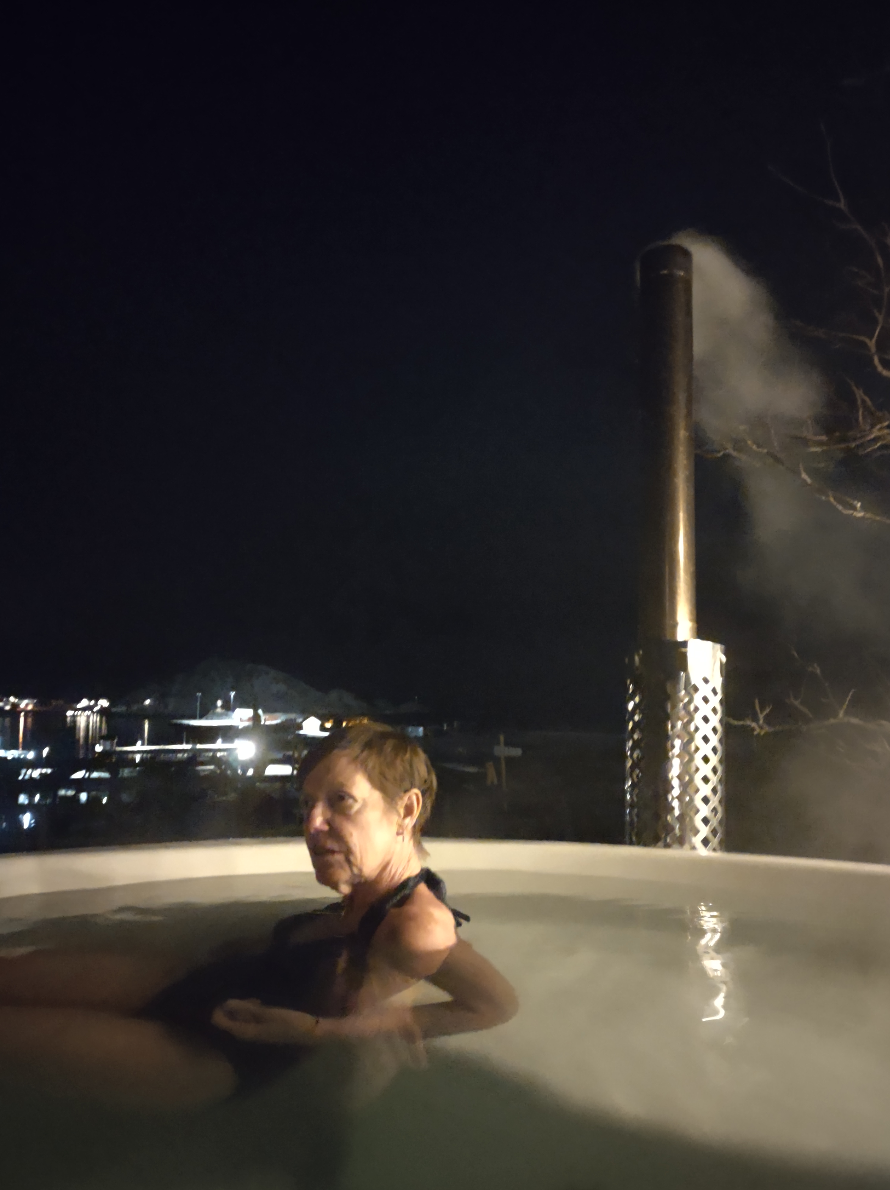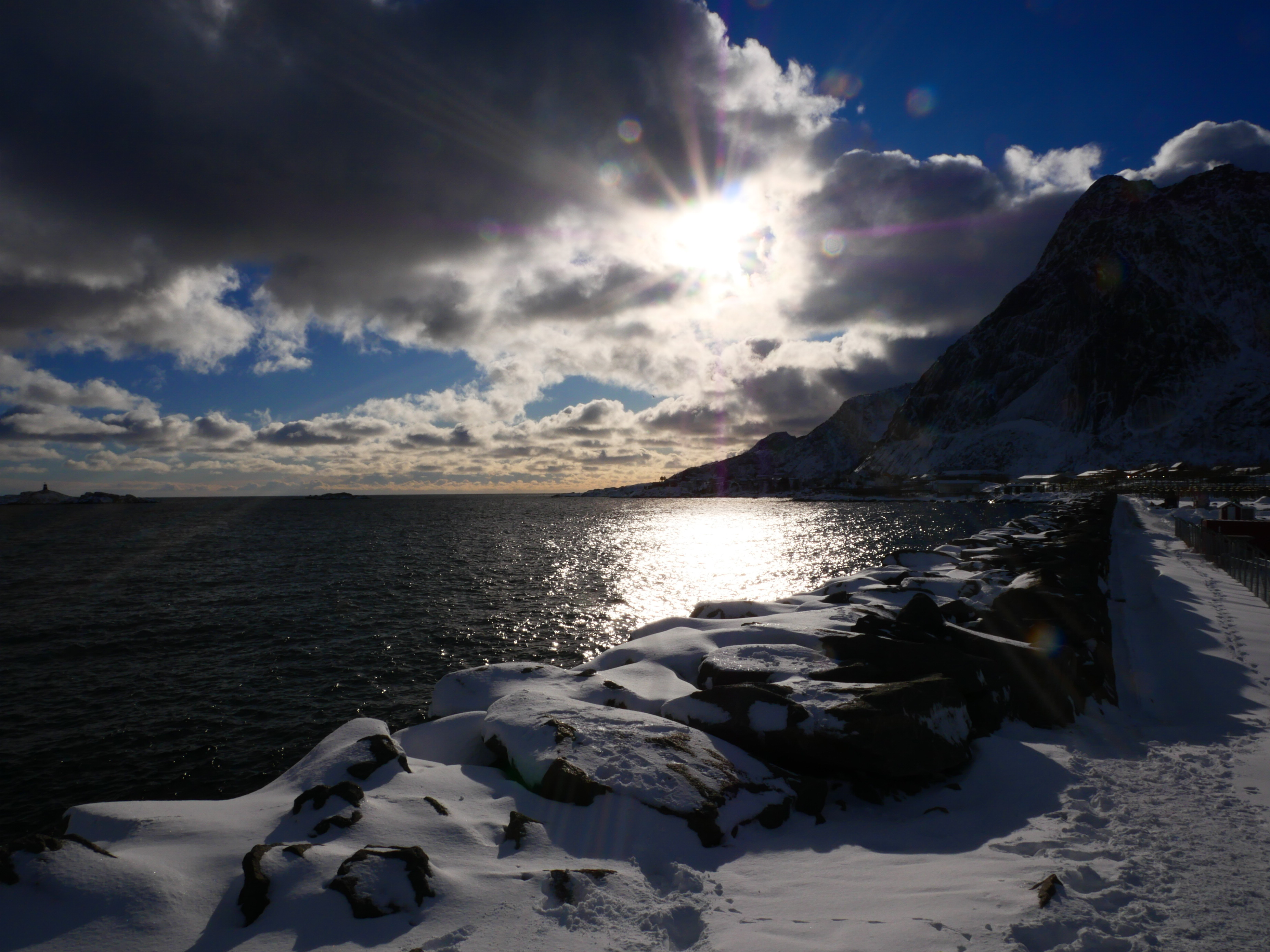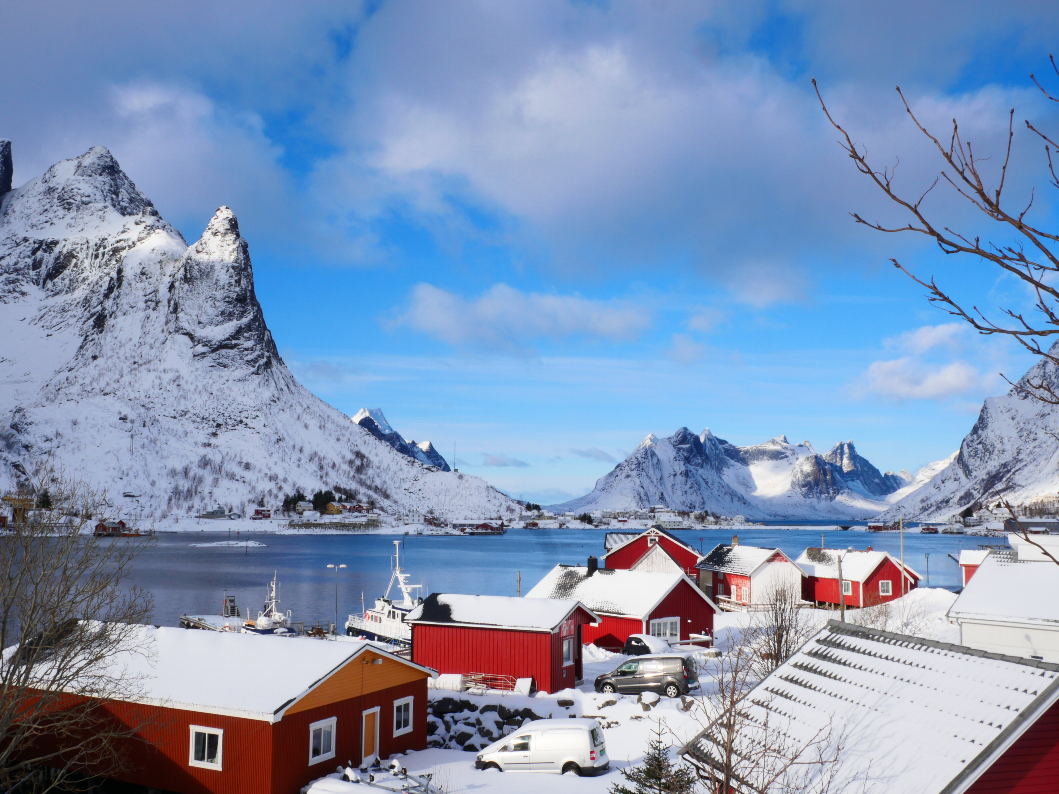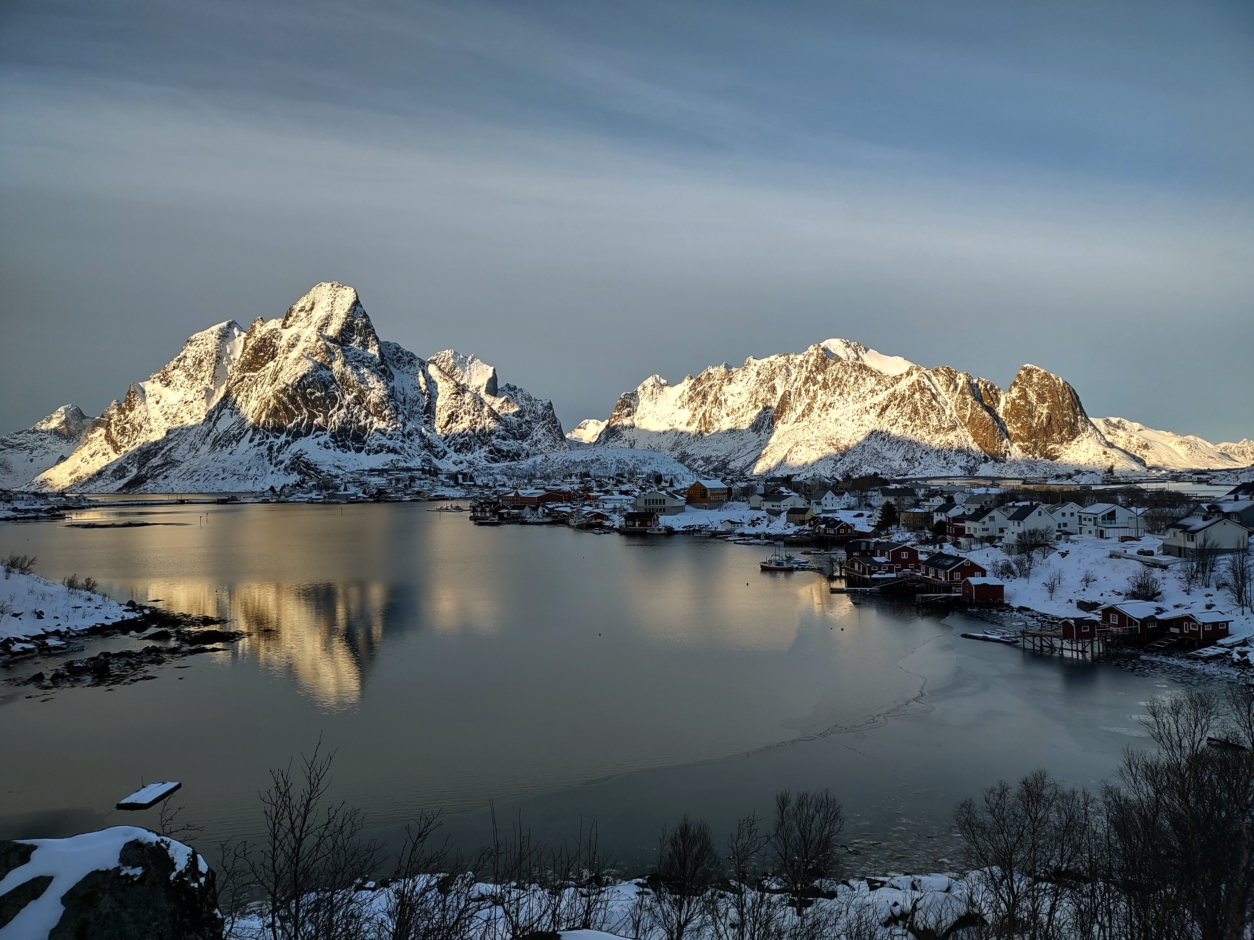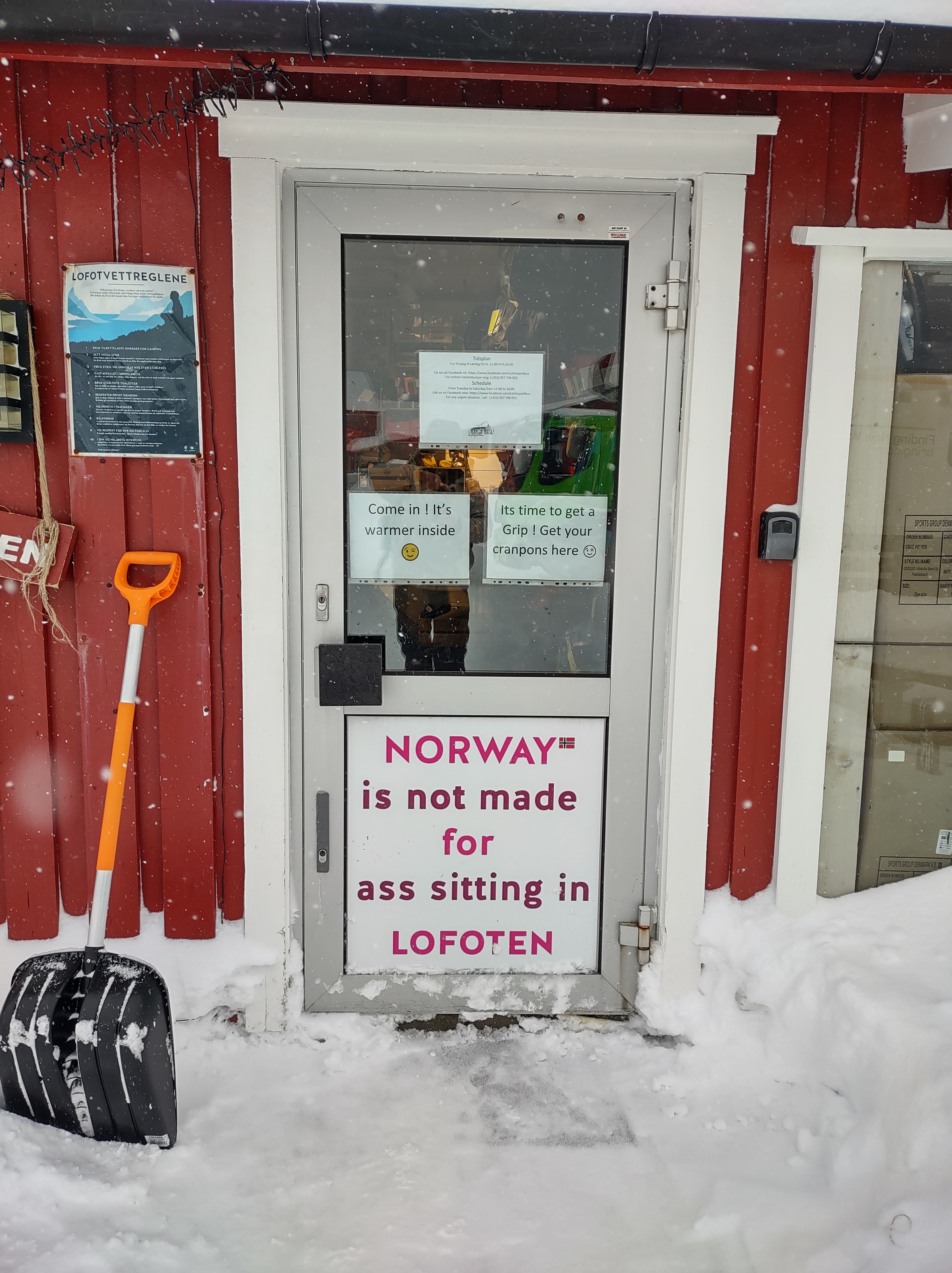 In Reine, we stayed in an amazing hostel (Catogarten) with warm sitting rooms (including one with a fireplace), an outdoor sauna and hot tub overlooking the bay, kayaking, daily yoga included (for Colleen, not Ritchard),and epic views in all directions. As we later learned, we got very lucky with the weather which was fairly clear and sunny for our first two days after which it returned to the norm – cold, windy, and snowy. We were kind of amazed to find that it was business as usual here with weather which would surely have locked down and immobilized the east coast of the U.S.