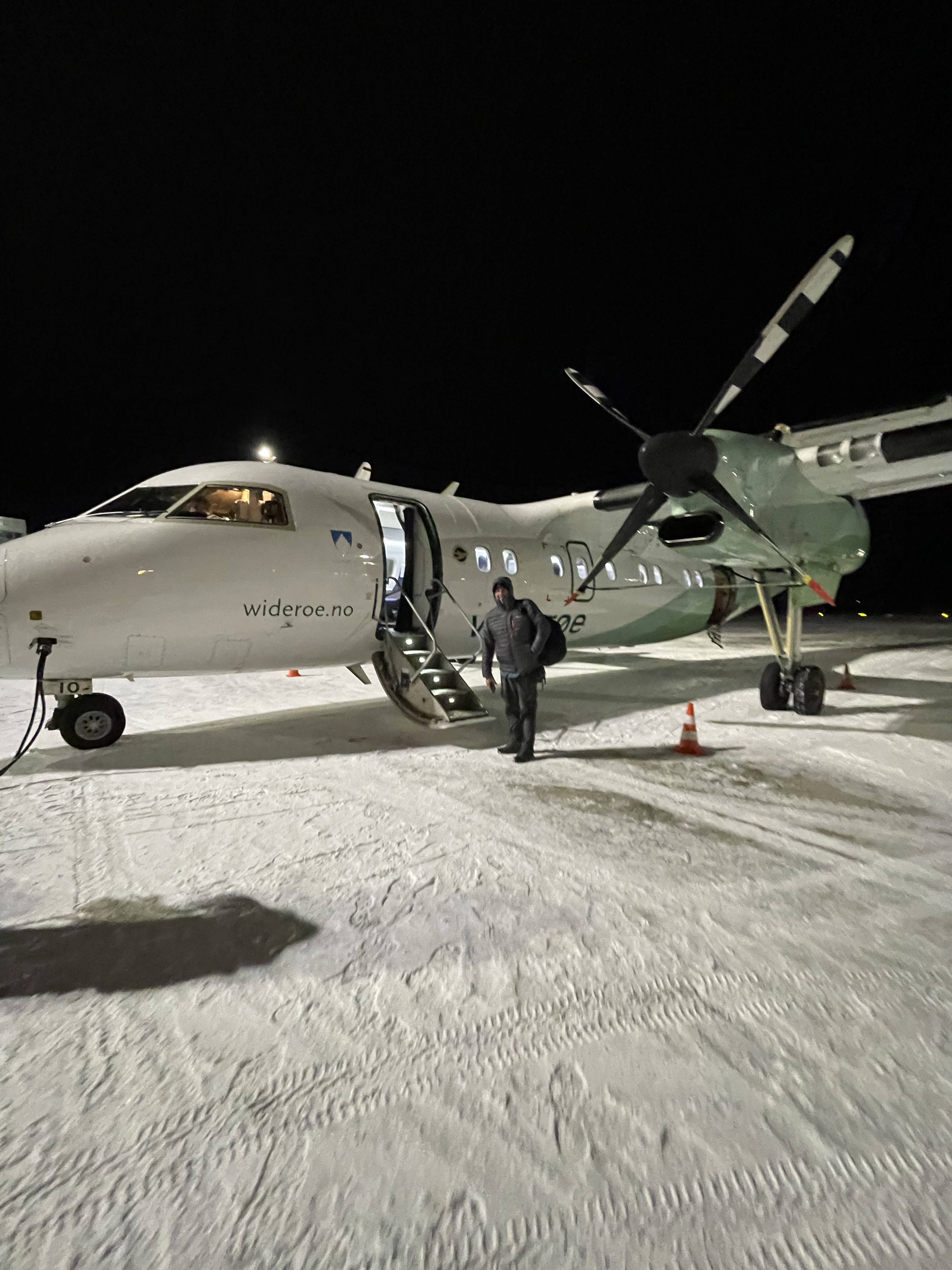 Getting there ended up being at least half the battle. Two stops from Amsterdam to a city called Bodo (pronounced kind of like “Buddha”) with the airport designation “BOO” (which still makes Colleen giggle). We had to overnight in Bodo (upper right photo below) and then took a 5 AM flight to Leknes and then a one-hour bus ride (after schlepping our luggage through the snow for about a mile from the airport to the bus station) south to the town of Reine our home for the next 4 days.