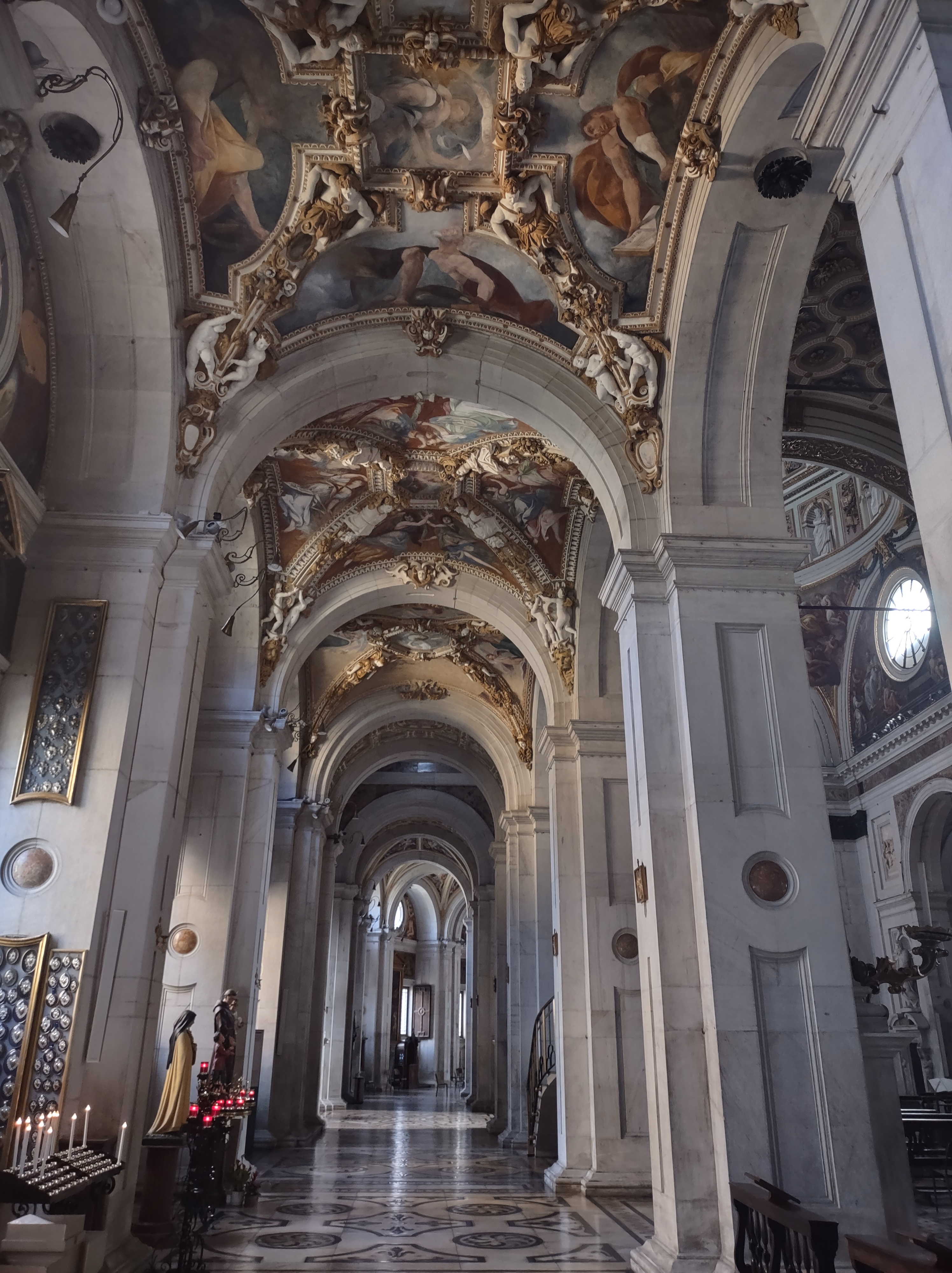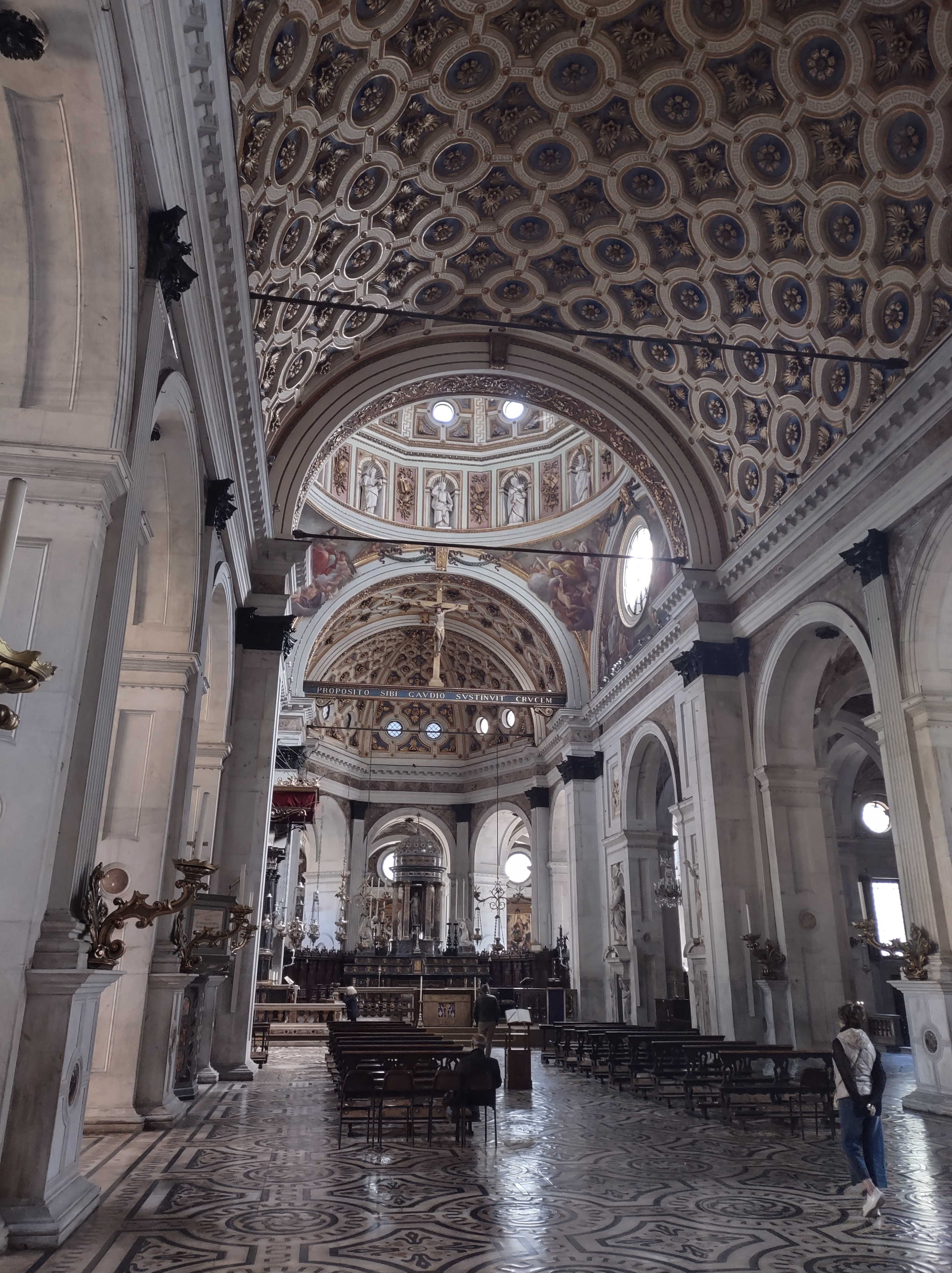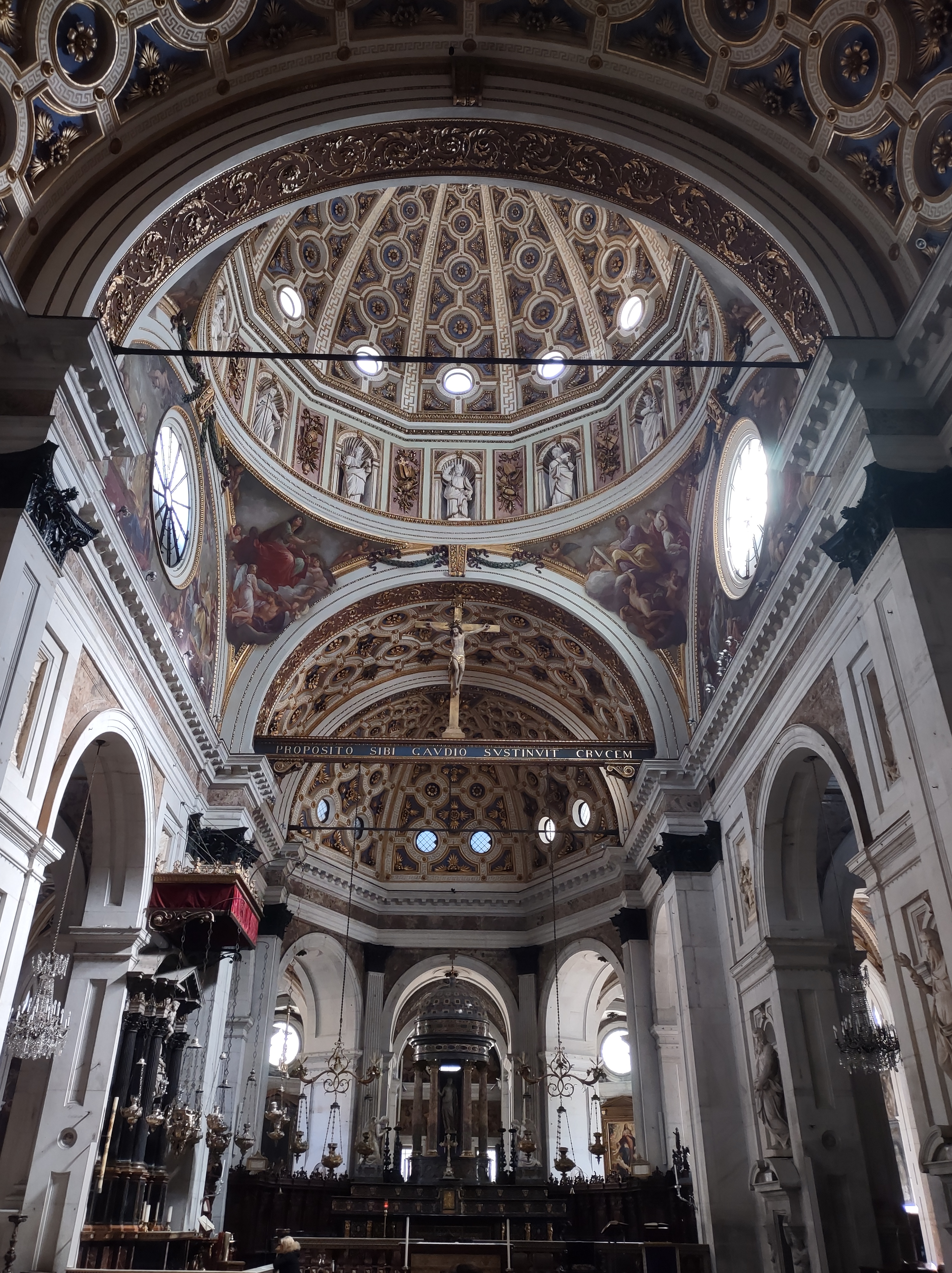 The original sanctuary of Santa Maria was begun in 1493 to house a miraculous icon of the Madonna (still on display today), and, as seems to be so typical here, its construction continued to evolve over the centuries.  In 1506, a beautiful barrel-vaulted naïve and two side aisles were added.  The sculptural plaster work of the vaults is unlike anything we have seen – incredibly sculptural!  In the late 16th century, a square arcaded portico was added as was a beautiful marble façade in the Mannerist style.  The end result is pretty exquisite.