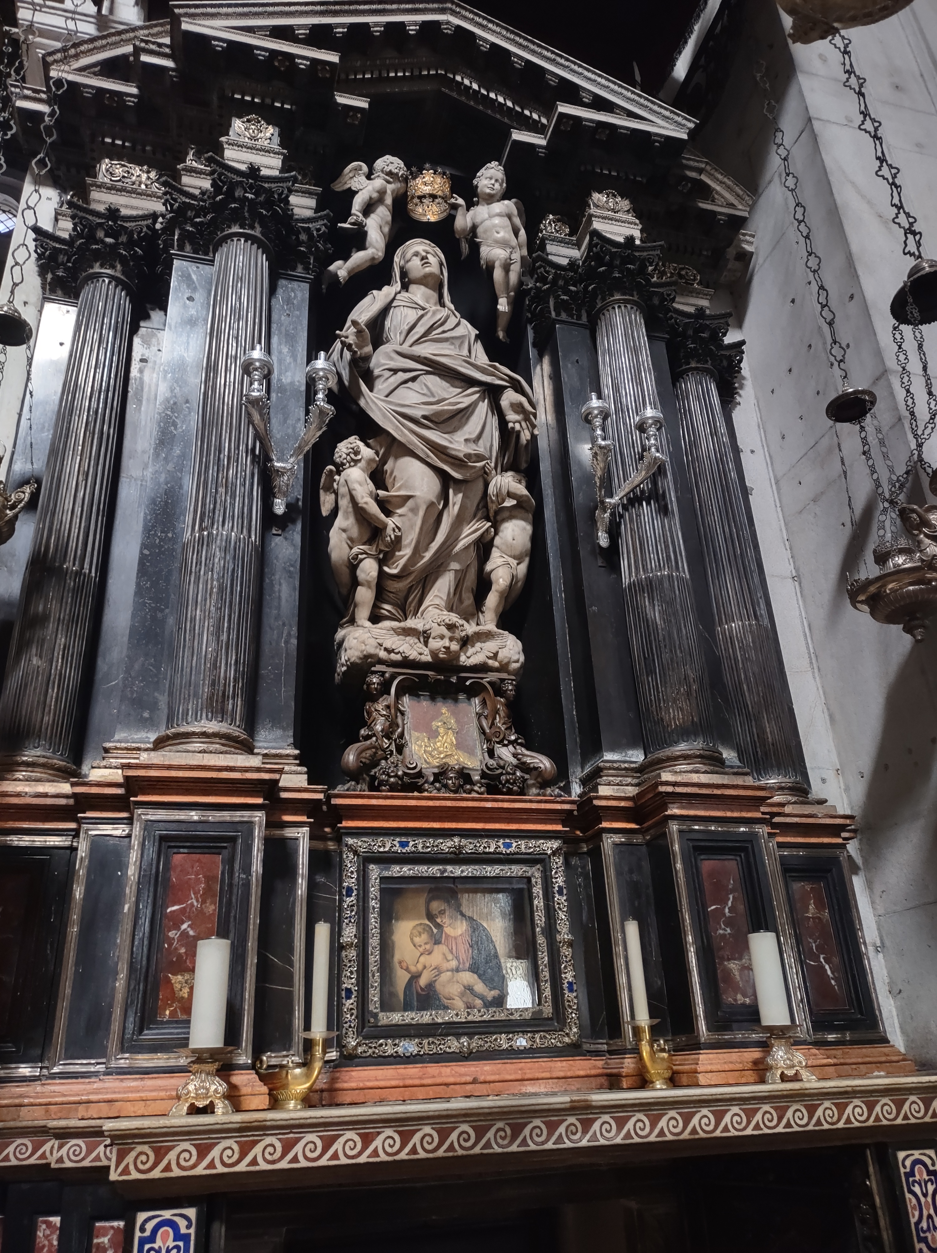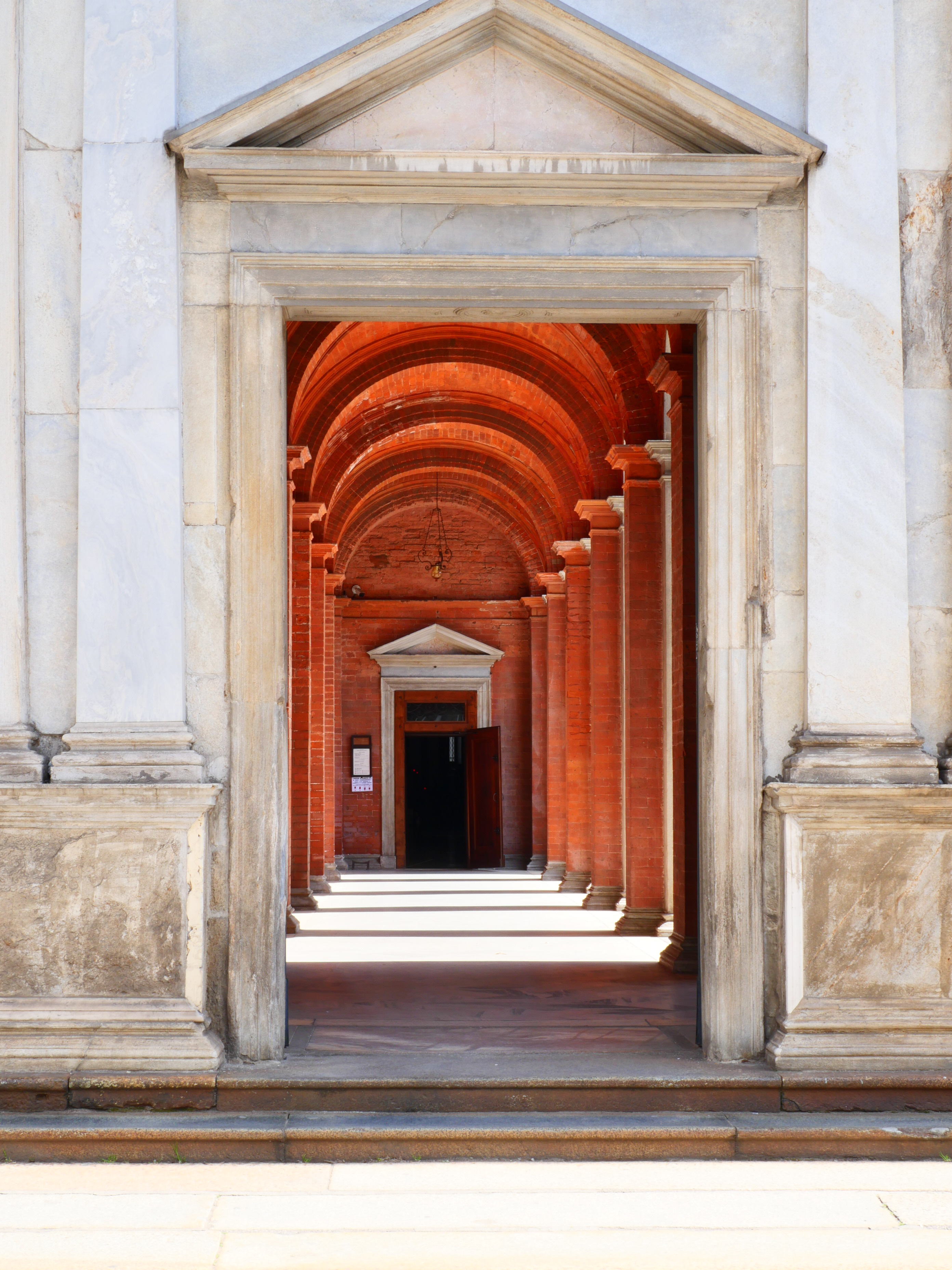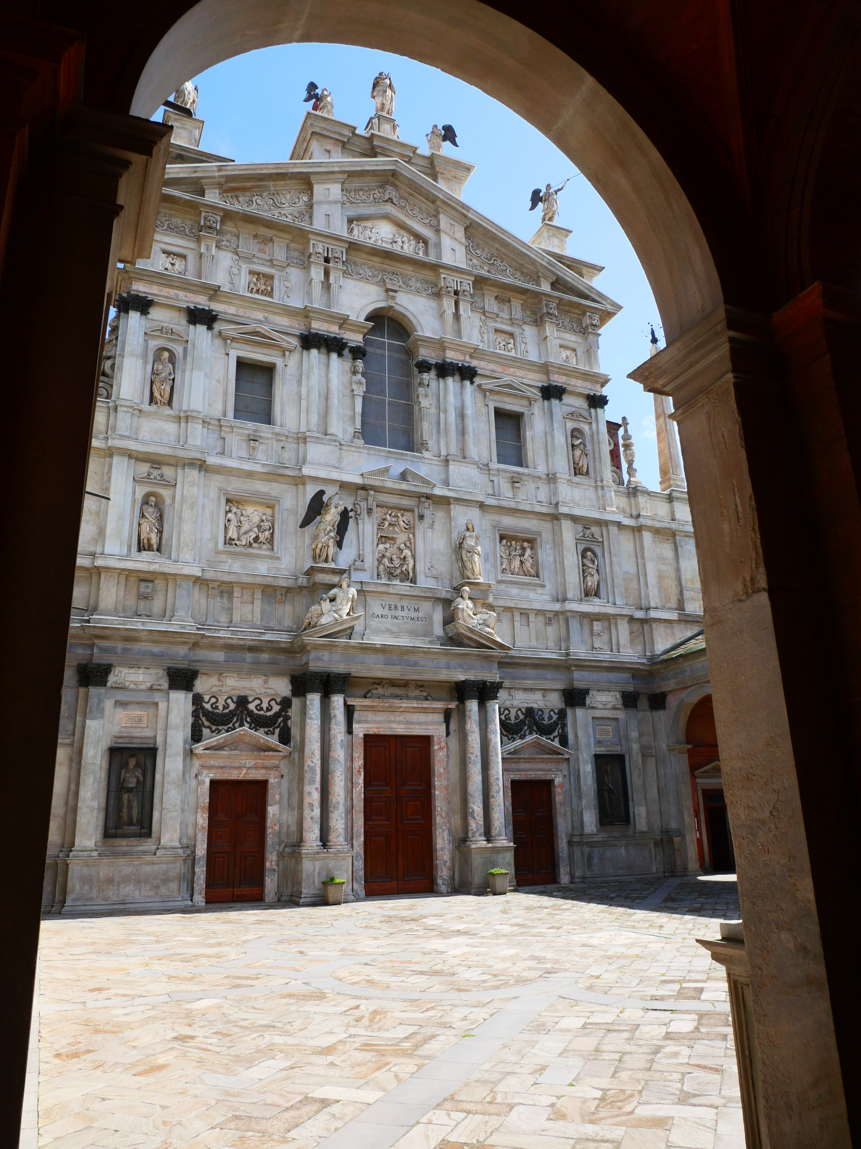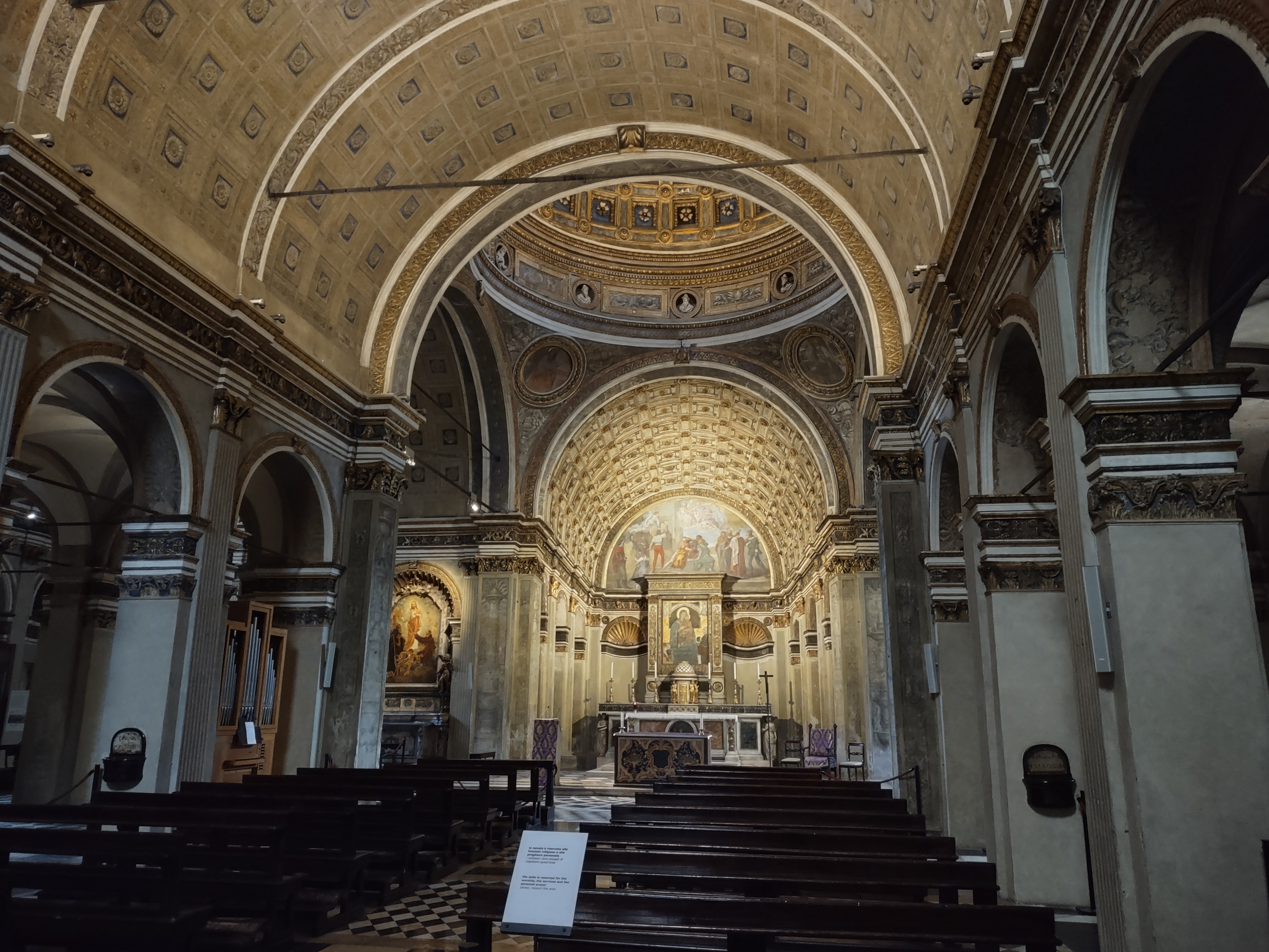 The original sanctuary of Santa Maria was begun in 1493 to house a miraculous icon of the Madonna (still on display today), and, as seems to be so typical here, its construction continued to evolve over the centuries.  In 1506, a beautiful barrel-vaulted naïve and two side aisles were added.  The sculptural plaster work of the vaults is unlike anything we have seen – incredibly sculptural!  In the late 16th century, a square arcaded portico was added as was a beautiful marble façade in the Mannerist style.  The end result is pretty exquisite.
