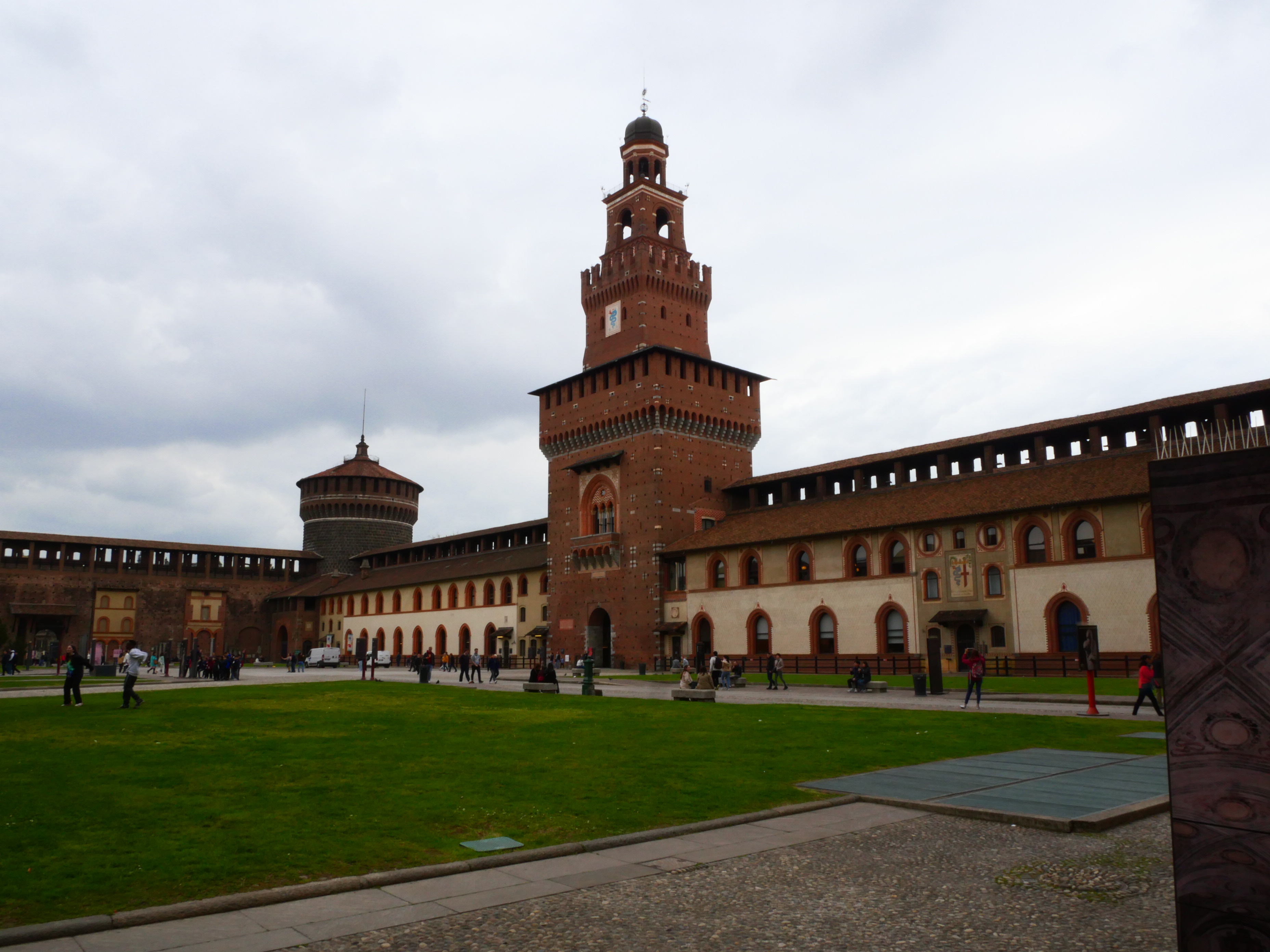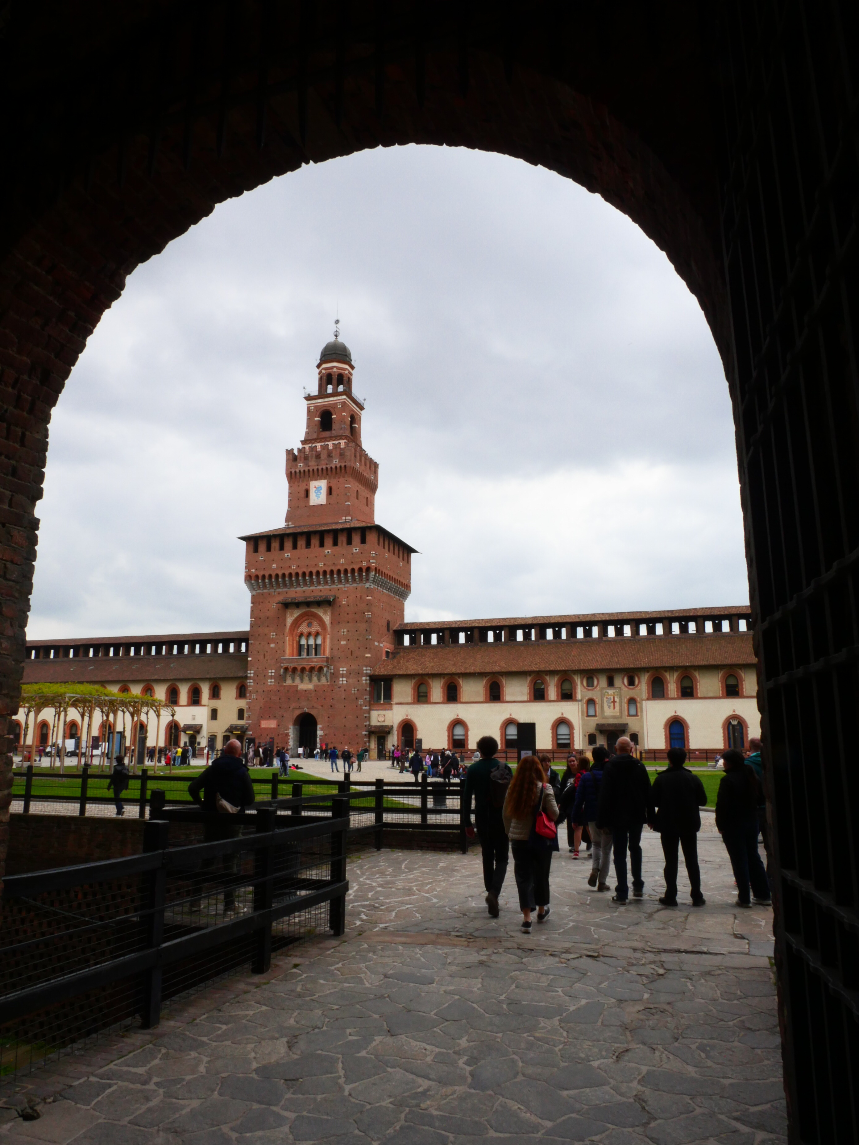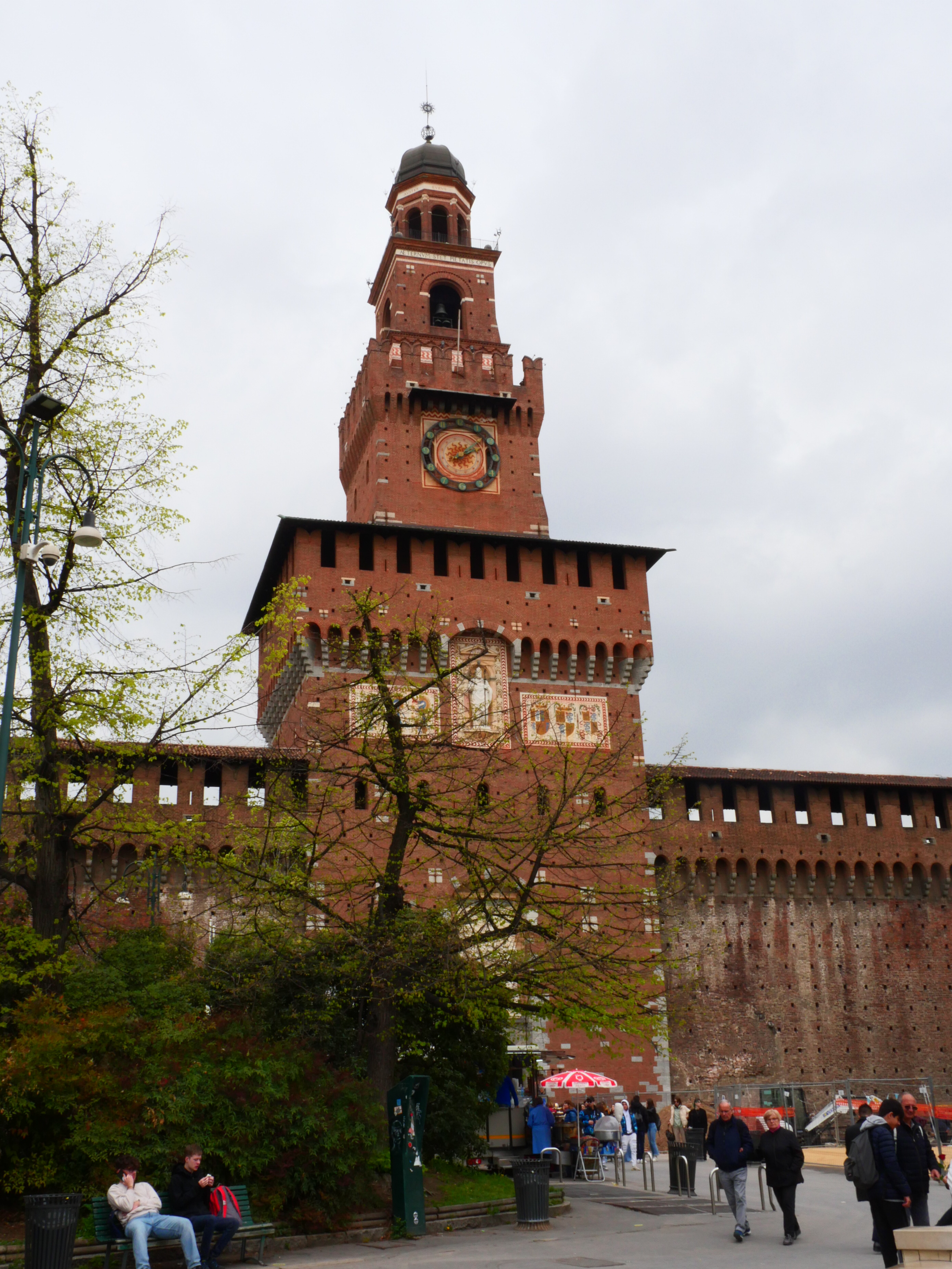 On our last day in Milan, we decided to visit another historic structure, the Castello Sforzesco, another one of those “Things to Do in Milan” places.  The Castello, which was built in the 15th century on the remains of an earlier fortification and enlarged in the 16th and 17th centuries, is one of the largest citadels in Europe.  While we actually came to the Castello for another reason, we found it (like so much of Milan) to be way over the top.  You want walls, they’ve got some big ones.  You want a moat and drawbridge, they’ve got one of those.  You want towers, they’ve got one that was built by a duke’s widow as a retreat and to allow her to keep an eye on her husband’s brother who she suspected had assassinated the duke.  Talk about historical intrigue!  All very cool and feudal.