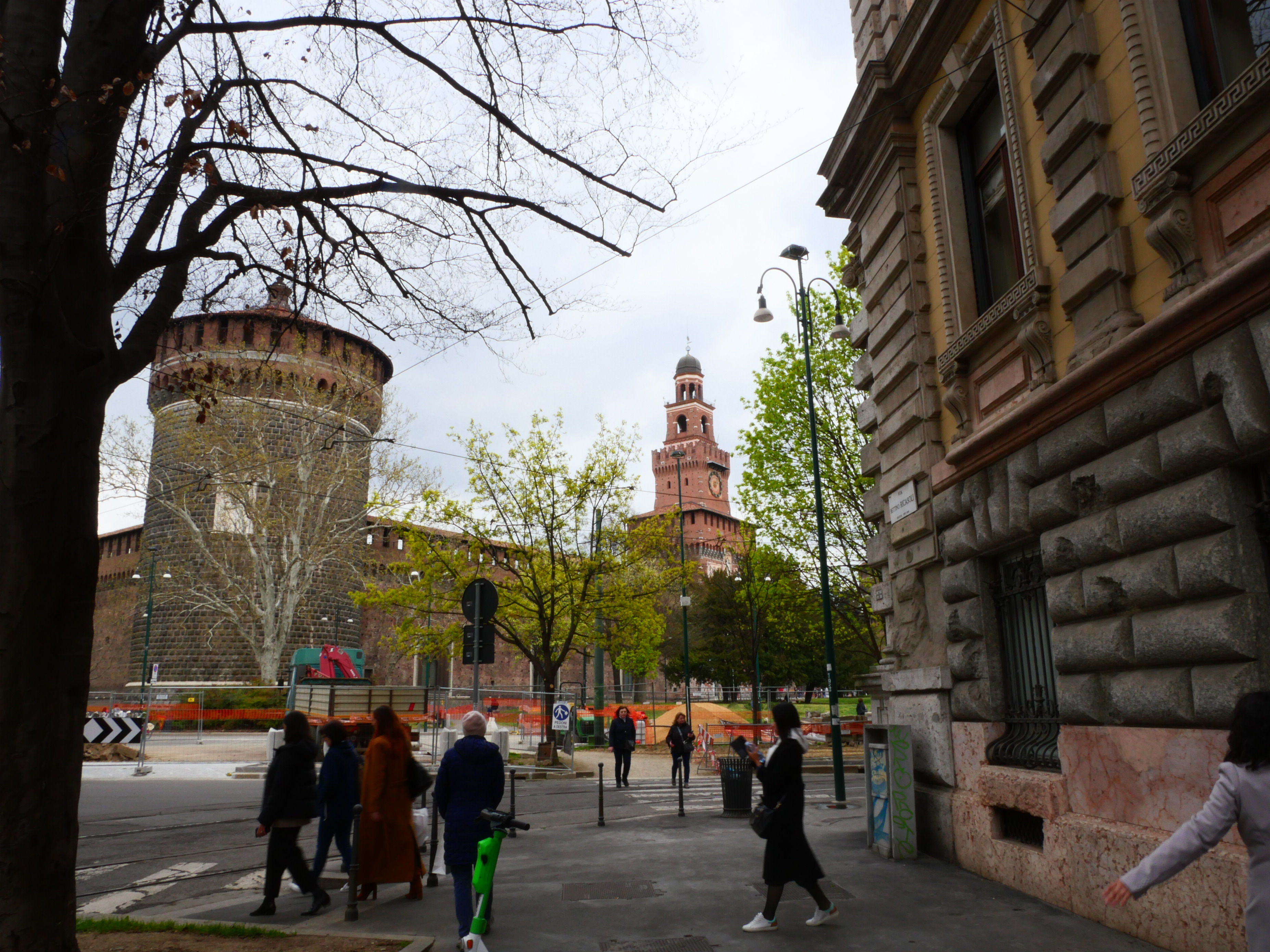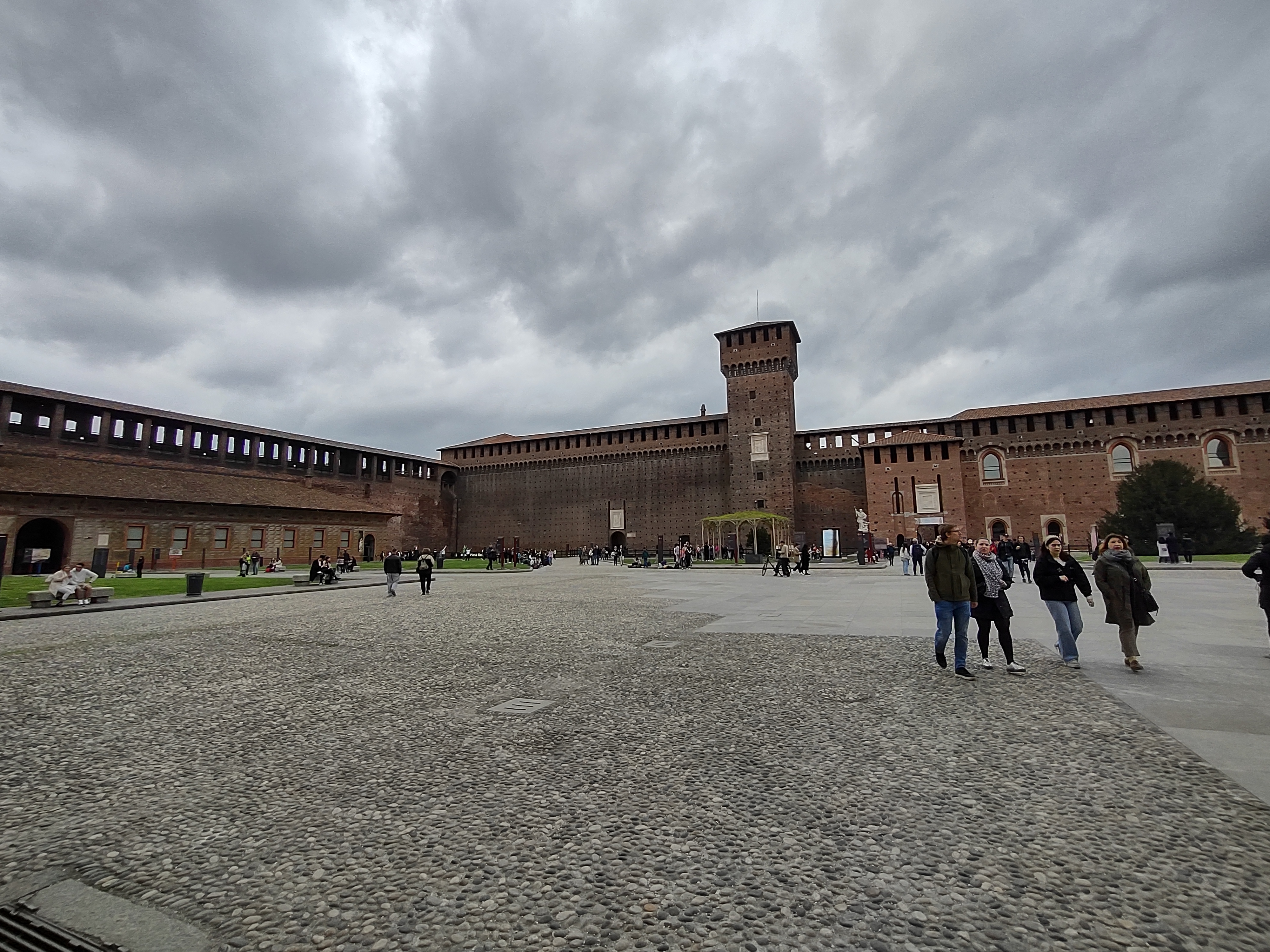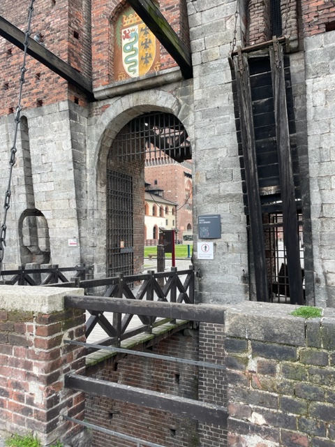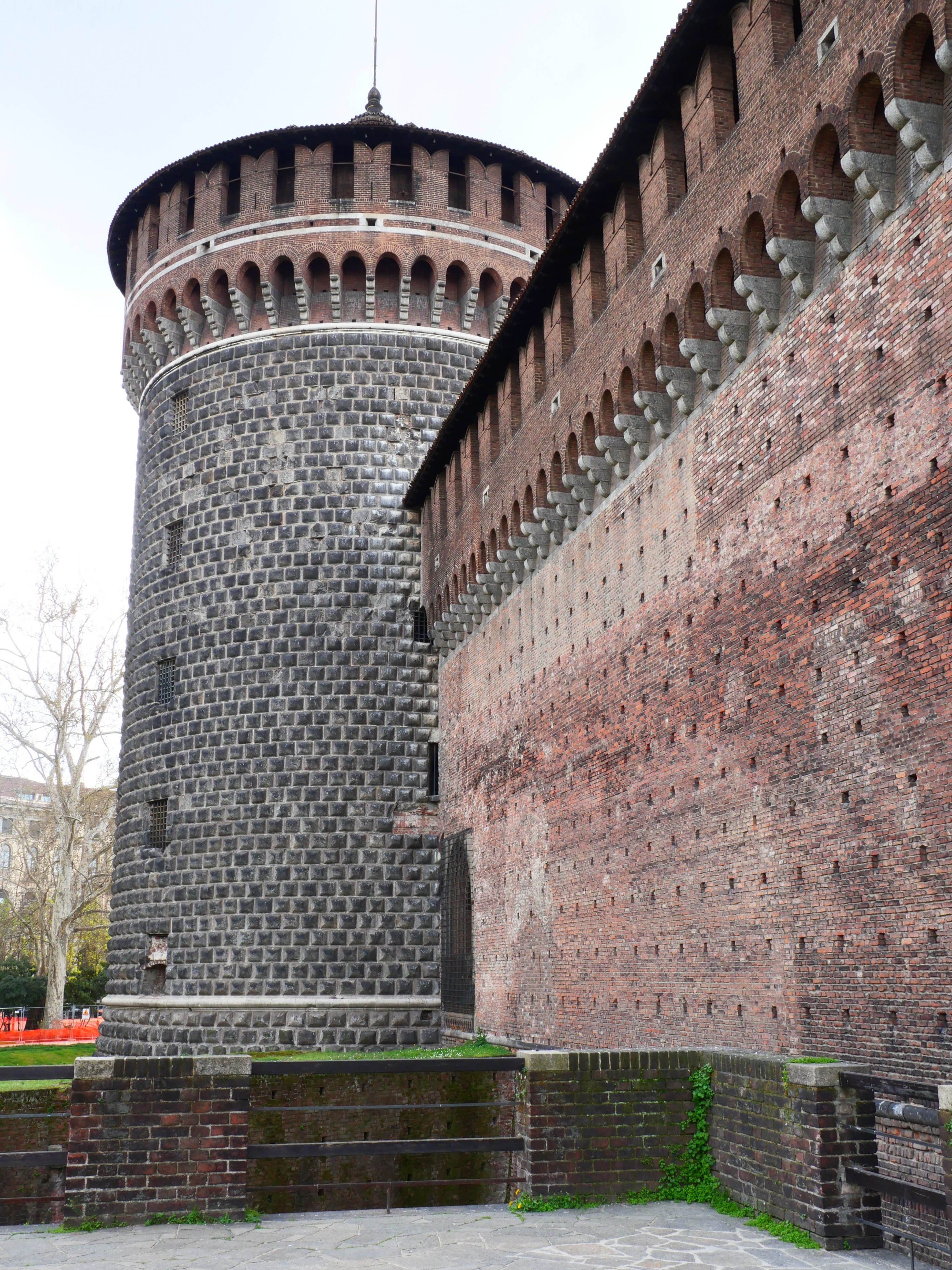 On our last day in Milan, we decided to visit another historic structure, the Castello Sforzesco, another one of those “Things to Do in Milan” places.  The Castello, which was built in the 15th century on the remains of an earlier fortification and enlarged in the 16th and 17th centuries, is one of the largest citadels in Europe.  While we actually came to the Castello for another reason, we found it (like so much of Milan) to be way over the top.  You want walls, they’ve got some big ones.  You want a moat and drawbridge, they’ve got one of those.  You want towers, they’ve got one that was built by a duke’s widow as a retreat and to allow her to keep an eye on her husband’s brother who she suspected had assassinated the duke.  Talk about historical intrigue!  All very cool and feudal.