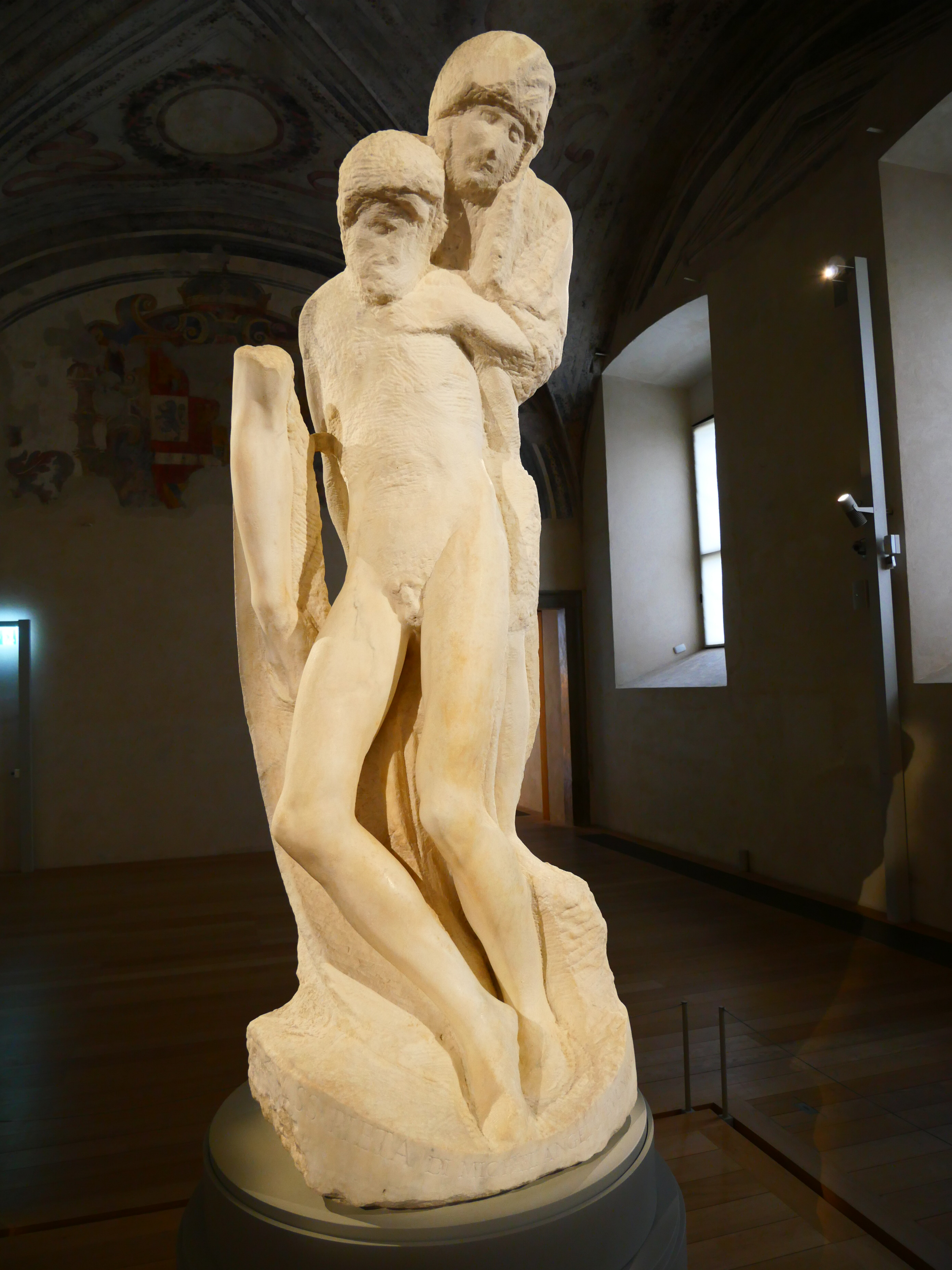 But, what we had actually come here to see is a relatively unknown work by Michelangelo.  The theme of the Pieta (meaning pity) is one that many artists have worked with and originally it tended to be a tableau of many characters around the body of the crucified Jesus.  Over the course of his career, Michelangelo made several efforts at creating Pietas, and it is his interpretation, with just Mary and the body of Jesus, which most people have come to associate with the name. The most well-known of these being the one in Saint Peters Basilica in Vatican City.  As it turns out, there is another Michelangelo Pieta which is housed in a small museum in Castello Sforzesco.