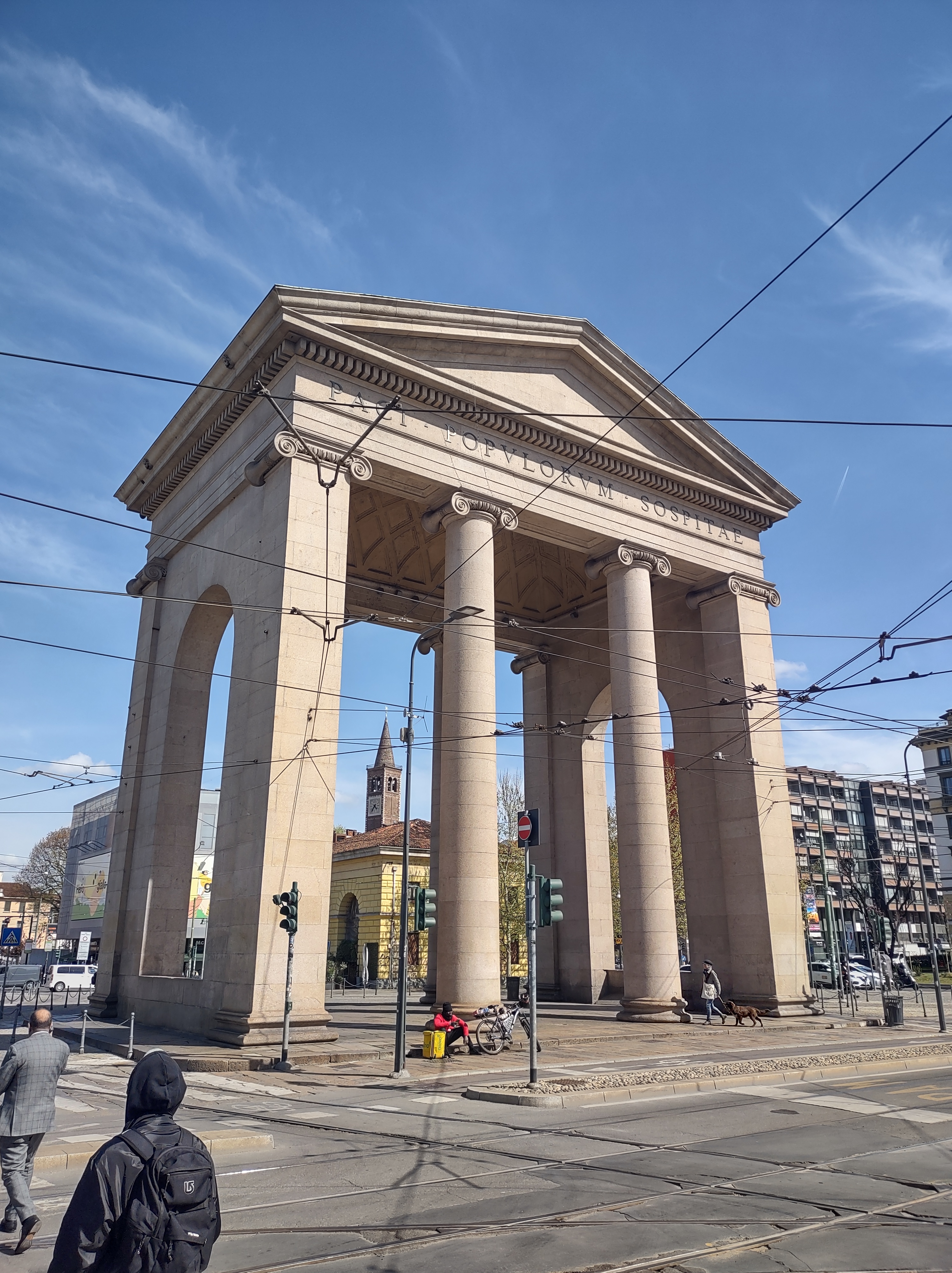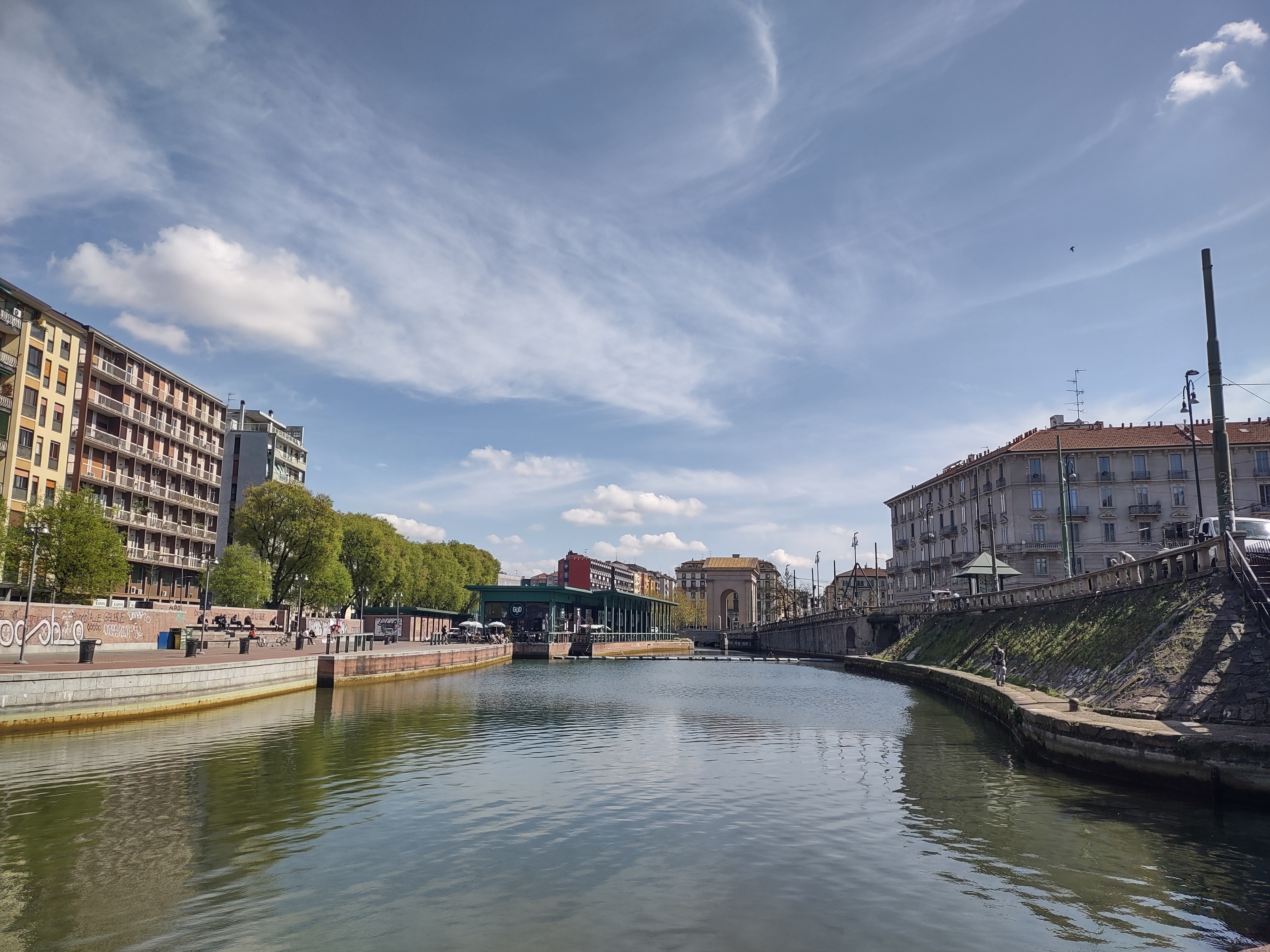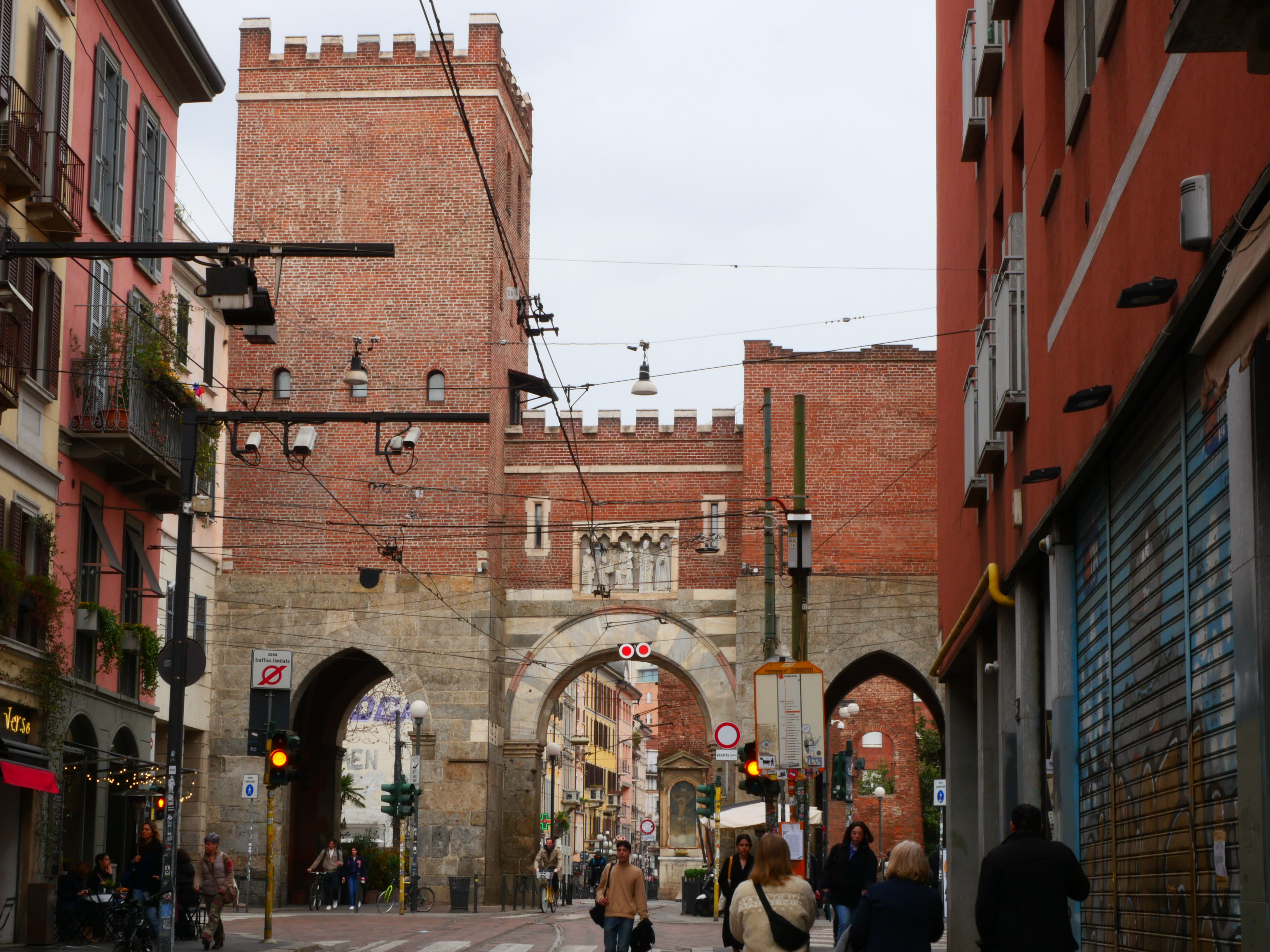 Two canals remain in the neighborhood of Navigli, which adjoins Ticinese to the west: the Naviglio Grande and the Naviglio Pavese, both of which flow into a large basin known as the Darsena (meaning “dock” or “shipyard”).  The Darsena adjoins a plaza containing the Arco di Porta Ticinese, a neoclassical arch, one of two surviving gates into the old city, which is now a ceremonial entrance to the city through Ticinese.