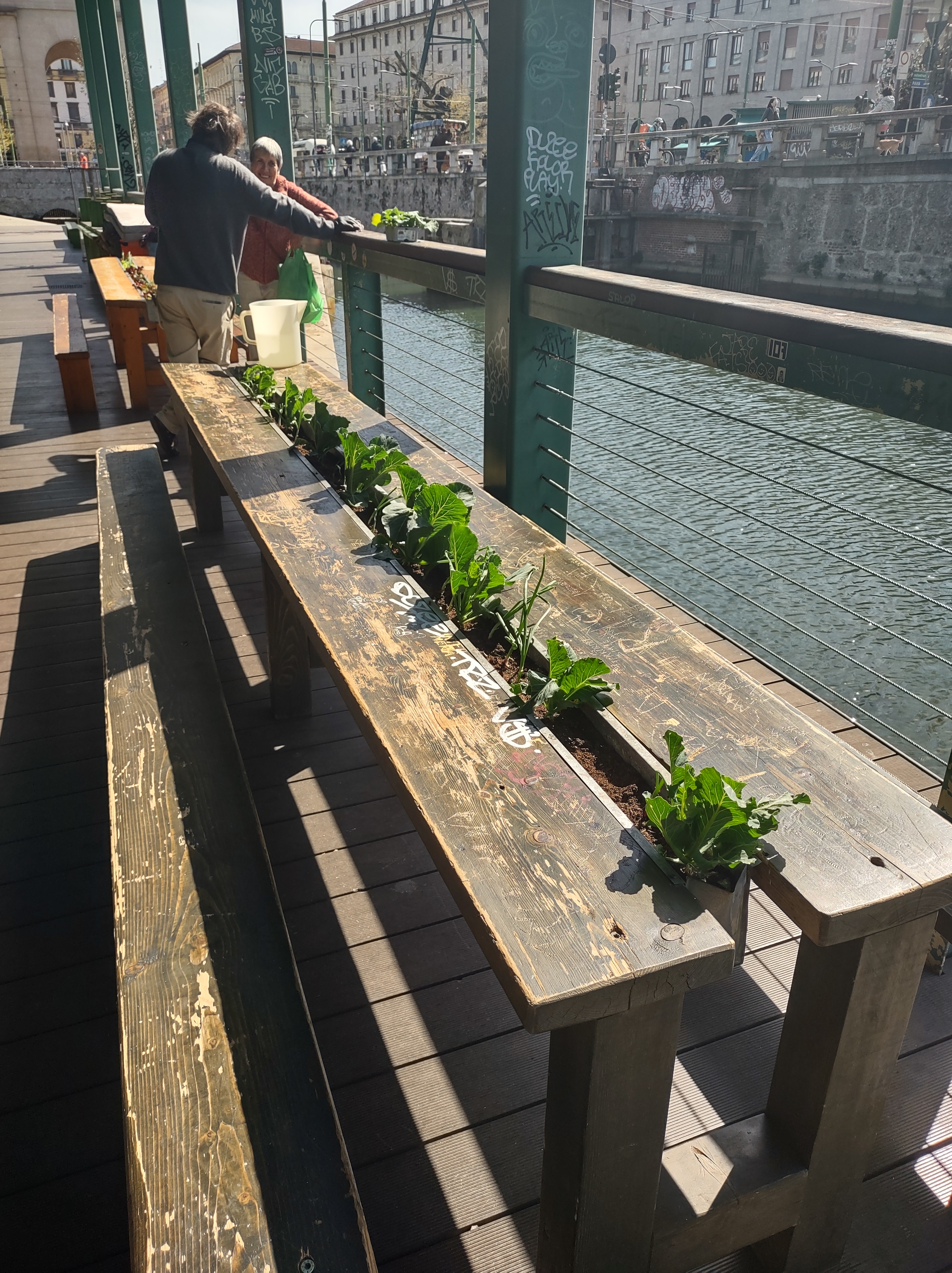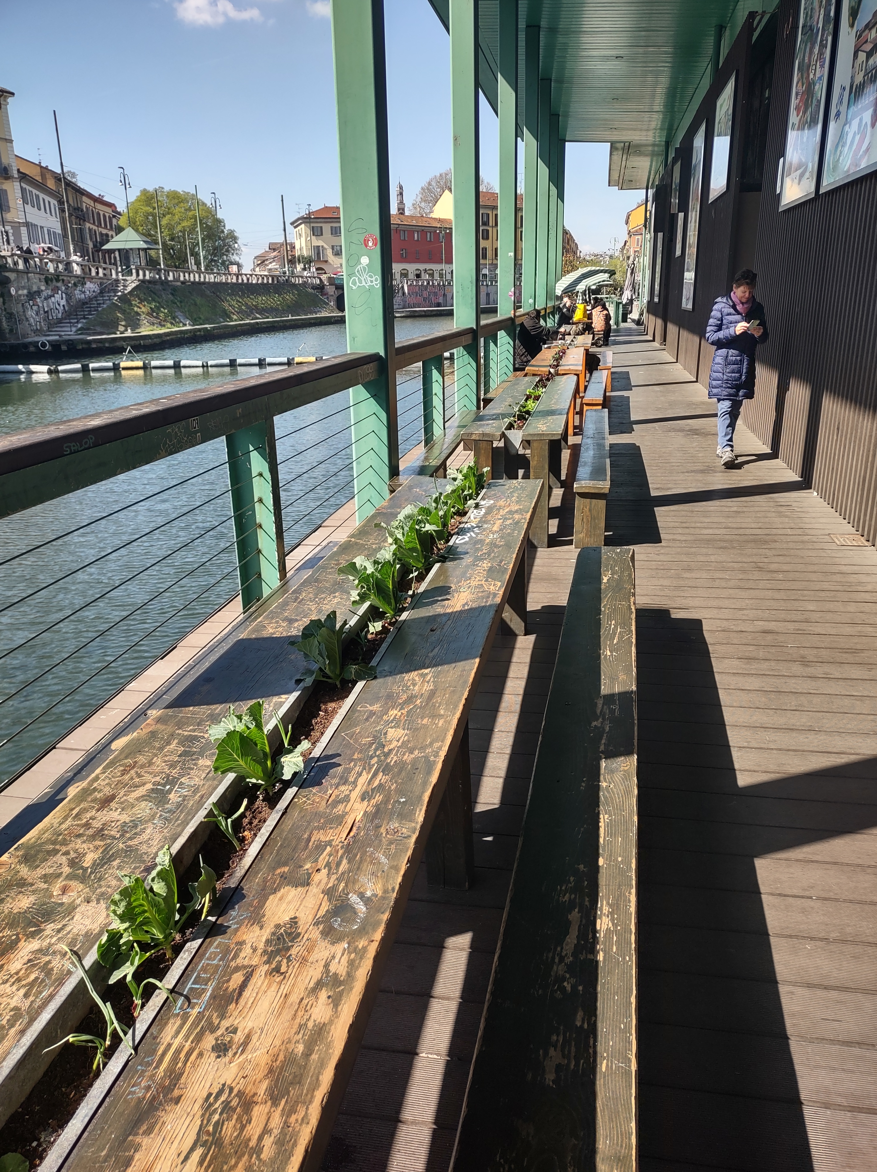 The area around the Darsena has been developed in recent years with pedestrian plazas and walkways and a large market with shops and restaurants.  We grabbed a coffee there and discovered waterside tables overlooking the Darsena, each with a center planting strip where a restaurant in the market grows lettuce and scallions. (Pretty cool!)  We noted after the fact that Navigli does pop up in “Things to Do in Milan” but, whether it is the distance from the City Center or it was just the time of year, we enjoyed the fact that most of the people strolling these canals appeared to be natives rather than tourists.