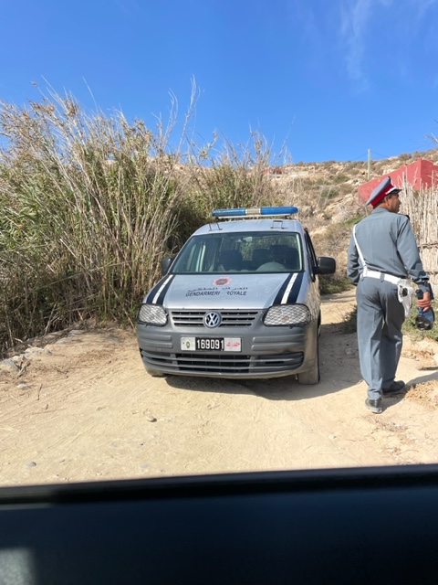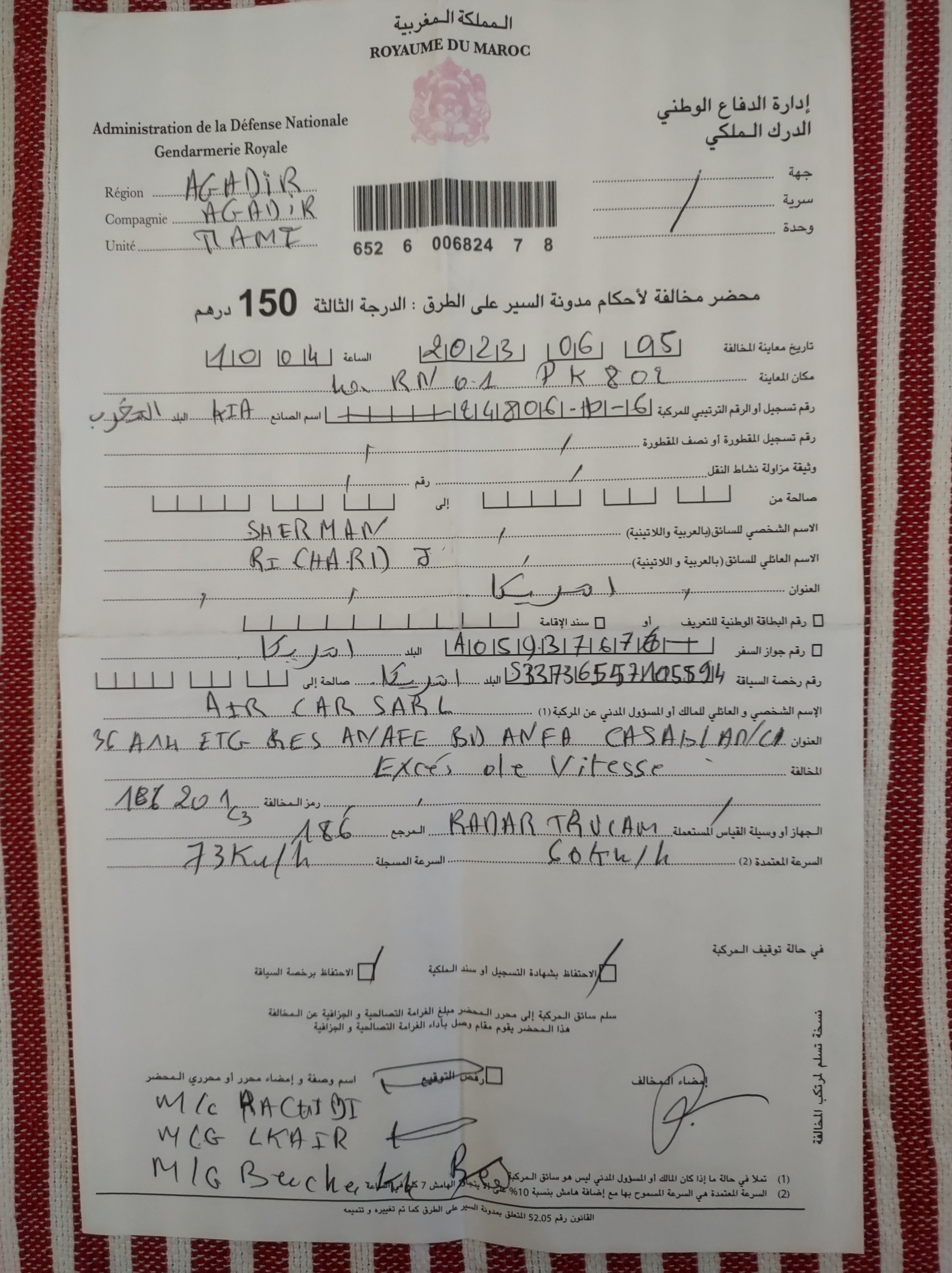 One of the things we had heard about from several sources was that it was very common for the Moroccan police to set up check points along the road and to flag down cars to check your papers. We were also told that this is very common, not a big deal, but that there was the possibility of a “fine” if everything wasn’t in order. On our way to and from Sidni Ifni, we probably saw 10 or 15 of these checkpoints, but were never stopped until this last day. About 70 kilometers south of Essaouira, just outside of a small town called Tamanar, we came out of stretch of winding turns to find a checkpoint and were waved down and asked to stop. The police very quickly and politely checked our paperwork and sent us on our way but, as we approached Tamanar, another police car came up behind us with its lights flashing and pulled us over. We were advised that we had been speeding (73 km in a 60km zone) and that the fine would be 150 dirham ($15). We produced our paperwork again, paid the fine, and Ritchard added a Moroccan speeding ticket to his collection. Not really any big deal, but we couldn’t help but wonder whether we hadn’t be “profiled” as tourists at the first stop. We’ll never know…