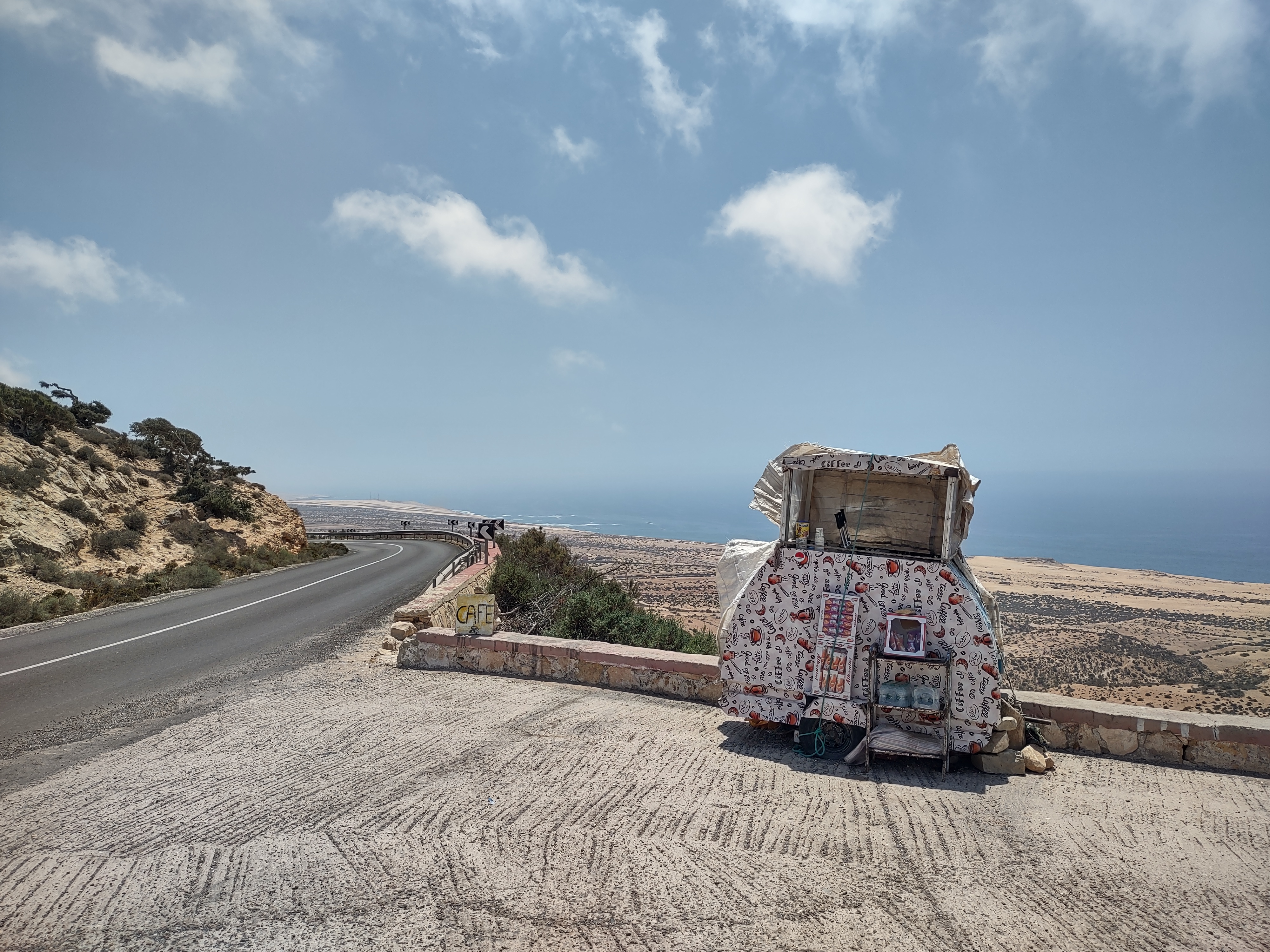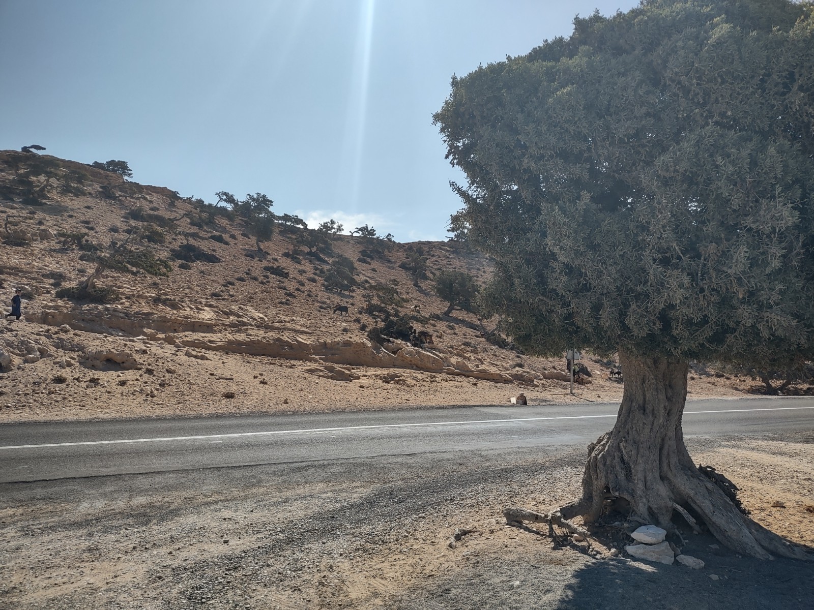 At the point where the coast road turned inland, near a small town called Gourizim, we stopped for coffee and what might be our last look at the Atlantic Ocean for awhile. It was a spot we had stopped at on the way down where there is a small mobile stand selling coffee and tea pretty much in the middle of nowhere (but with a million dollar view). While we waited for our coffee I noted another phenomenon we had heard about but had yet to see (in Morocco at least). We had been told that we might see goats in trees and sure enough, across the road there was a small herd of goats and a few of them had climbed (or were climbing) into some small argan trees to eat the nuts. Apparently this is a real thing but sometimes it is staged for the benefit of tourists which we had seen in our travels in Turkey when we came upon a tree with something like 20 goats standing on wooden perches in a tree. In this case, it looked pretty authentic as we actually saw some of the goats climbing into the trees showing some of the nimbleness that their mountain cousins are known for.