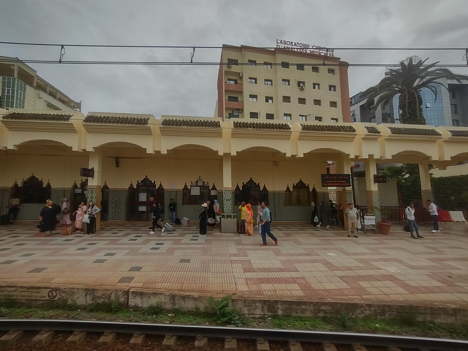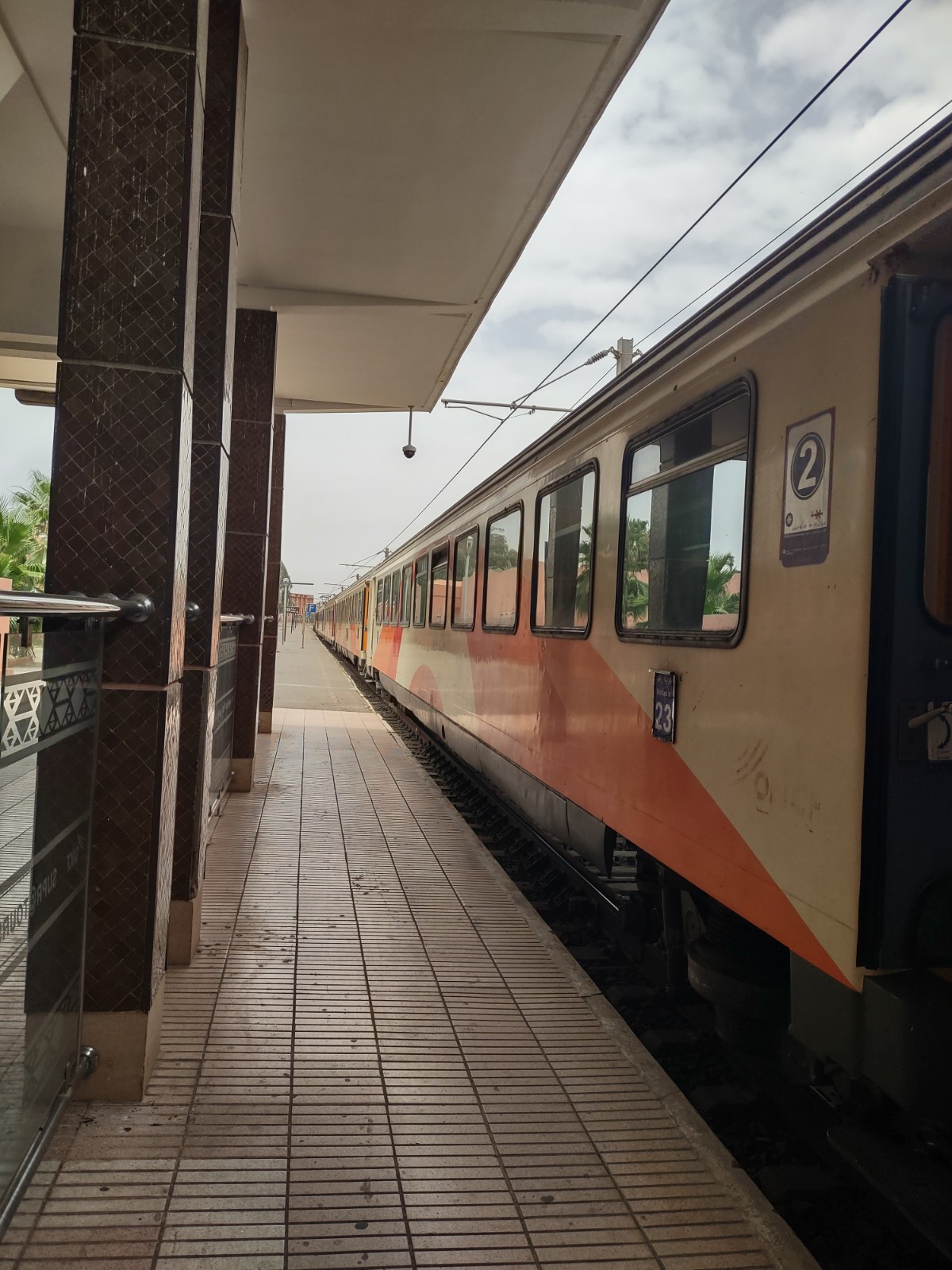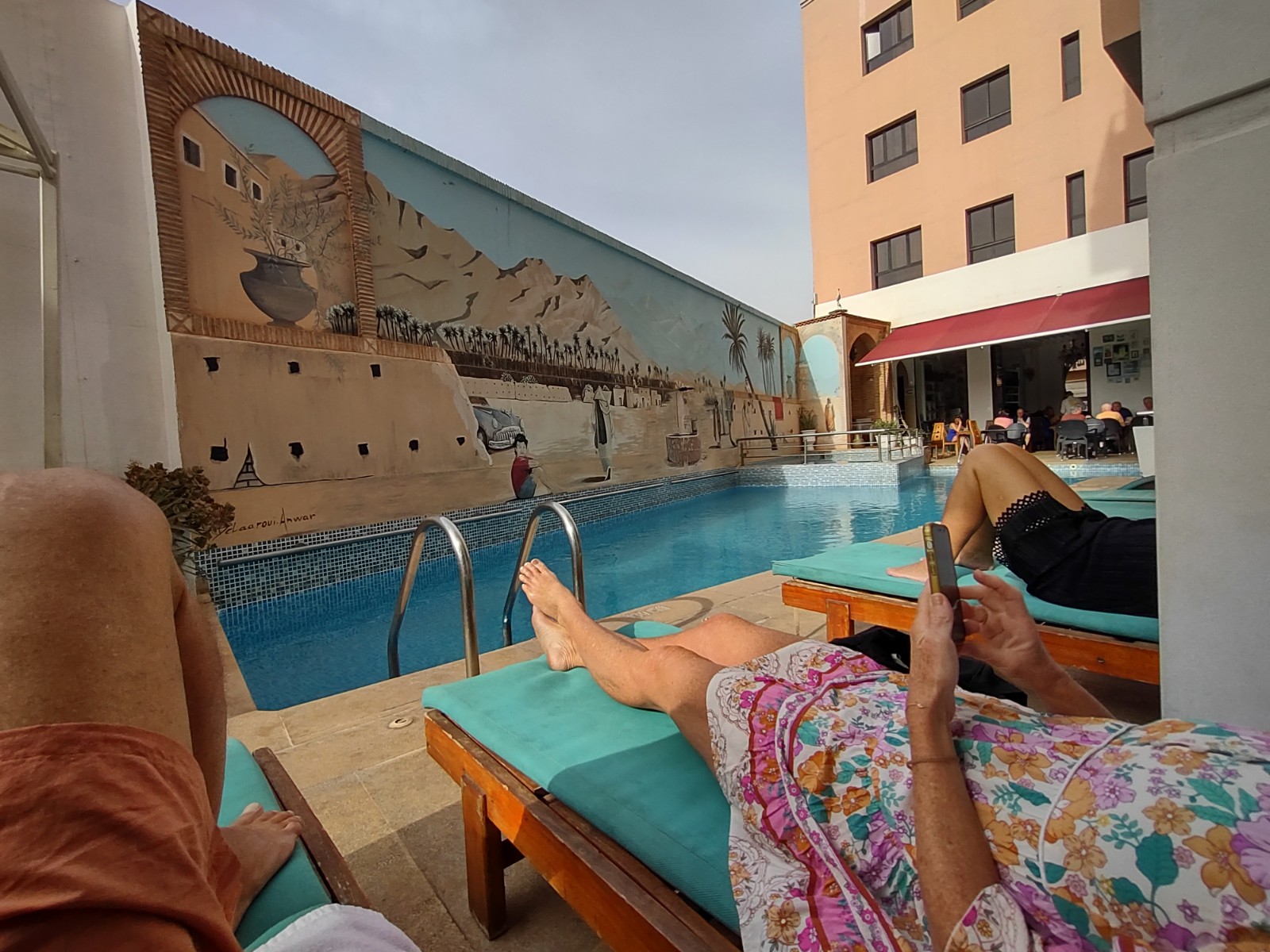 The next morning we had a great buffet breakfast at the hotel (included in the $43/night rate) and, as the hotel had a late check-out time and our train didn’t leave until the afternoon, we hung out at the hotel pool for a couple of hours after breakfast where we were (of course) eventually joined by the Real Housewives who, thankfully, appeared hung over and didn’t do much but sleep. After a bit of relaxing by the pool, we packed up and headed off to the train station which brought back some great memories from when we were here in 2011 with our kids catching the Marrakesh Express to Tangier.