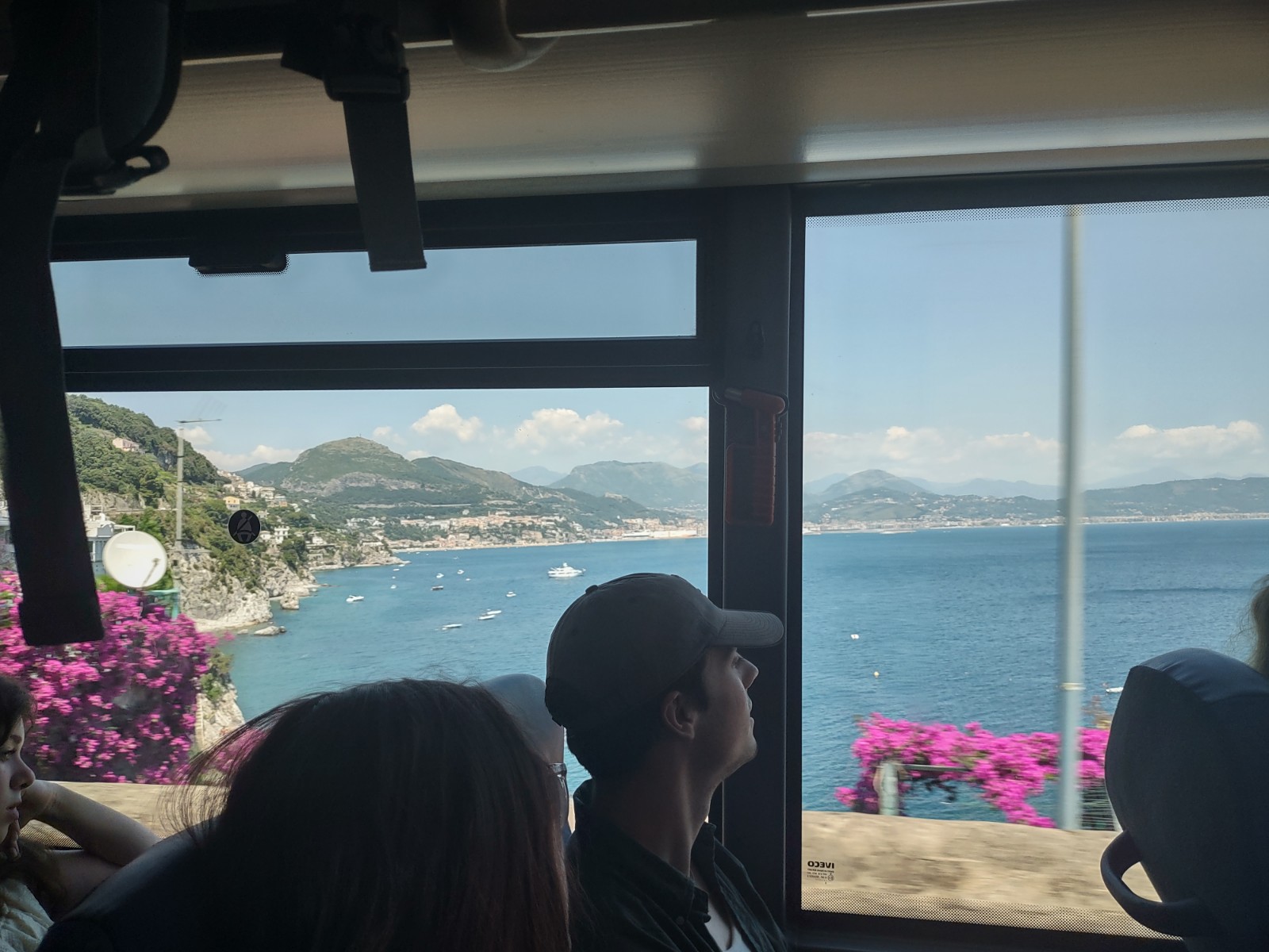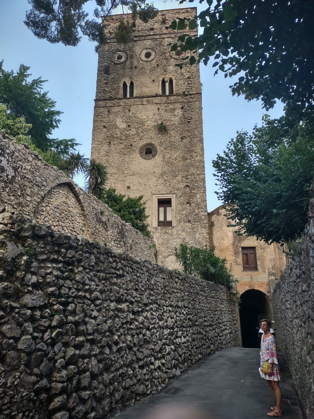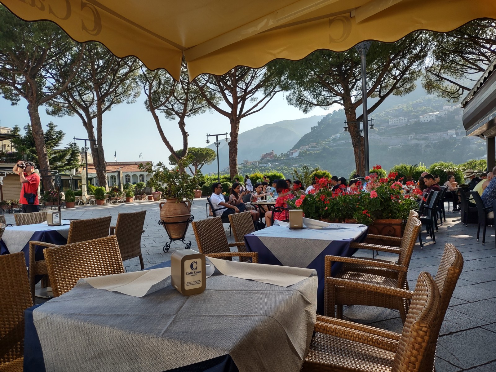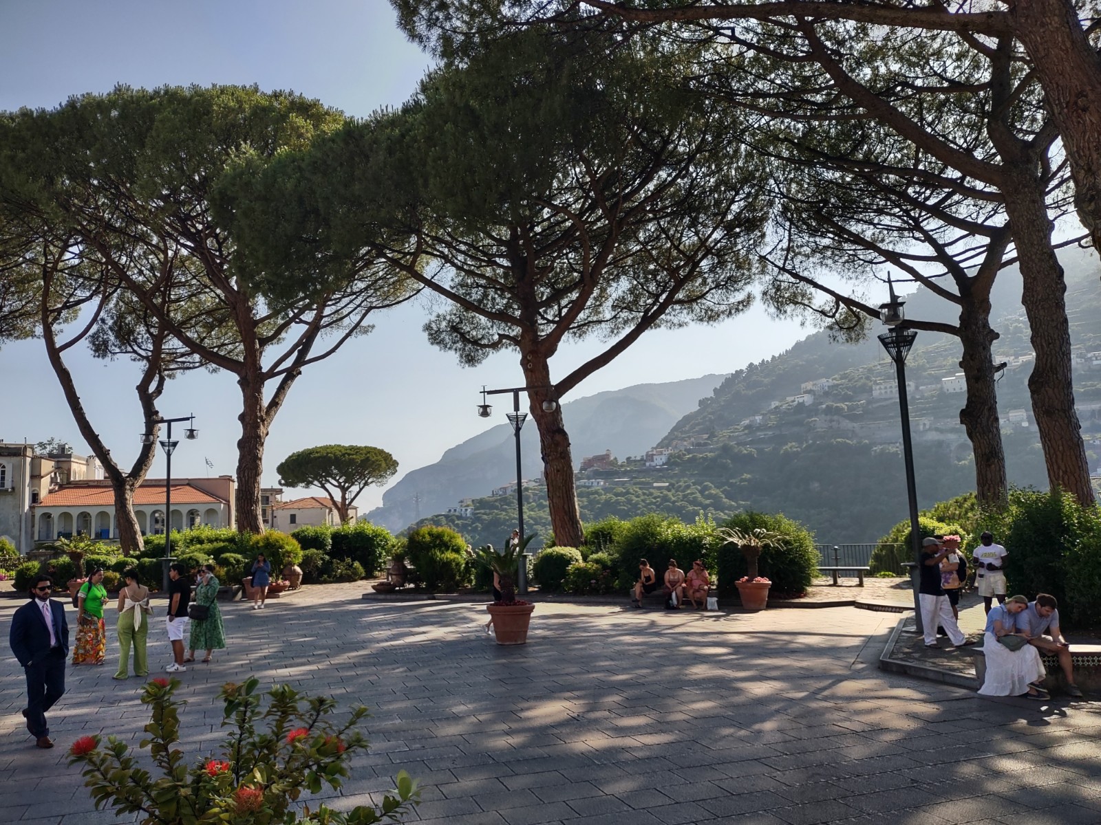 With a little more investigation and negotiation, Colleen found a driver who would take us to Ravello for 30 Euros but we would need to wait until he had a few more riders. We sat in the shade, sipped water, and watched the chaos ebb and flow around us, and eventually our driver announced it was time to go. As we climbed into the taxi van, a fellow traveler in the front passenger seat turned and announced “Welcome to the get me the hell out of here express!” which I think pretty closely echoed our sentiments at that point.
