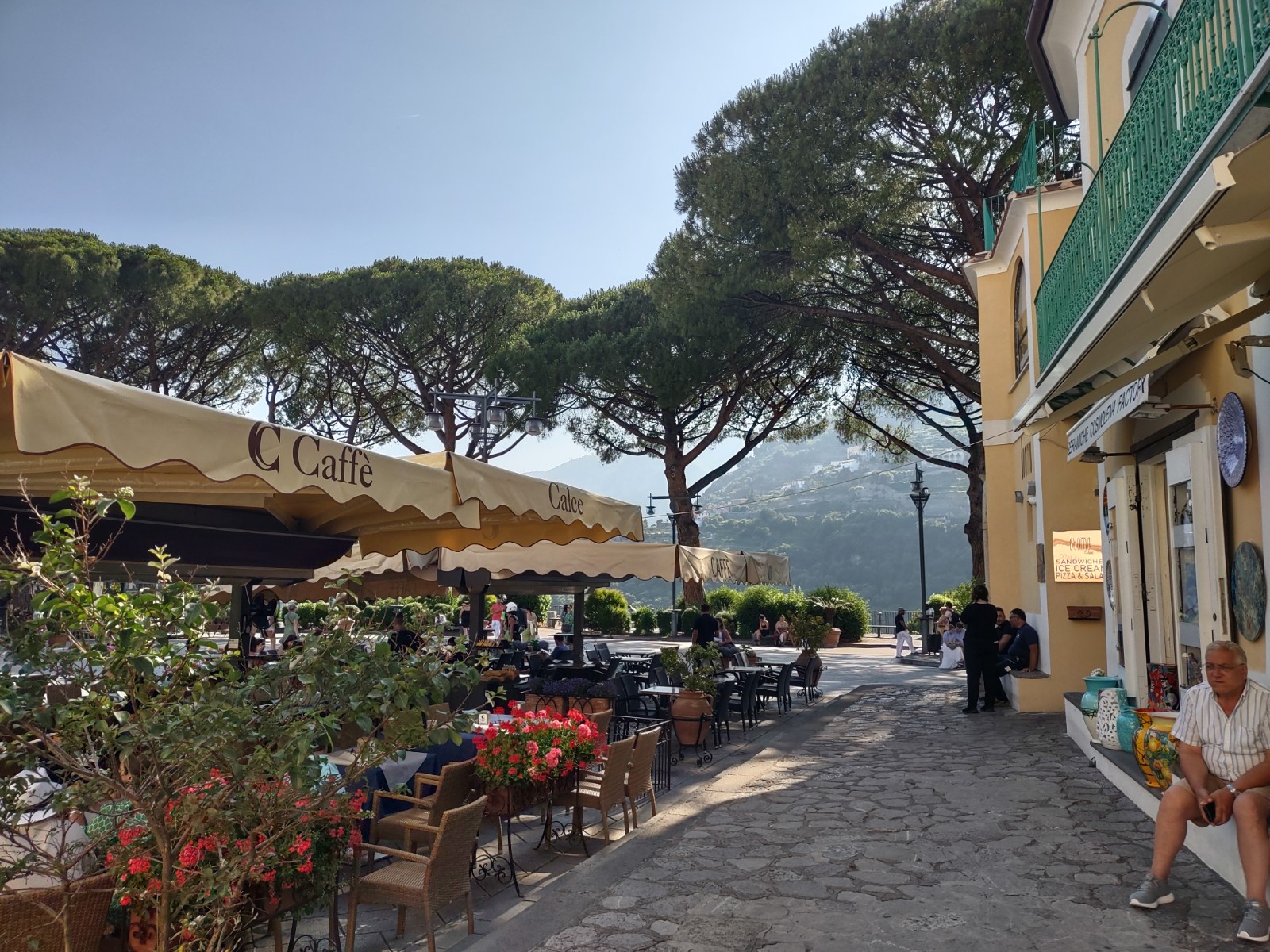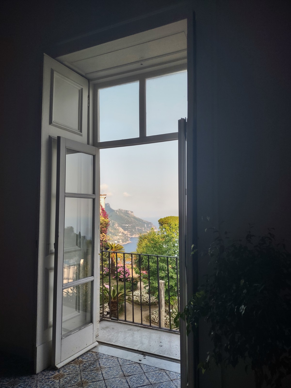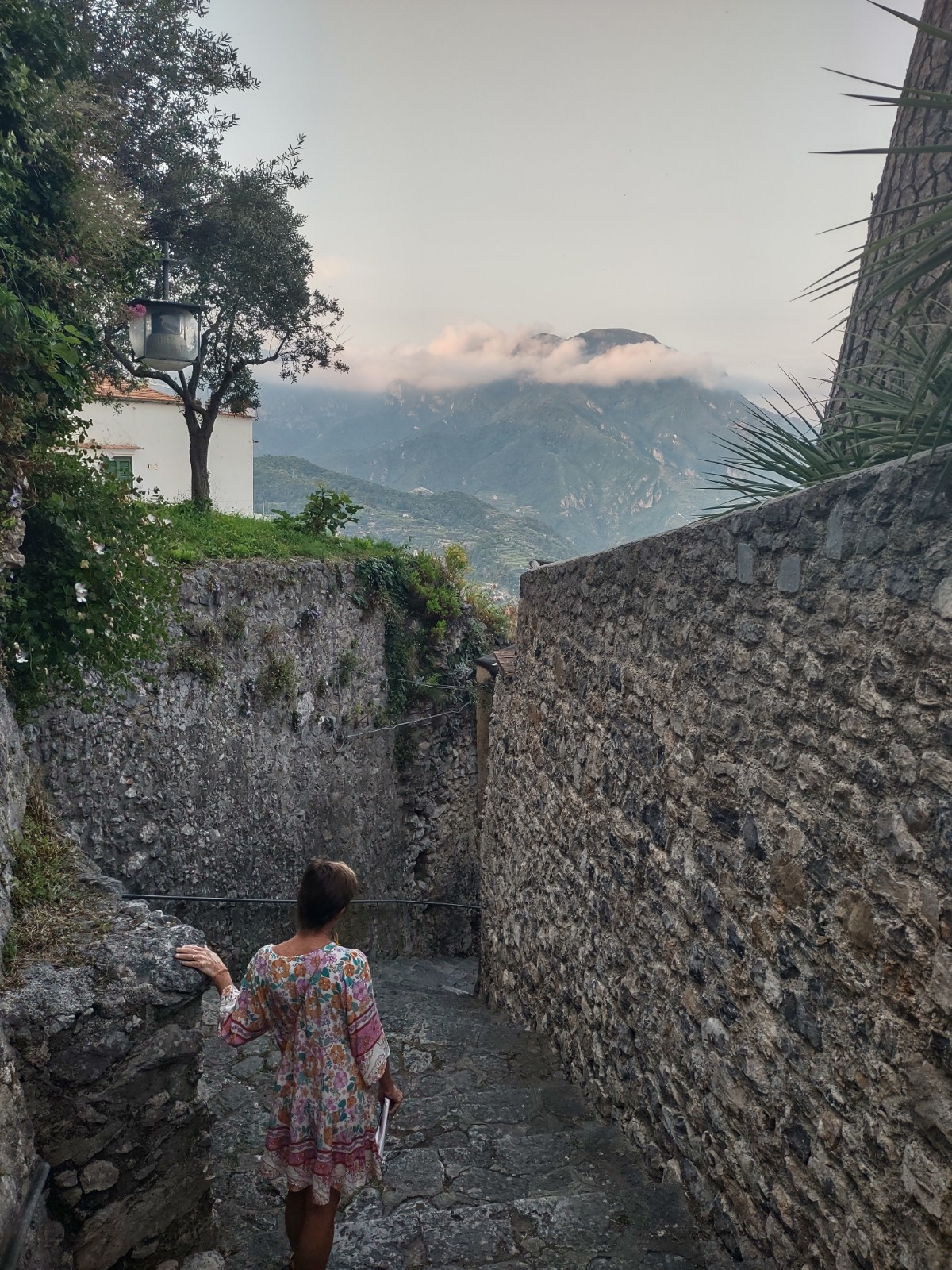 With a little more investigation and negotiation, Colleen found a driver who would take us to Ravello for 30 Euros but we would need to wait until he had a few more riders. We sat in the shade, sipped water, and watched the chaos ebb and flow around us, and eventually our driver announced it was time to go. As we climbed into the taxi van, a fellow traveler in the front passenger seat turned and announced “Welcome to the get me the hell out of here express!” which I think pretty closely echoed our sentiments at that point.
