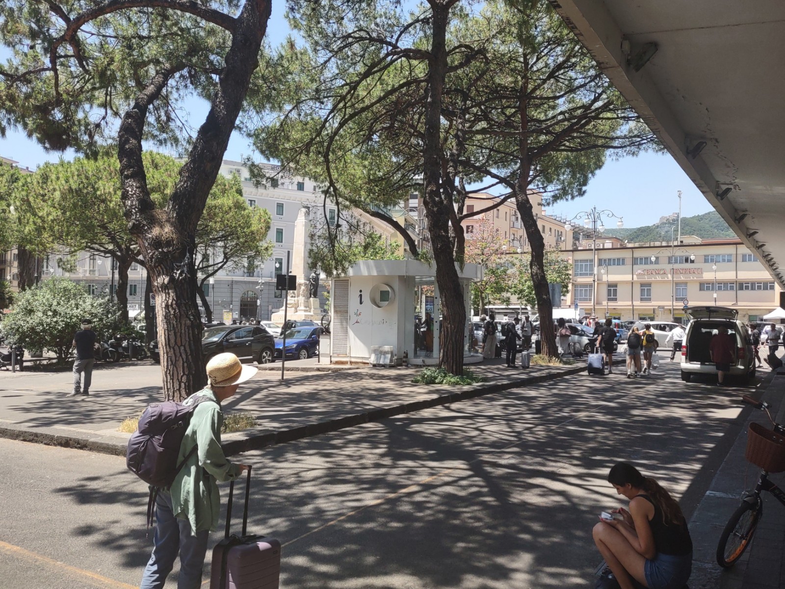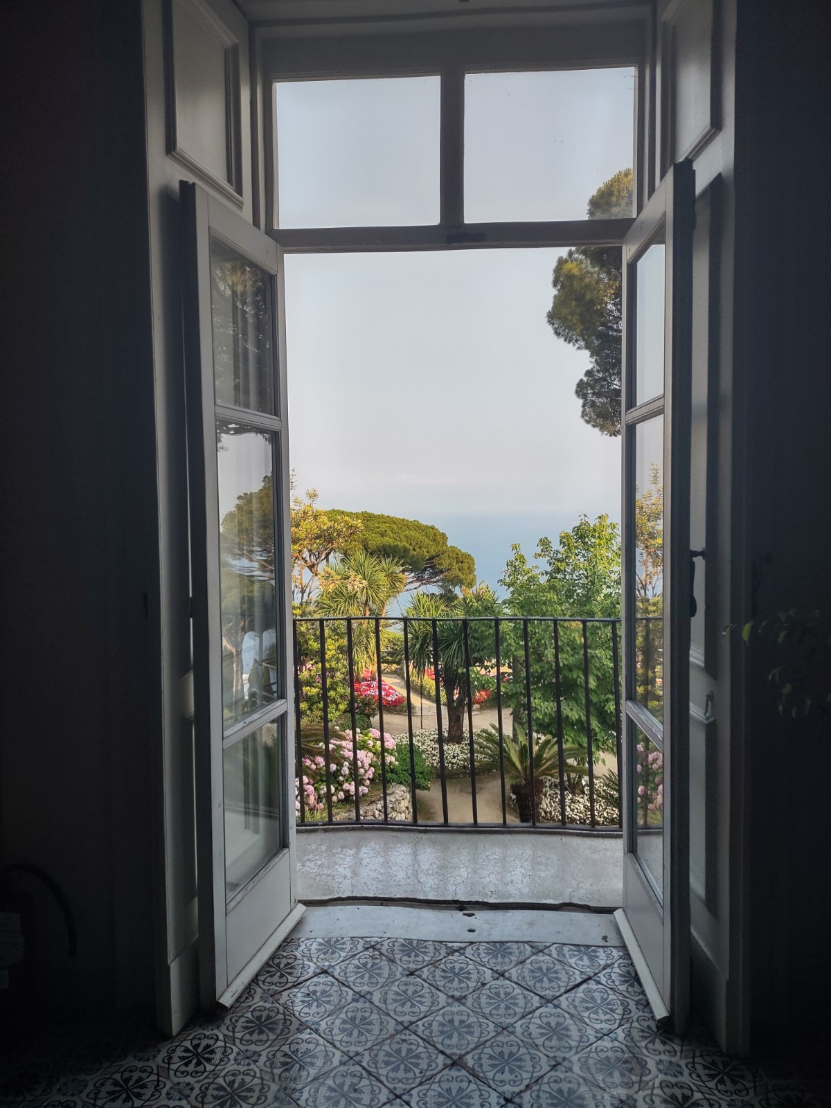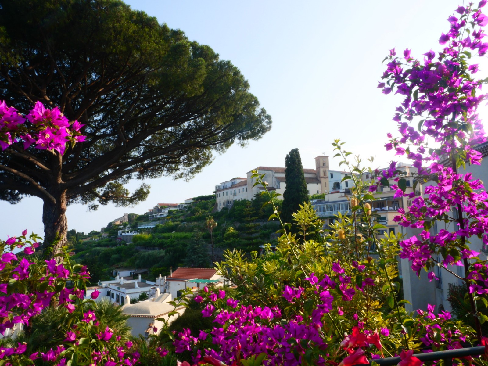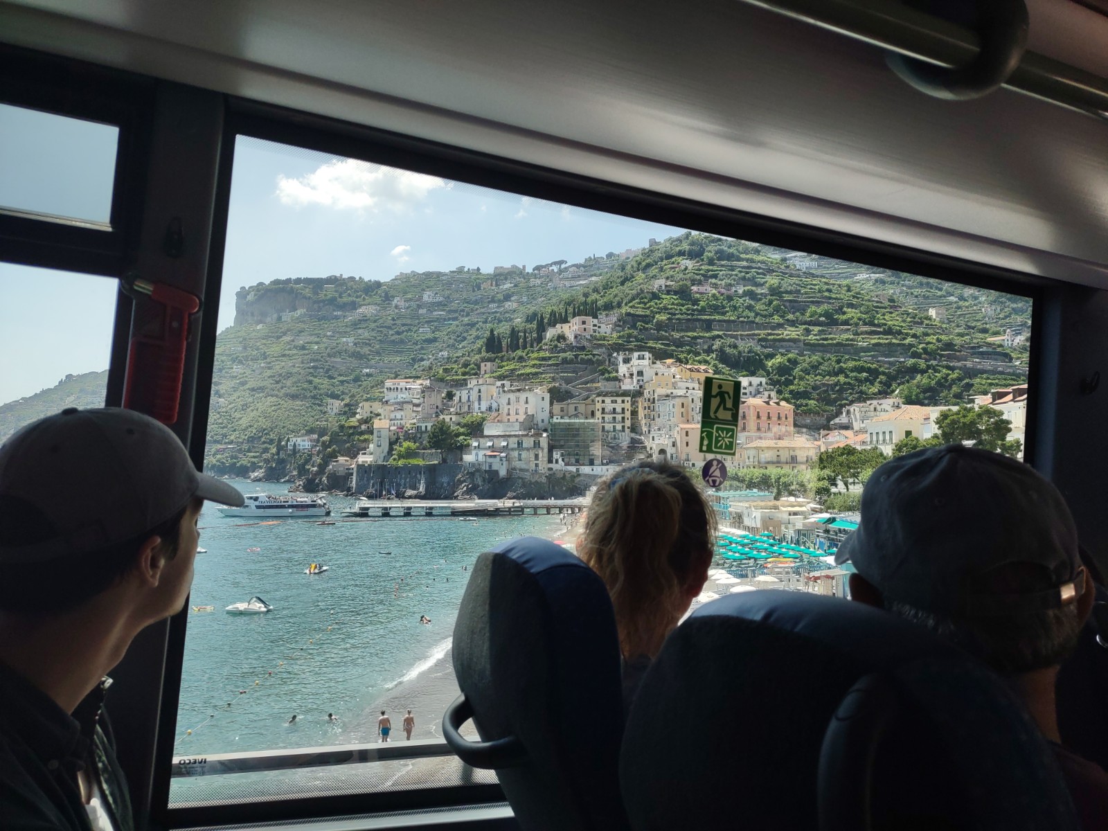 With a little more investigation and negotiation, Colleen found a driver who would take us to Ravello for 30 Euros but we would need to wait until he had a few more riders. We sat in the shade, sipped water, and watched the chaos ebb and flow around us, and eventually our driver announced it was time to go. As we climbed into the taxi van, a fellow traveler in the front passenger seat turned and announced “Welcome to the get me the hell out of here express!” which I think pretty closely echoed our sentiments at that point.