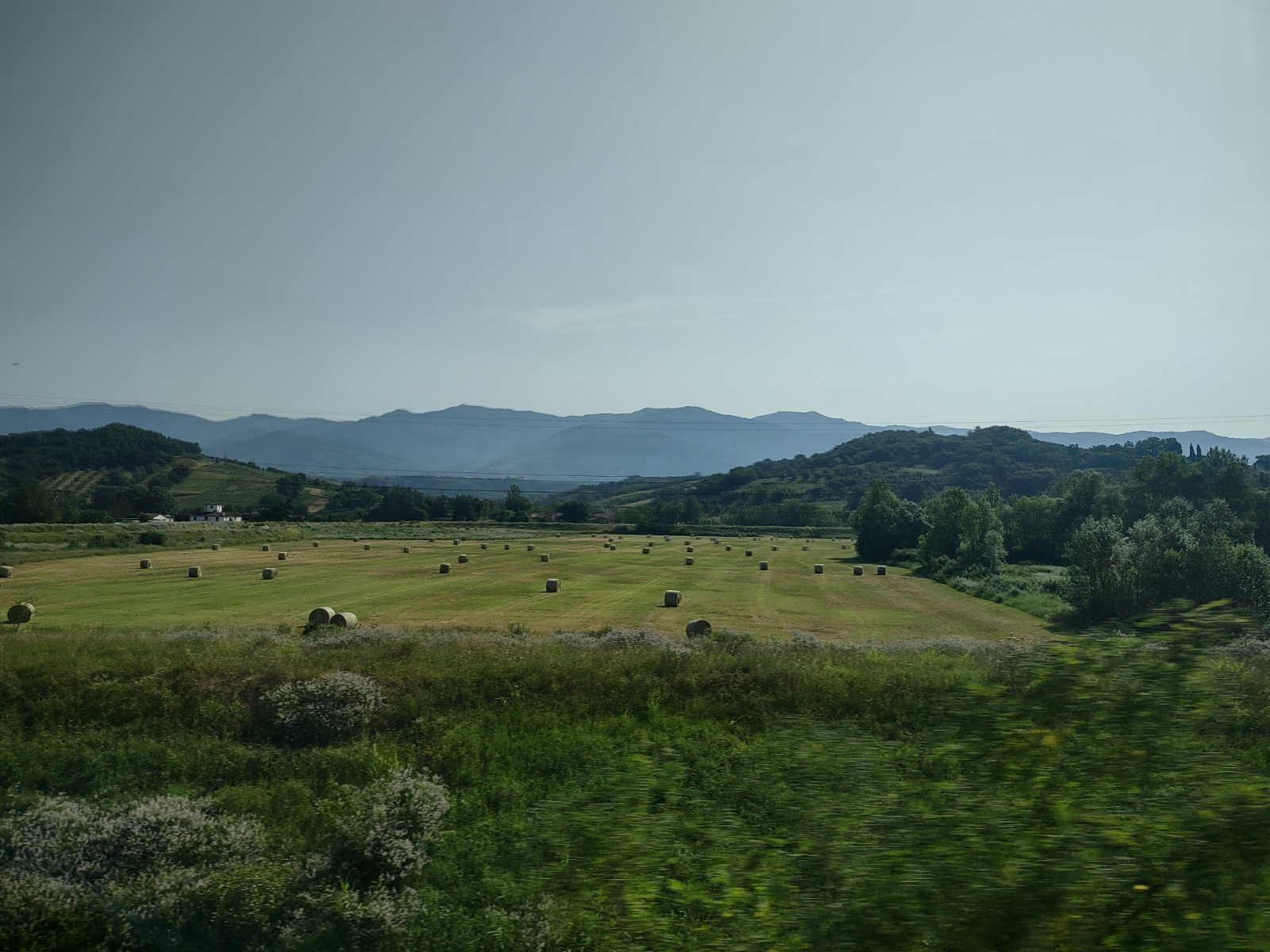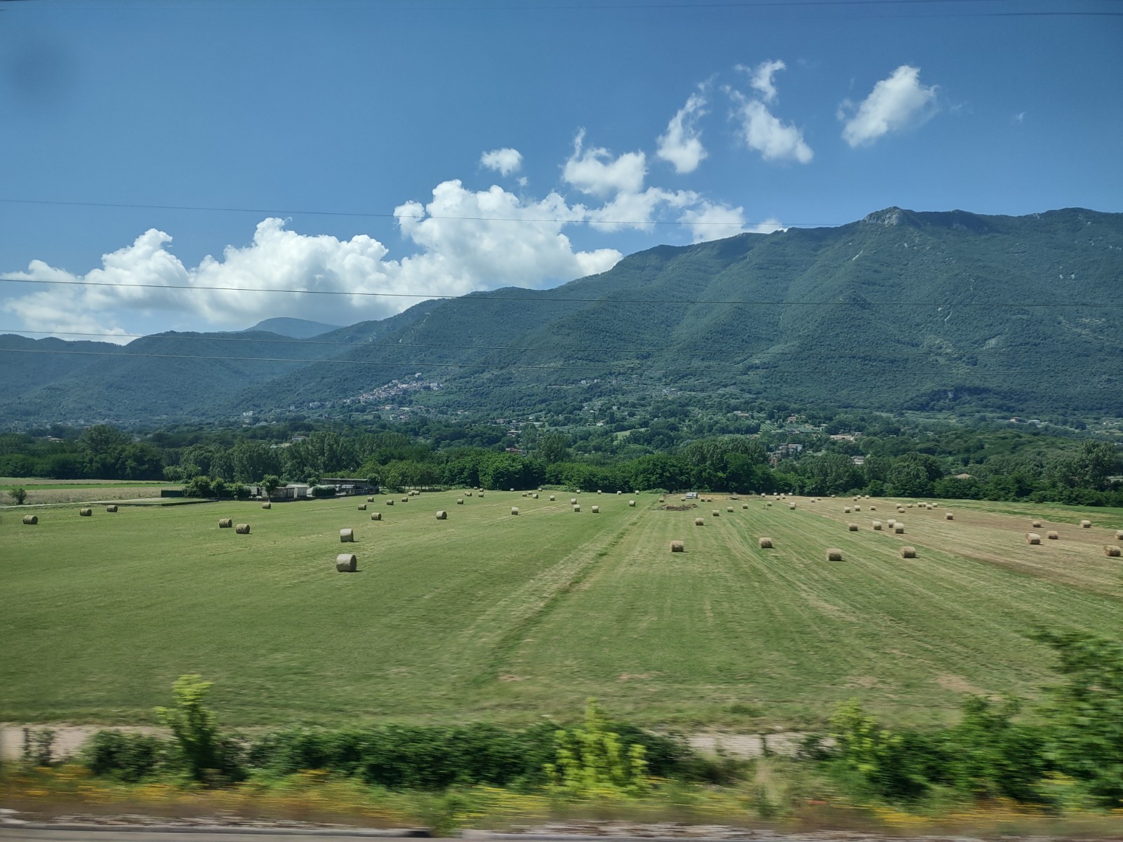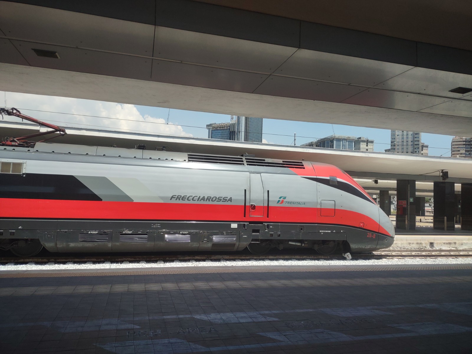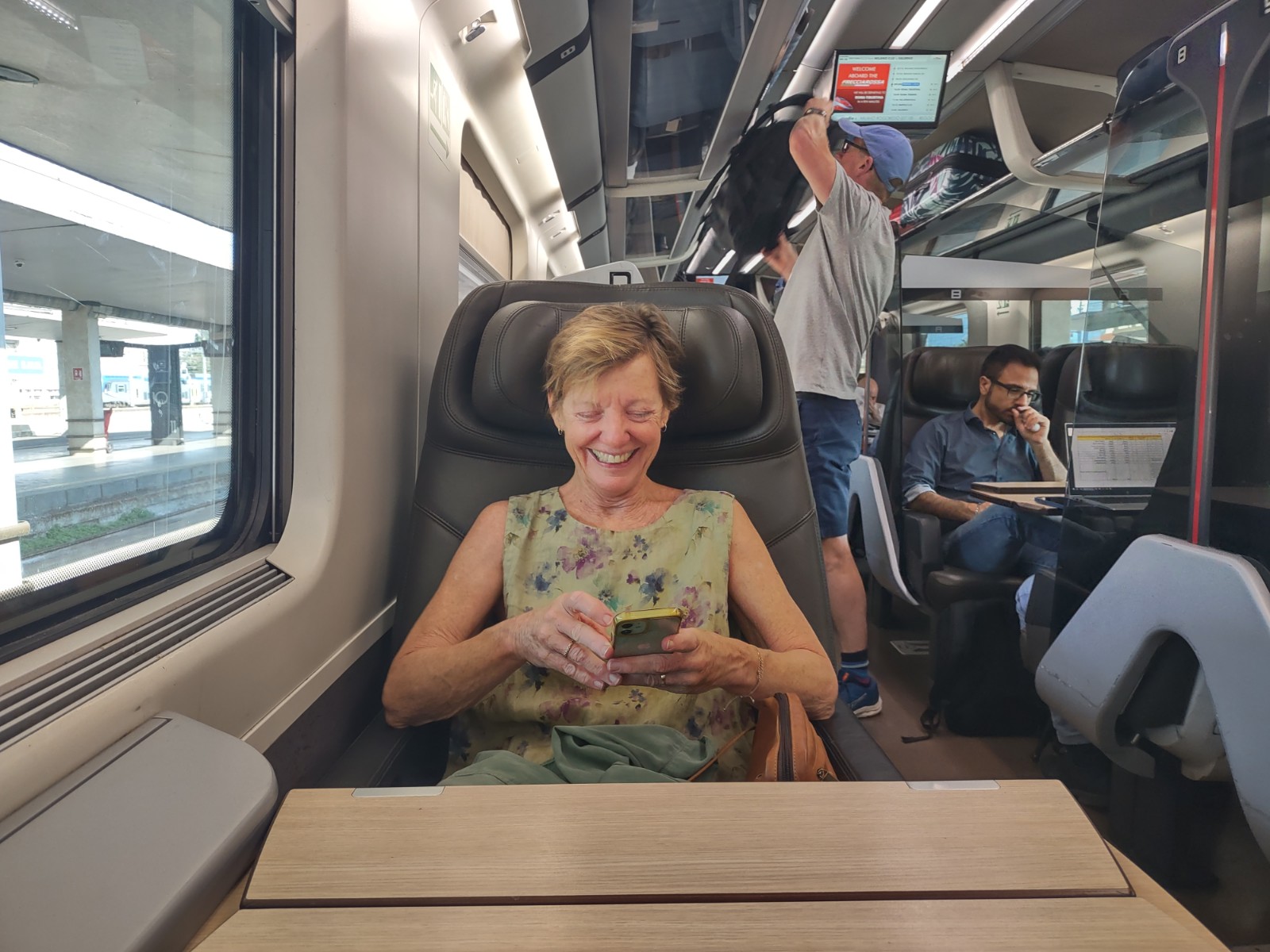 We left our apartment in Florence on Tuesday morning, June 27th, and schlepped our bags the 25 minutes it takes to reach the Santa Maria Novella train station where we arrived early enough for coffees and pastries. When we boarded the train we realized, after having to walk its full length, that Colleen had booked us reserved seats in Business Class which she willingly acknowledged she would not have paid extra for had she known. (This is an area where I feel she is sometimes a bit too frugal – I can’t even get her to spring for the extra seven or eight bucks it costs to get reserved seats on Ryan Air!) Intentional or not, she seemed pretty happy with both the seating accommodations and the complimentary breakfast and drinks which came with them!