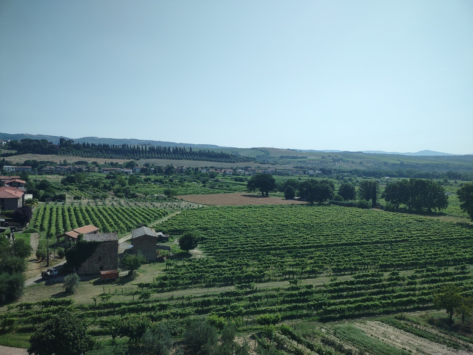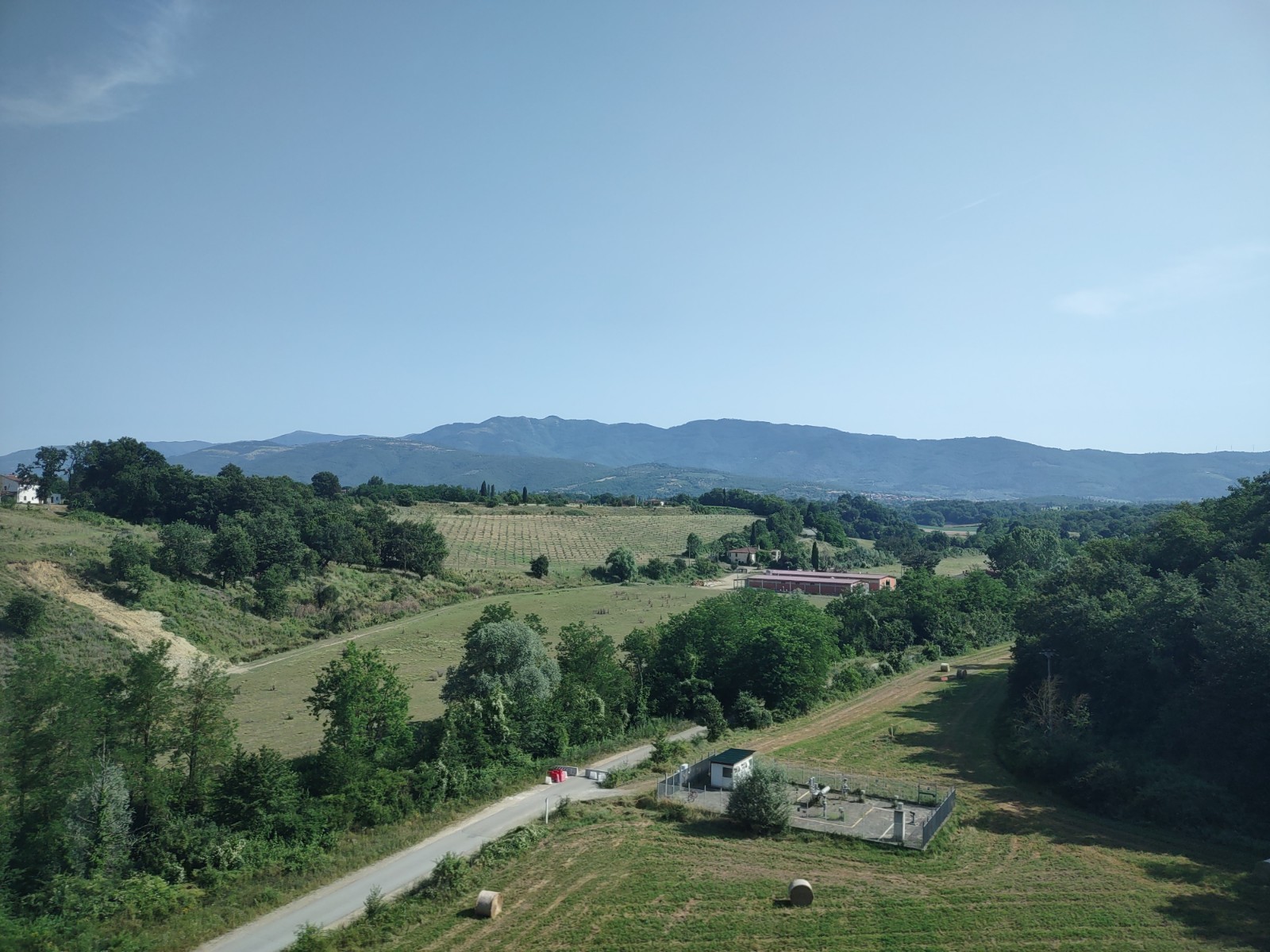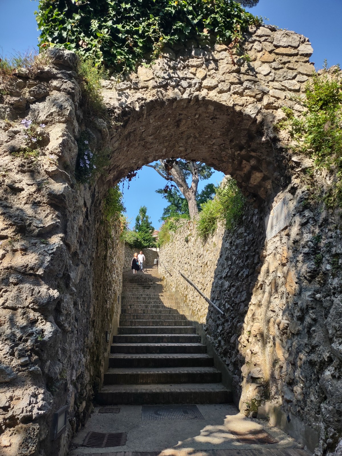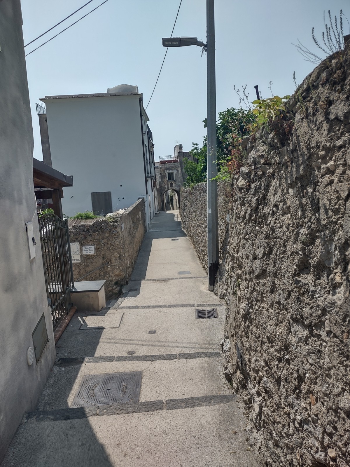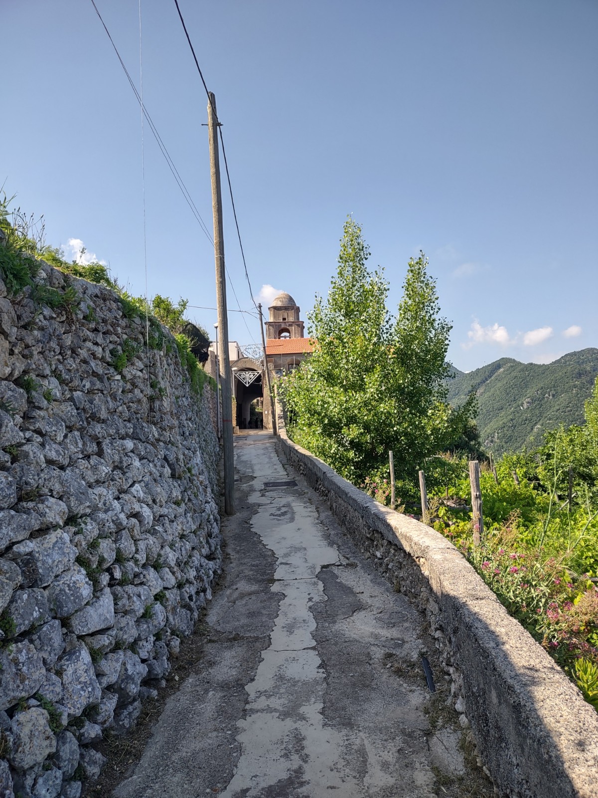 Because we were carrying luggage, we opted for the longest (and apparently least steep) of the available options which followed Via della Republica, the road we had arrived on, back down the mountain where it joined Via Loggetta, the street our house was on. At this point we realized that not everything identified as a “Via” is a road, at least not in the way we understand it. Via Loggetta, was more of a pathway than a road, was too narrow for cars (not necessarily a bad thing), and, when necessary, included steps. Shortly before reaching our apartment, at the intersection with another “not a road” Via which led back up to town, Via Logetta passed through the portico of the local parish church, which was actually kind of cool. Despite it being very hot and our being very tired the walk to our house was not bad and gave us a pretty good taste of the views and scenery (as well as terrain) we would be enjoying over the next few days.