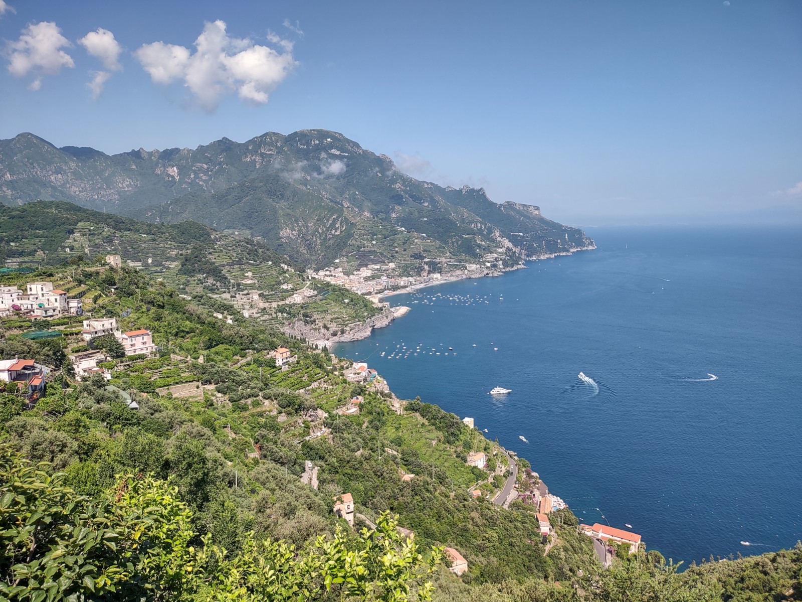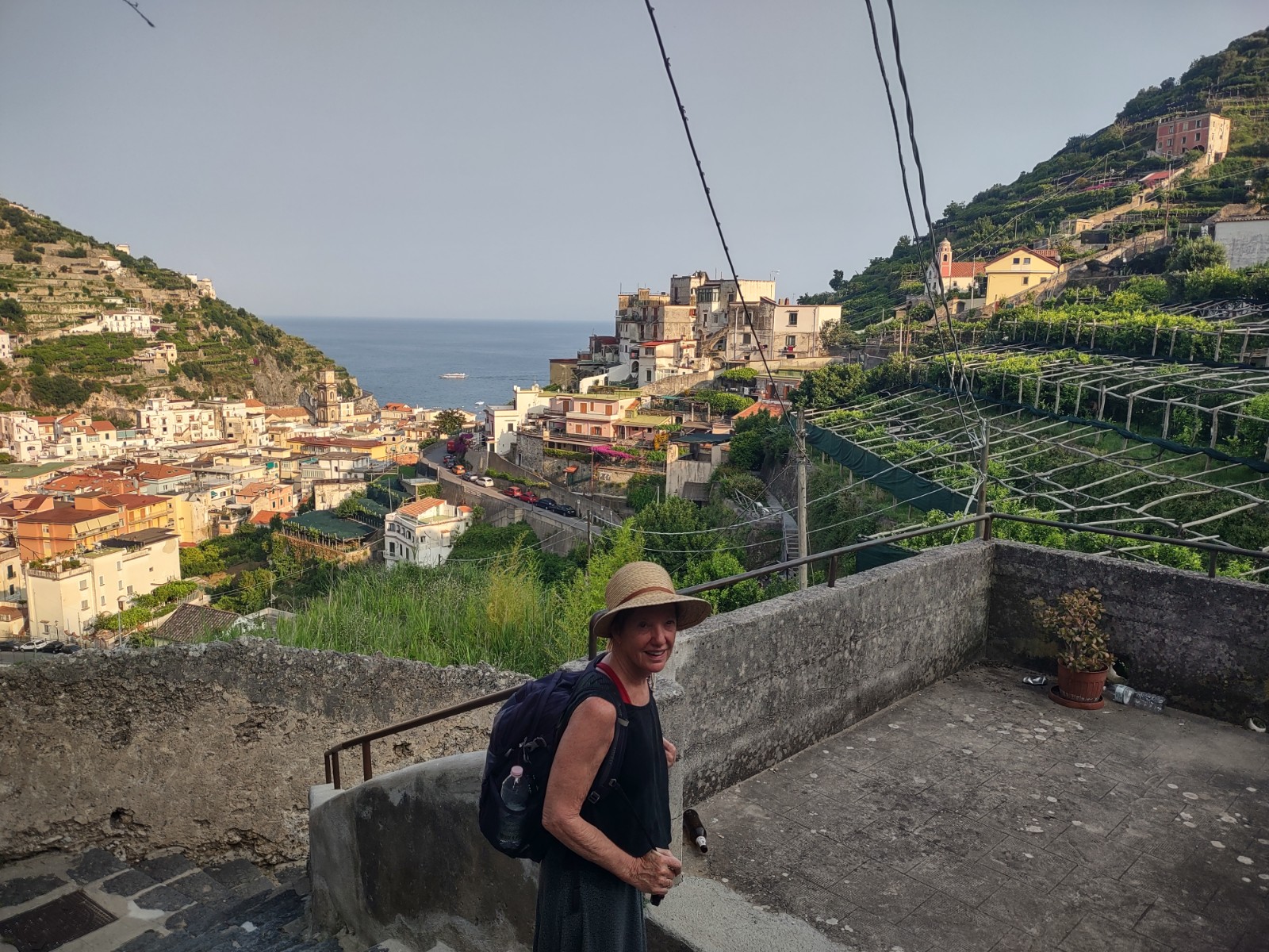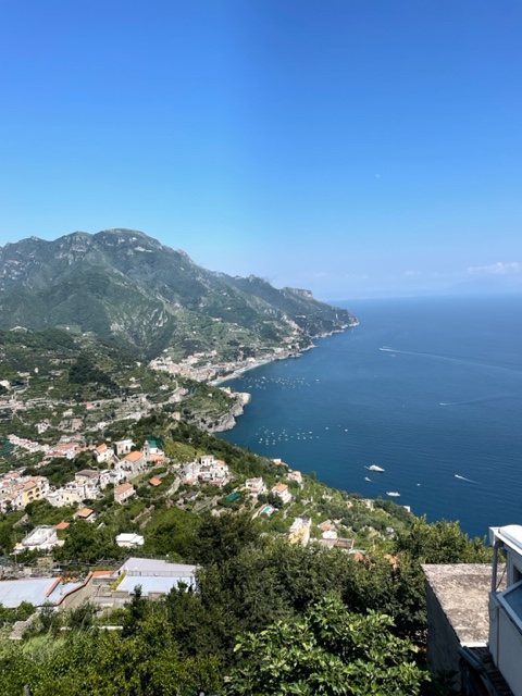 The train ride was great with wonderful views of the Italian countryside, but our issues started in Palermo where we discovered that, despite information to the contrary, there is apparently no direct bus from Palermo to Ravello. And so, we boarded a bus for Amalfi where (maybe?) we could catch a bus to Ravello which (of course) was not the case. What followed was a very memorable bus ride from Palermo to Amalfi with amazing views of the towns and coastline sliding past us as the bus flew around hairpin turns on a narrow road which was, for the most part, high above the water hugging the sides of steep cliffs. (Colleen later confirmed that this ride was definitely in the top five of the list of near-death experiences.)