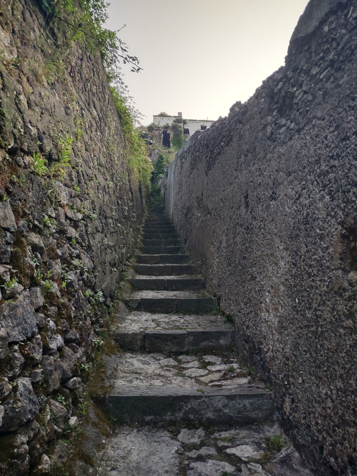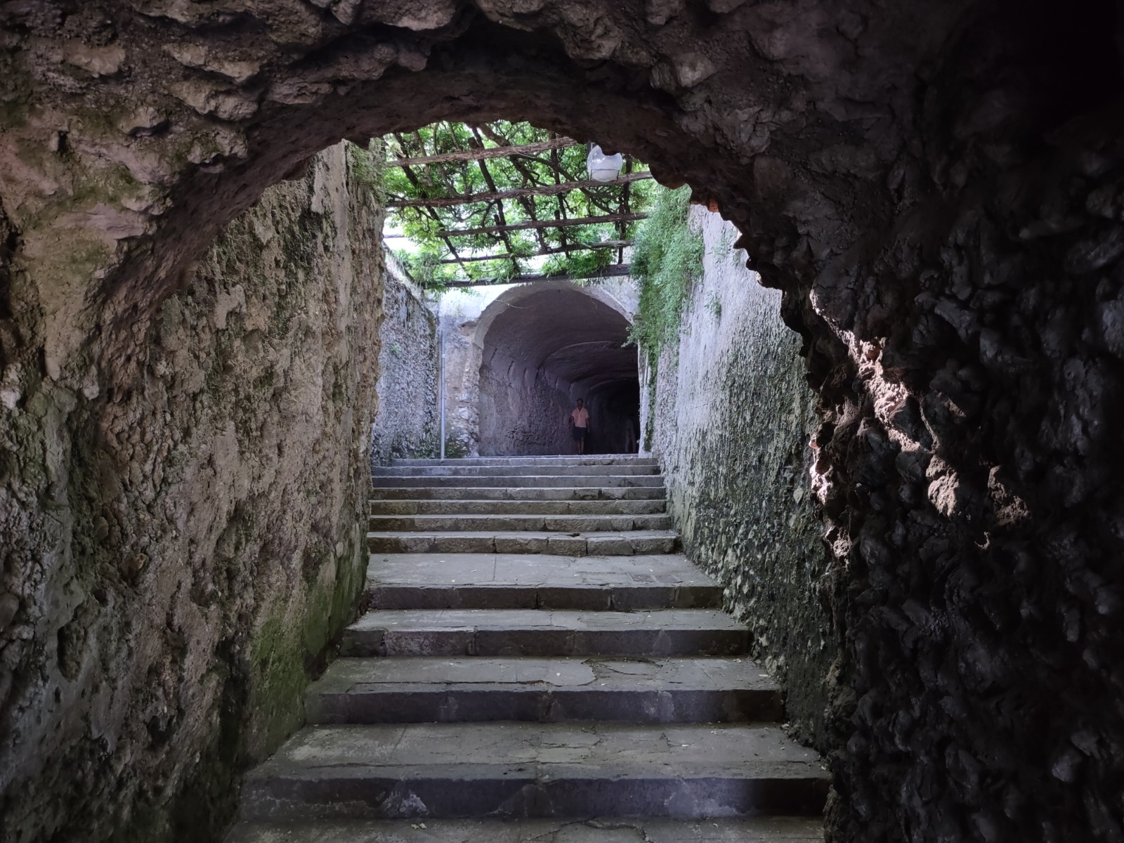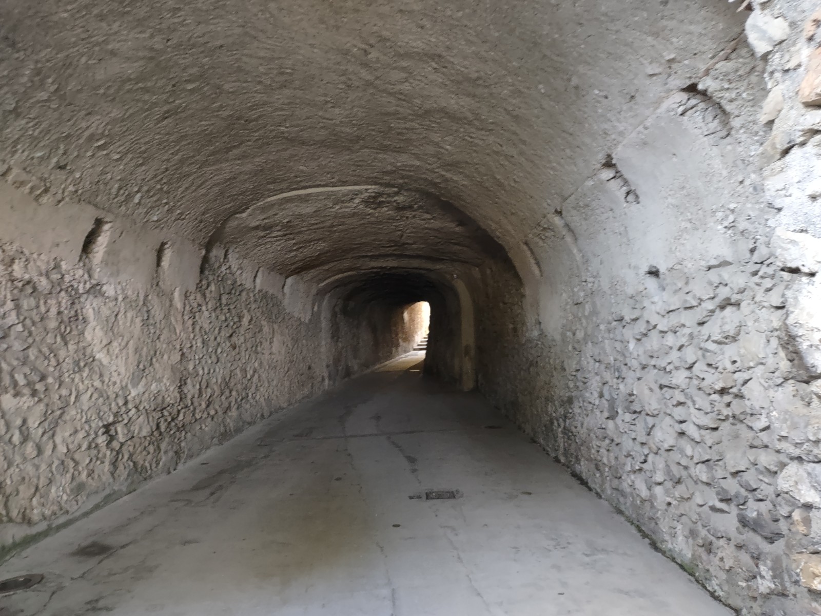The taxi ride up the mountain was fine and, because we had to backtrack up the coast before heading into the mountains, we got to see some of the lovely views which had flown past us about an hour earlier. (It was much more of an “oooh” and “aaah” experience this time versus the prior “we’re all going to die!” experience.) Because it was a group taxi, the driver deposited us all at a point where vehicular traffic ends near the center of town, but actually on the other side of a mountain ridge which is crossed by a pedestrian tunnel. (Tunnels seem to be a pretty common and popular thing on the Italian western coast!)