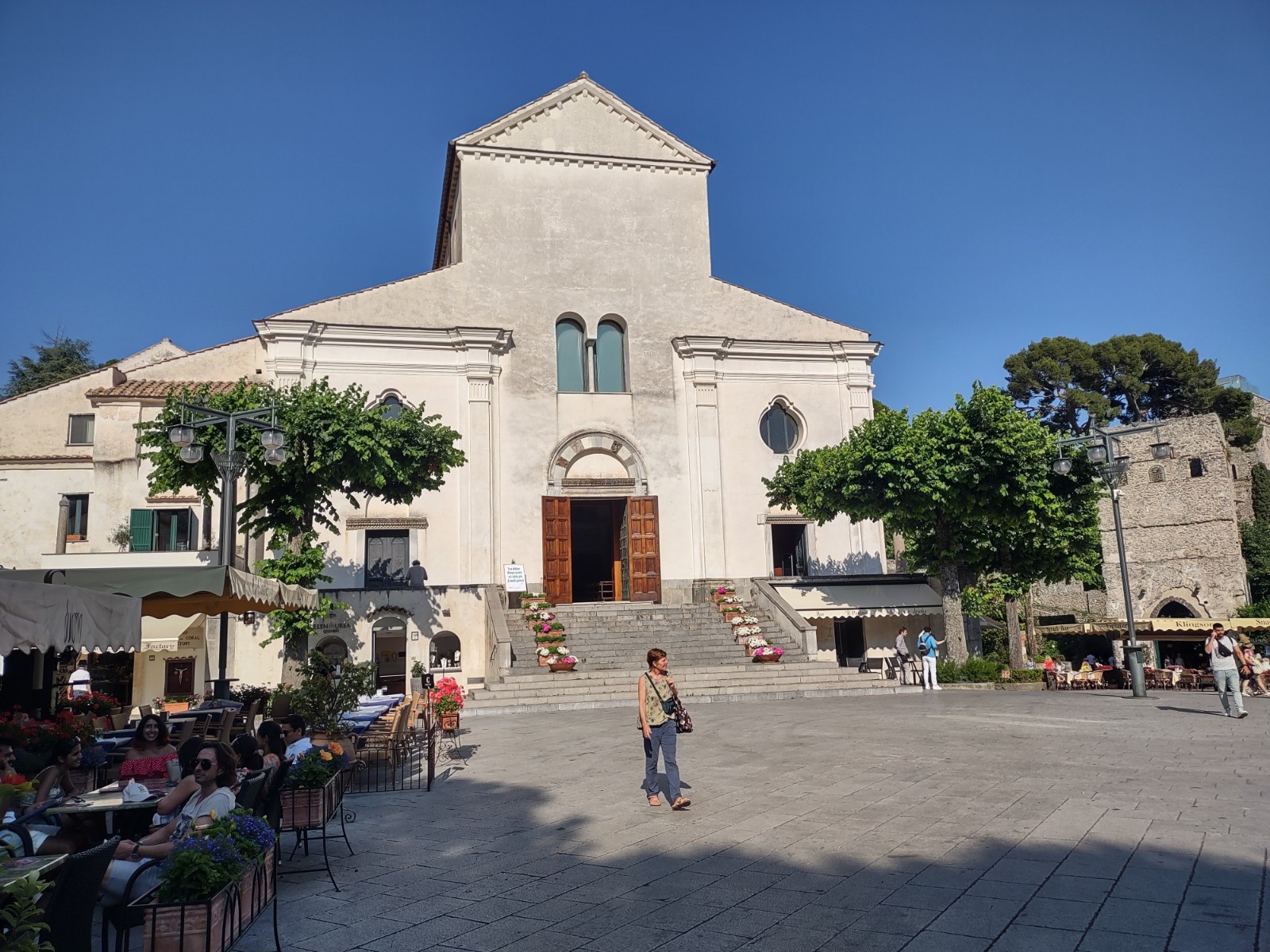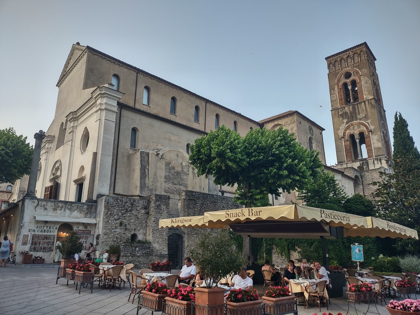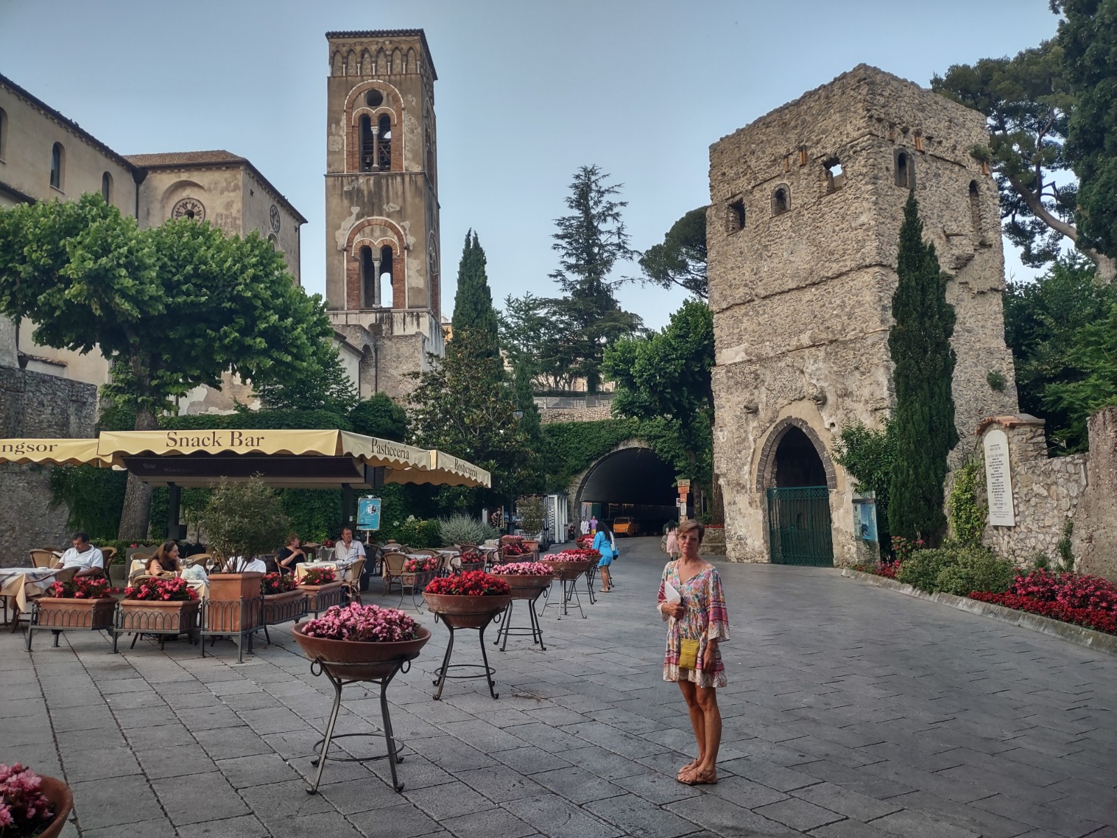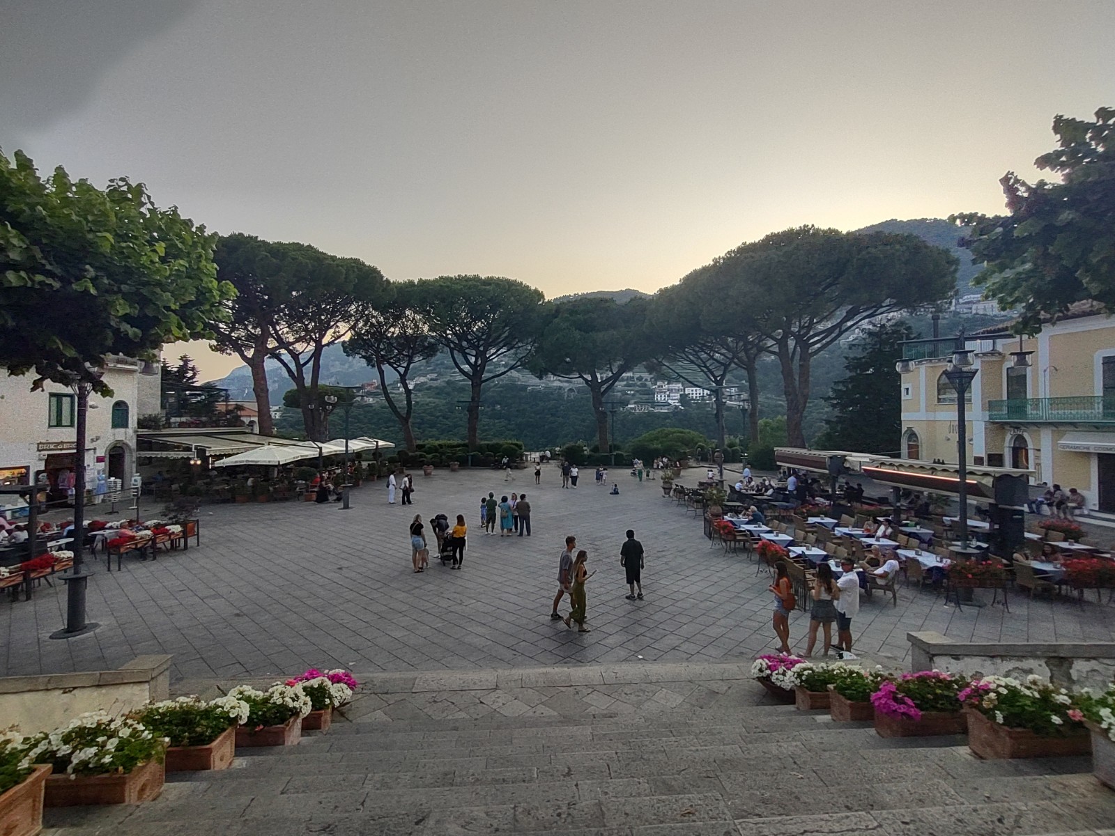 Let me say at this point that the town of Ravello is without question one of the most beautiful and picturesque places we have visited. The town square (the Piazza Vescovado or Piazza del Duomo), is like something out of a story book with the elevated Duomo at one end, open-air cafes and some shops on the sides, framing a very large plaza which is open at the opposite end with beautiful views of old villas and houses across the valley which drops to the sea far below. We first arrived in the evening (with the day trippers gone) so the Piazza was not crowded, but there was a lot of activity with people (in much fancier attire than what we were used to) dining, drinking and strolling around the plaza, and in and out of the small streets and alleyways which led off in all directions to an assortment of shops and boutiques.