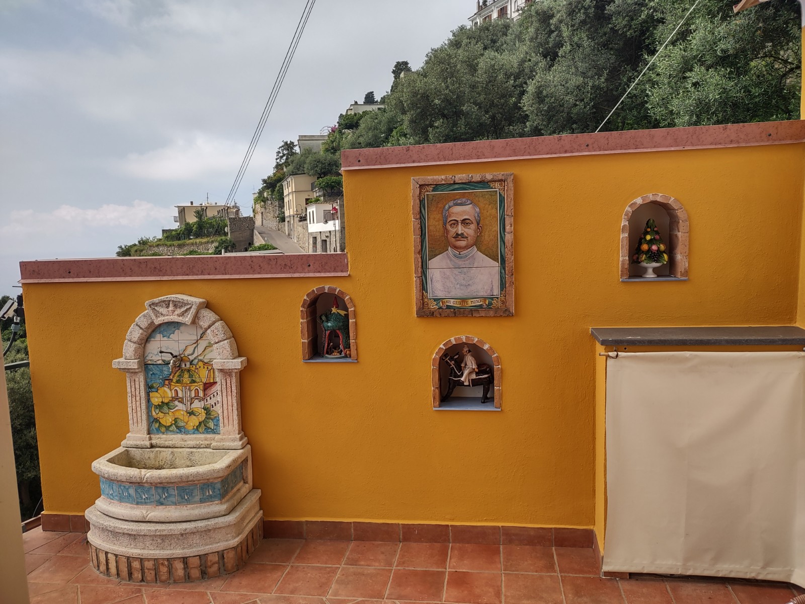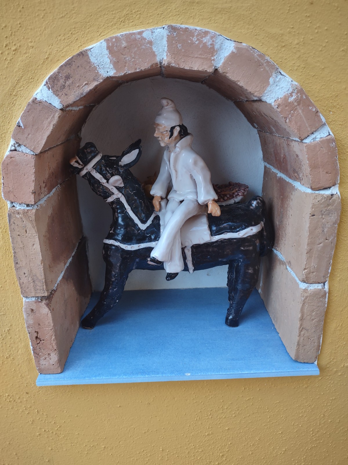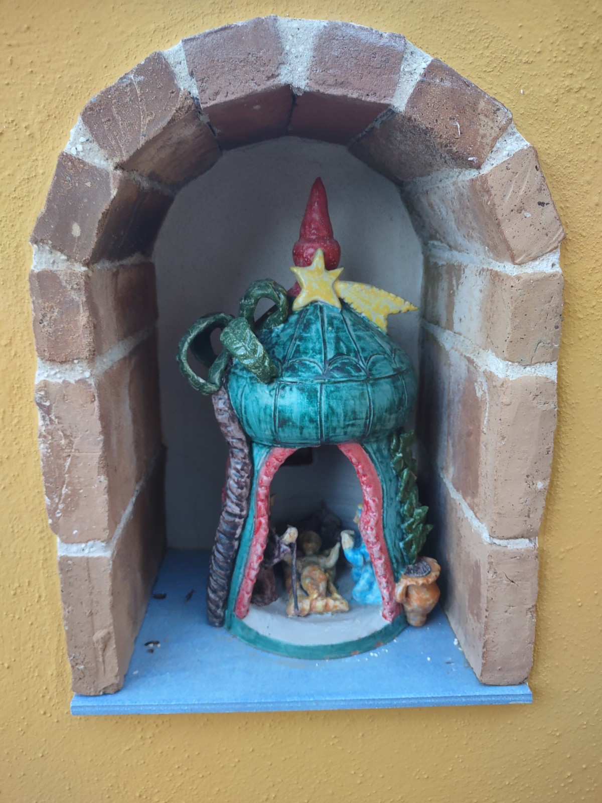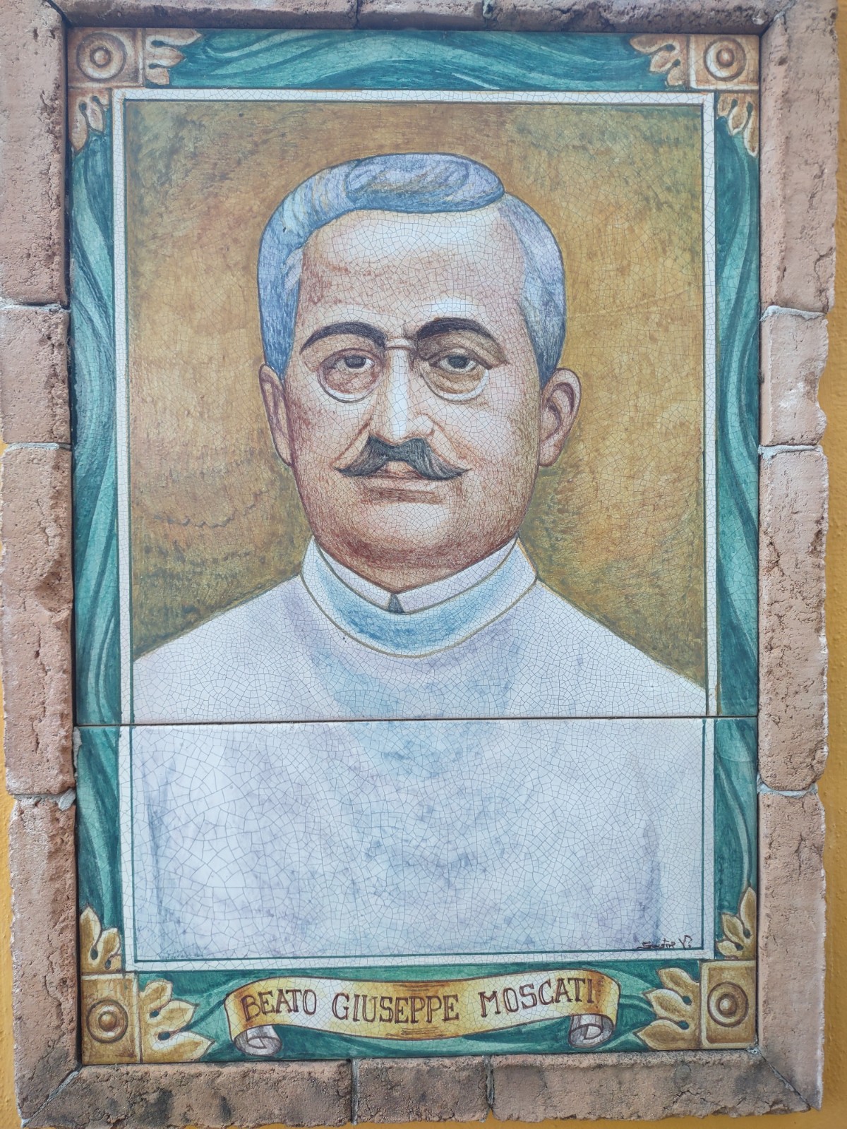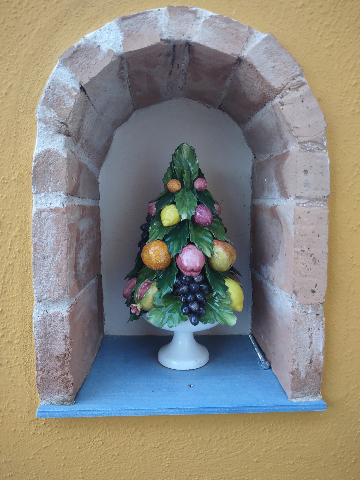 On the wall adjacent to the fountain was a fresco portrait of Saint Giuseppe Moscati surrounded by three niches which contained some interesting but somewhat inexplicable objects (a nativity scene, a Christmas tree decorated with fruit, and a man in white riding a donkey). We later learned that Moscati (1880-1927) was a doctor and early biochemist who was canonized by the Roman Catholic Church in 1987 but were unable to come up with any relationship to the inexplicable objects (although, if you look closely at the guy on the donkey, he looks an awful lot like Elvis).