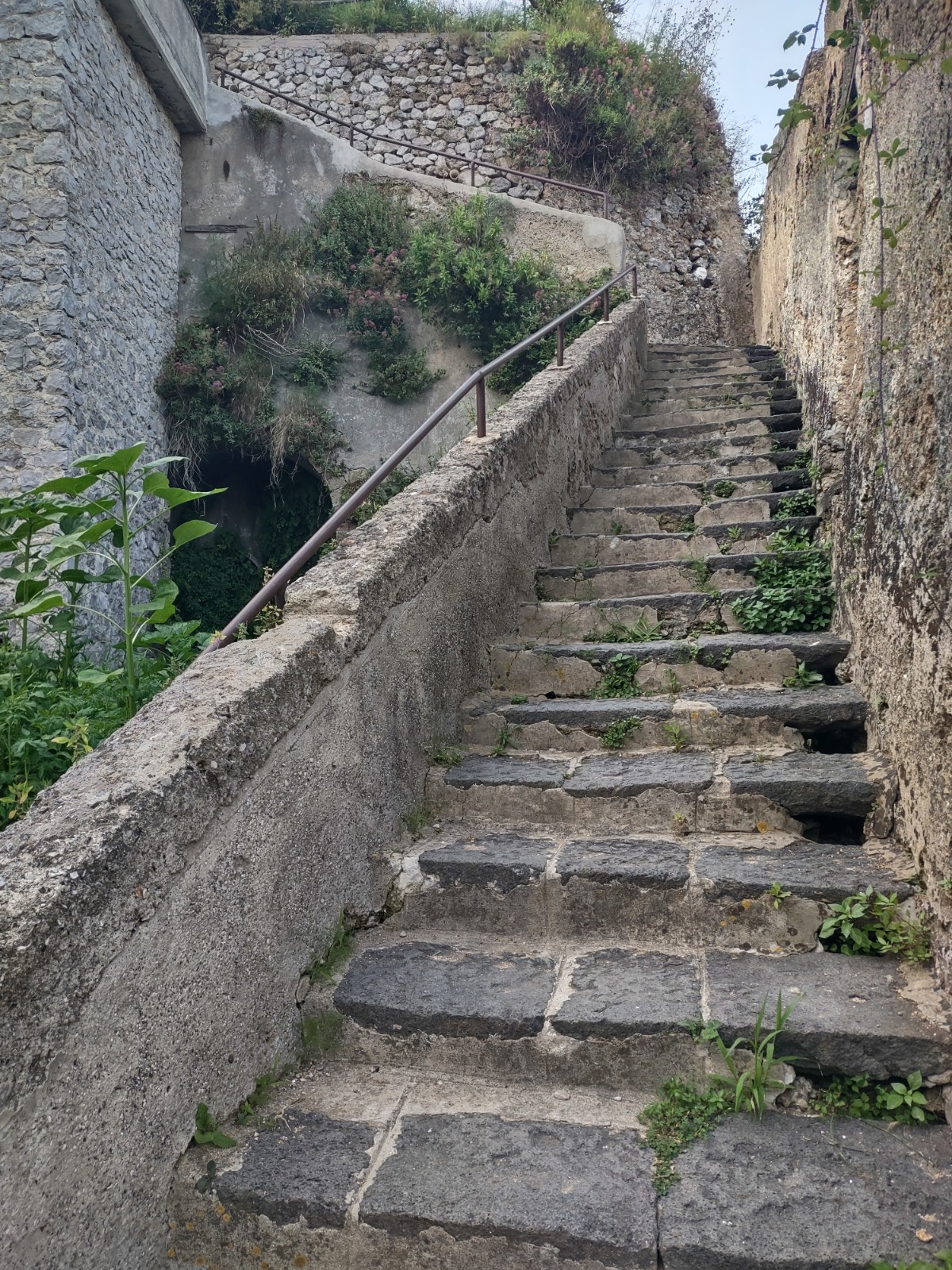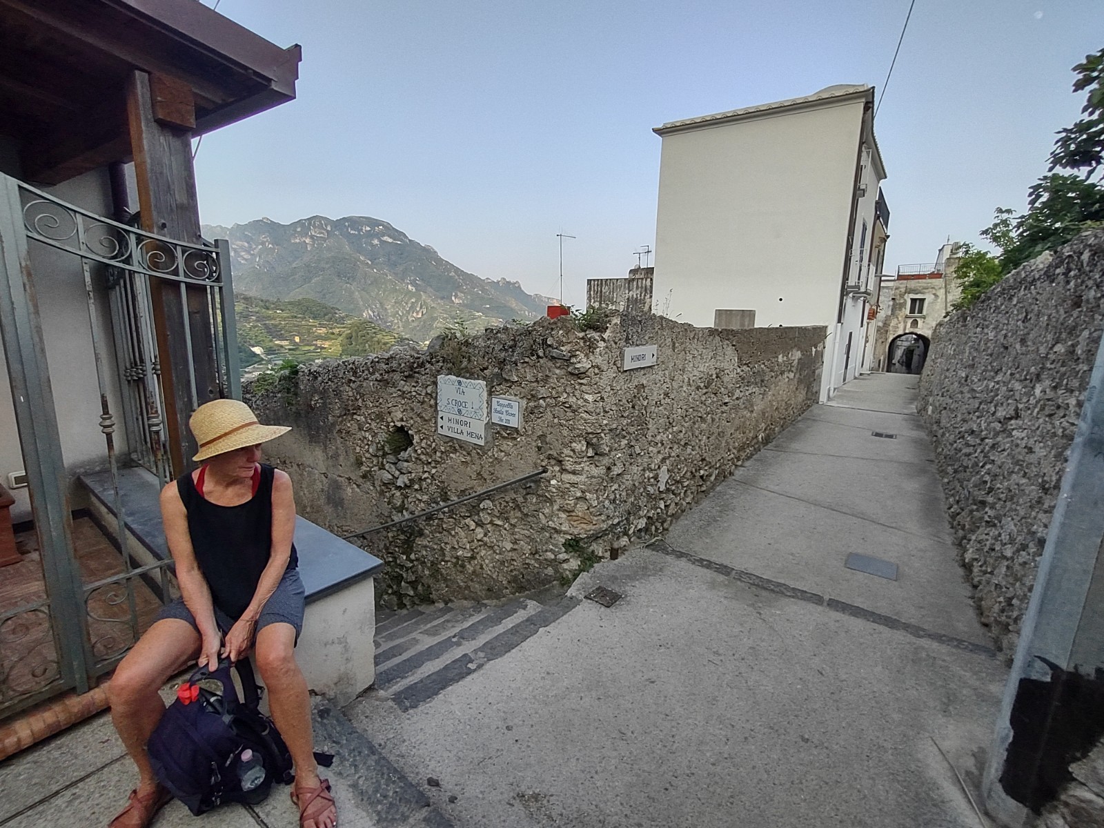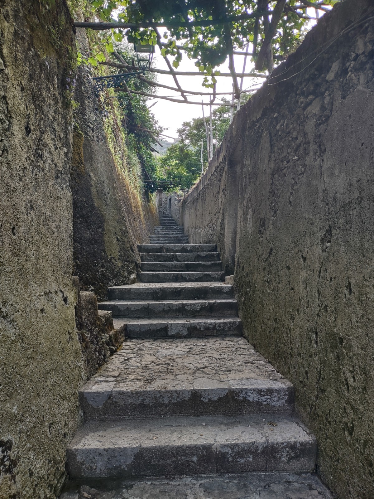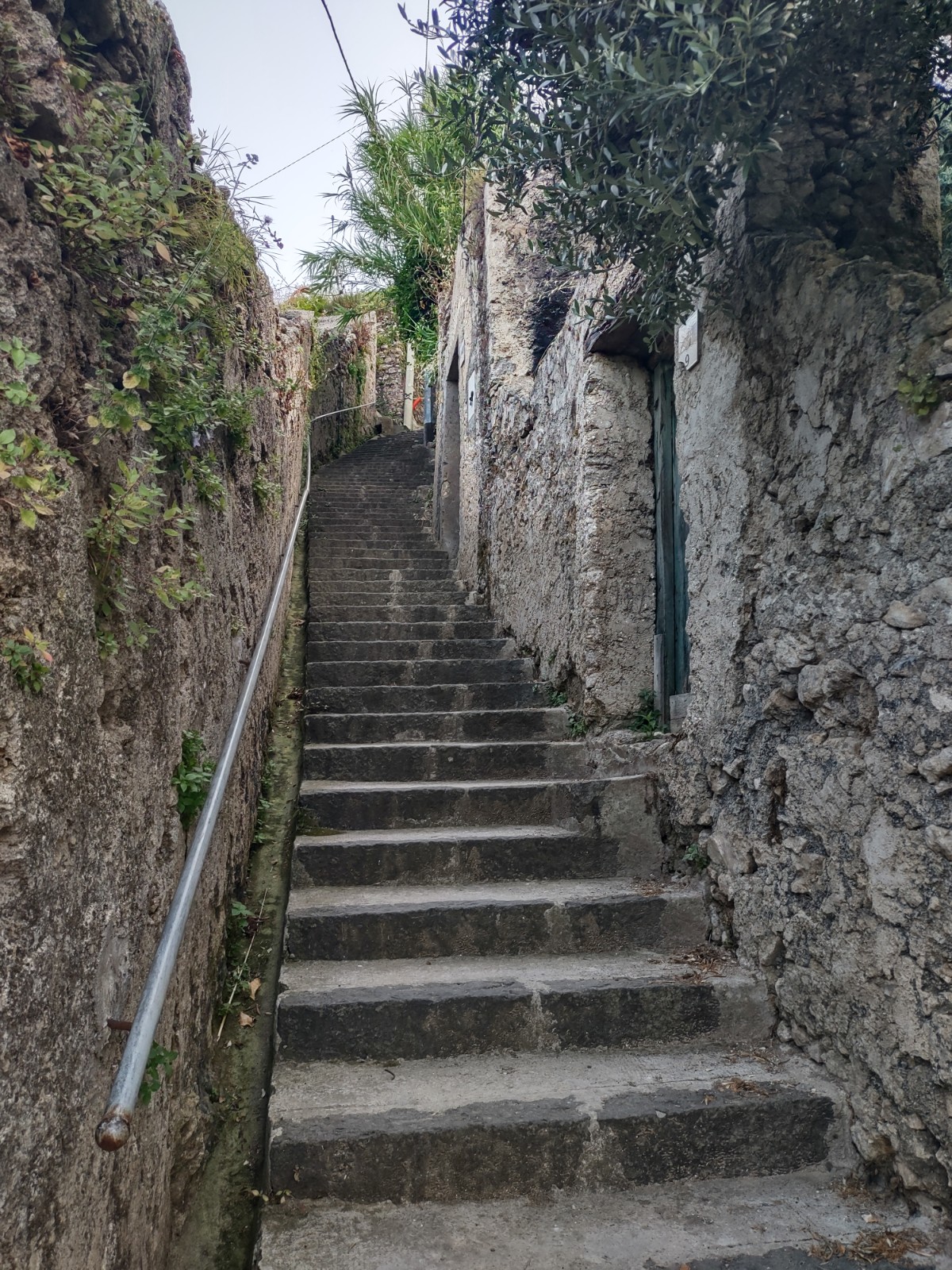 So, this was the point in our visit to Ravello where theory about what the place would be like met reality in a very physical way. While we could see the distances between places (like the town center and our house) on Google Maps, even with the terrain layer on, it’s very difficult to judge how much change in elevation there is. (We later discovered the way to determine this is to plot the route by bicycle which will give you the total vertical distance travelled up, down, and net.) So, while the walk between the Ravello town center and our house was between a half and about a full kilometer in distance (depending upon which of several routes you took), it was important to realize that there was also over 115 meters of vertical difference between the two. (Once this clicked for us, we began thinking about the route between places in terms of the number of stair steps – standard 8 inch risers – it equated to.)