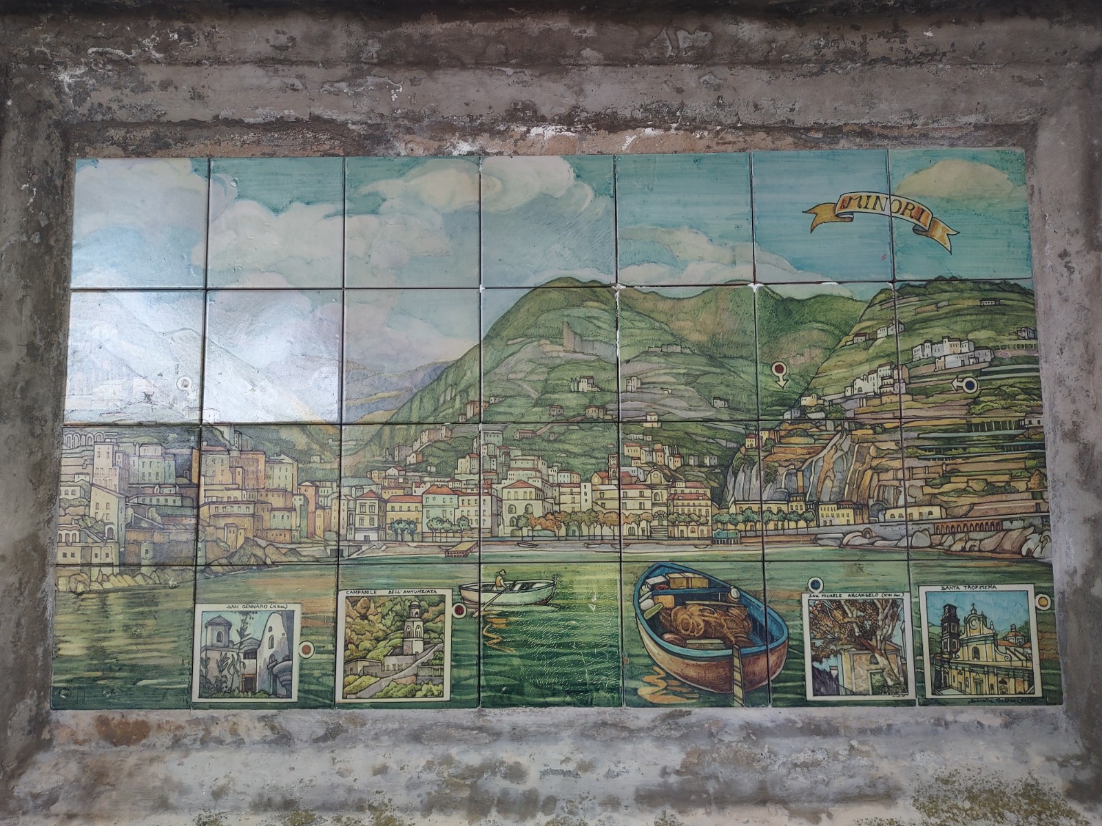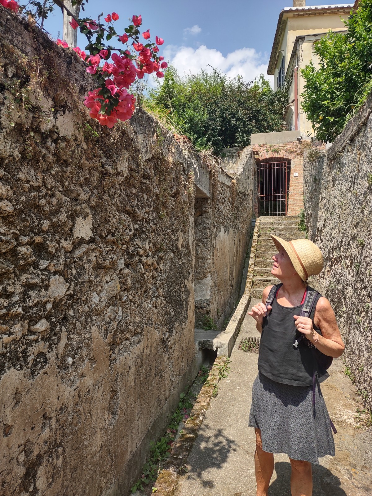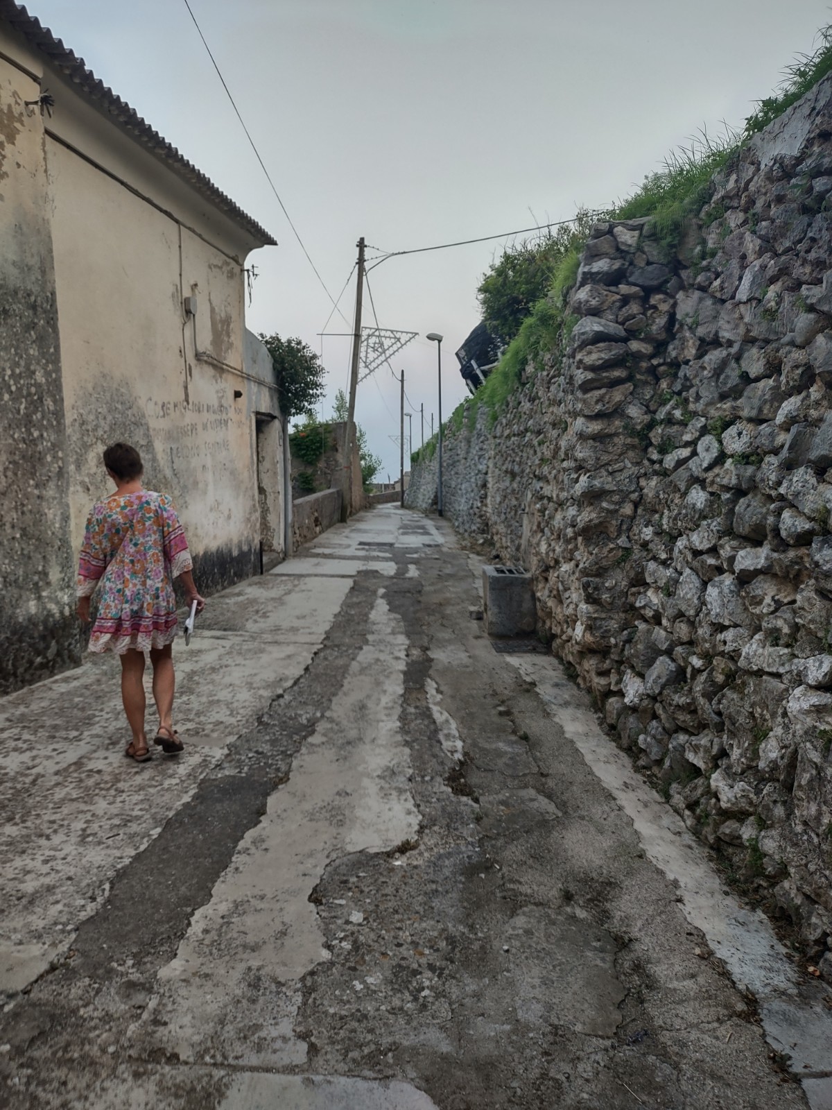 We got a fairly early start, hoping to take advantage of the cooler morning (at least for the way down) and began the descent to Minori beach located 305 vertical meters (1,000 feet – the equivalent of 1,500 stairs) below our house. As we were not carrying luggage, opted for the most direct (and steepest) route which avoided the coast road which seemed pretty unsafe for pedestrians. The path itself was quite interesting, a combination of narrow walkways and stairs (mostly stairs) with stone walls on one side or the other (sometimes both) which wound their way through old farmhouses, lemon groves, and the occasional church, chapel, or shrine. Every now and then, the path would open to a beautiful view of the coast below us but, as beautiful as the descent was, it was difficult not to occasionally think about what the climb back up would be like.