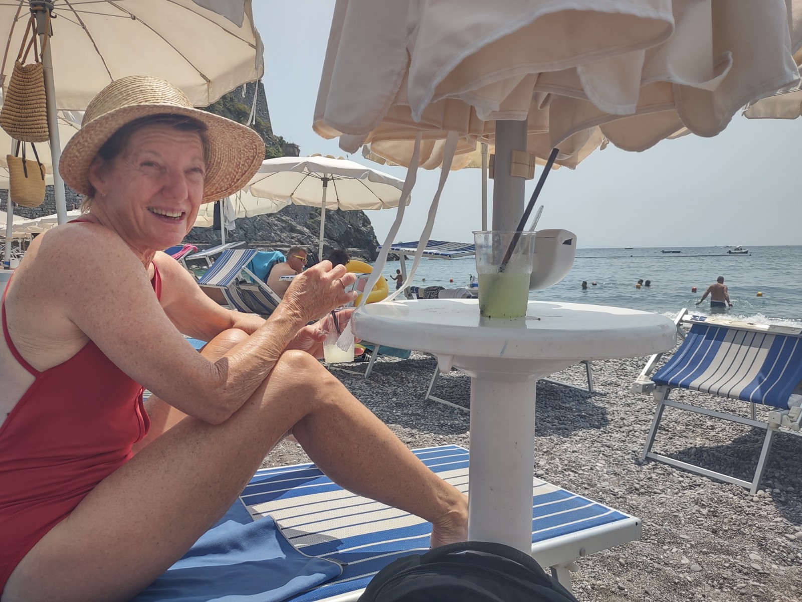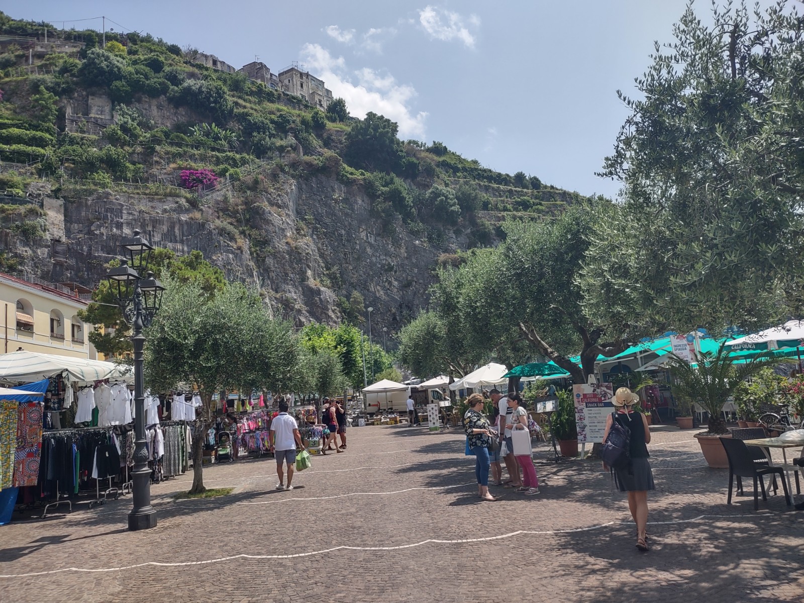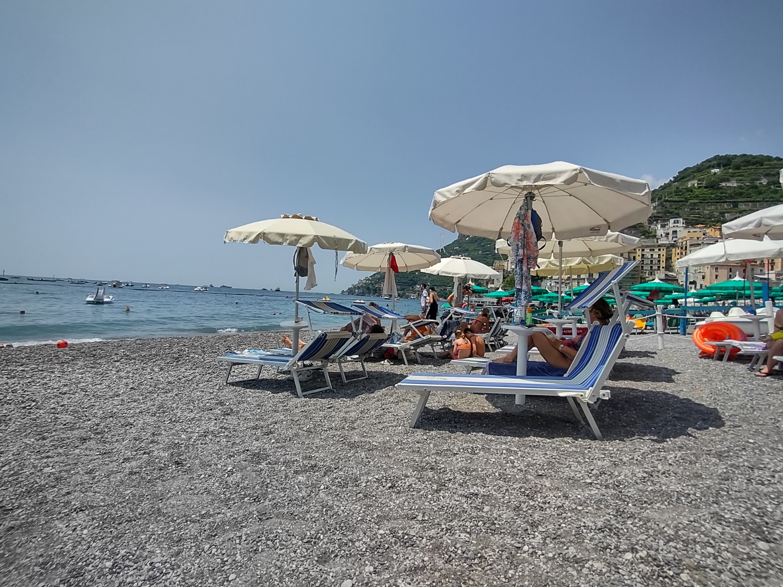 We entered Minori from the hill behind and made our way through the town toward the seafront and were quite surprised at how uncrowded it seemed. We found the beach beyond a nice little day market and did what we had decided one does at an Italian beach – rented two beach chairs and an umbrella. Like the town, the beach was not very crowded and we had a great morning basking in the sun and taking an occasional dip in the just cold enough water. We took a break for lunch and had some great fresh seafood at a place called La Locanda Del Pescatore.