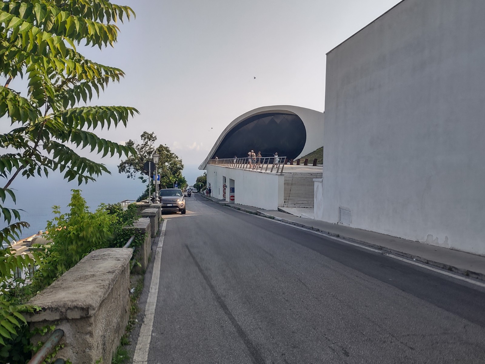 The climb was beautiful but long and hot with the only thing to be done to take our time along with frequent breaks to hydrate and enjoy the views. Just before the turn for our street, we came across the Oscar Niemeyer Center which we had glimpsed on the way up the mountain. The Niemeyer center is a modern concrete and glass structure which serves as one of the venues for Ravello’s annual music festival.