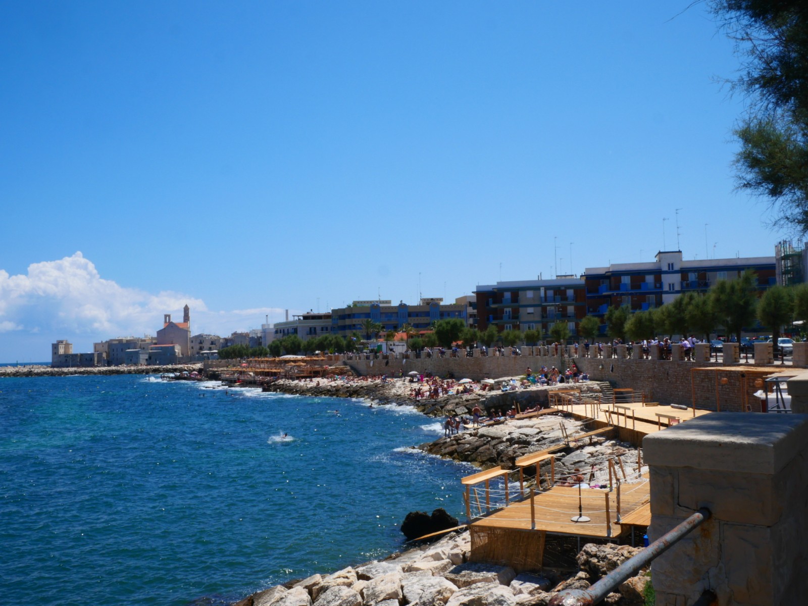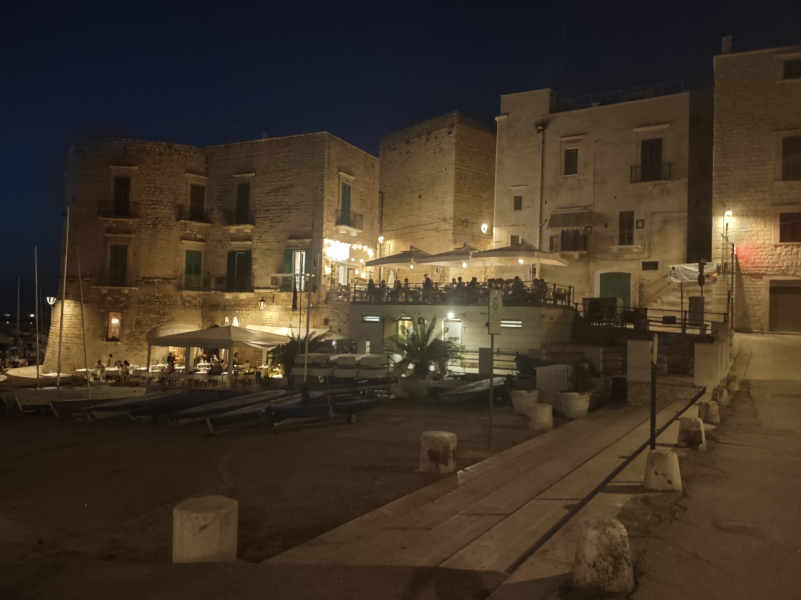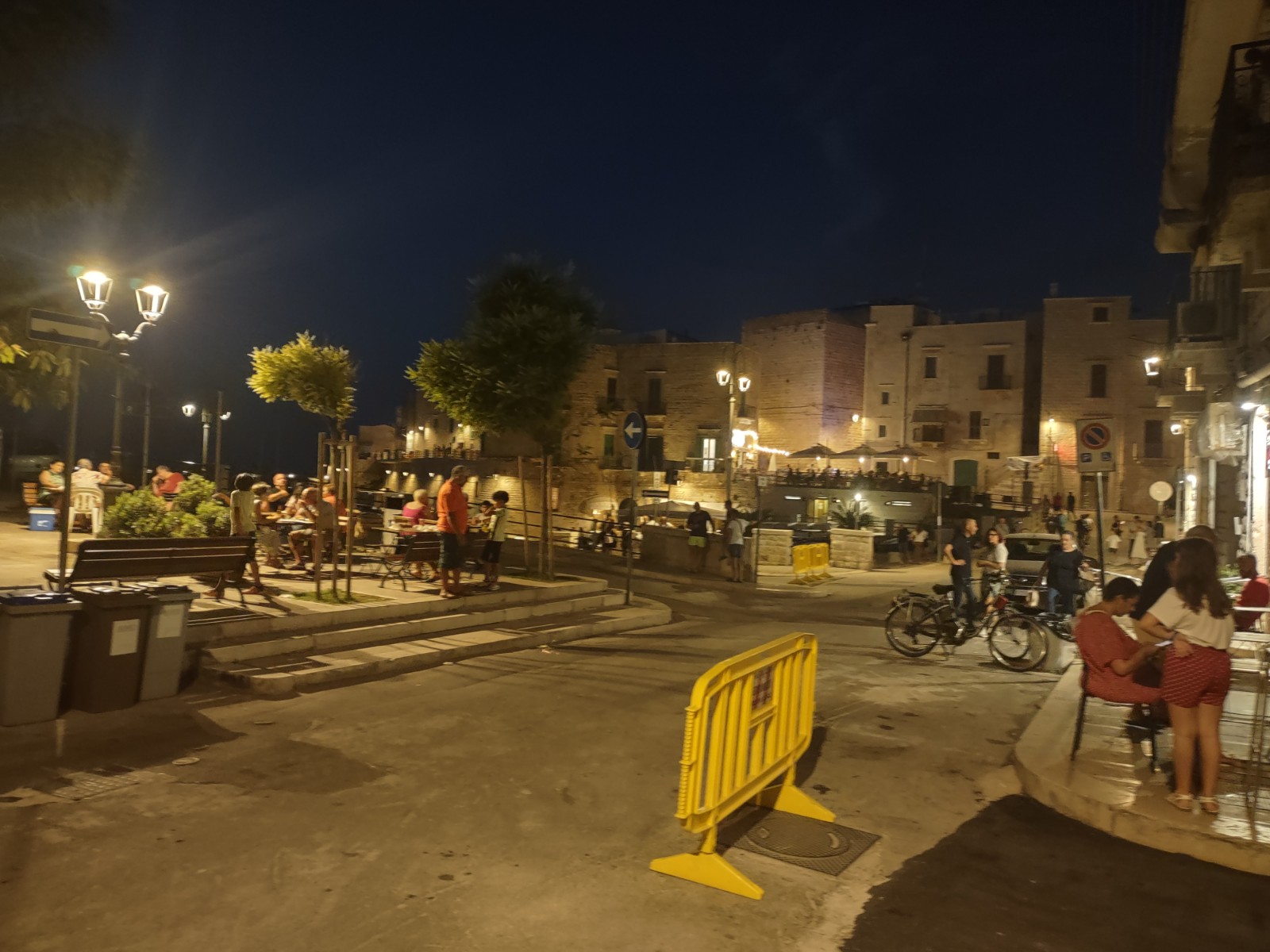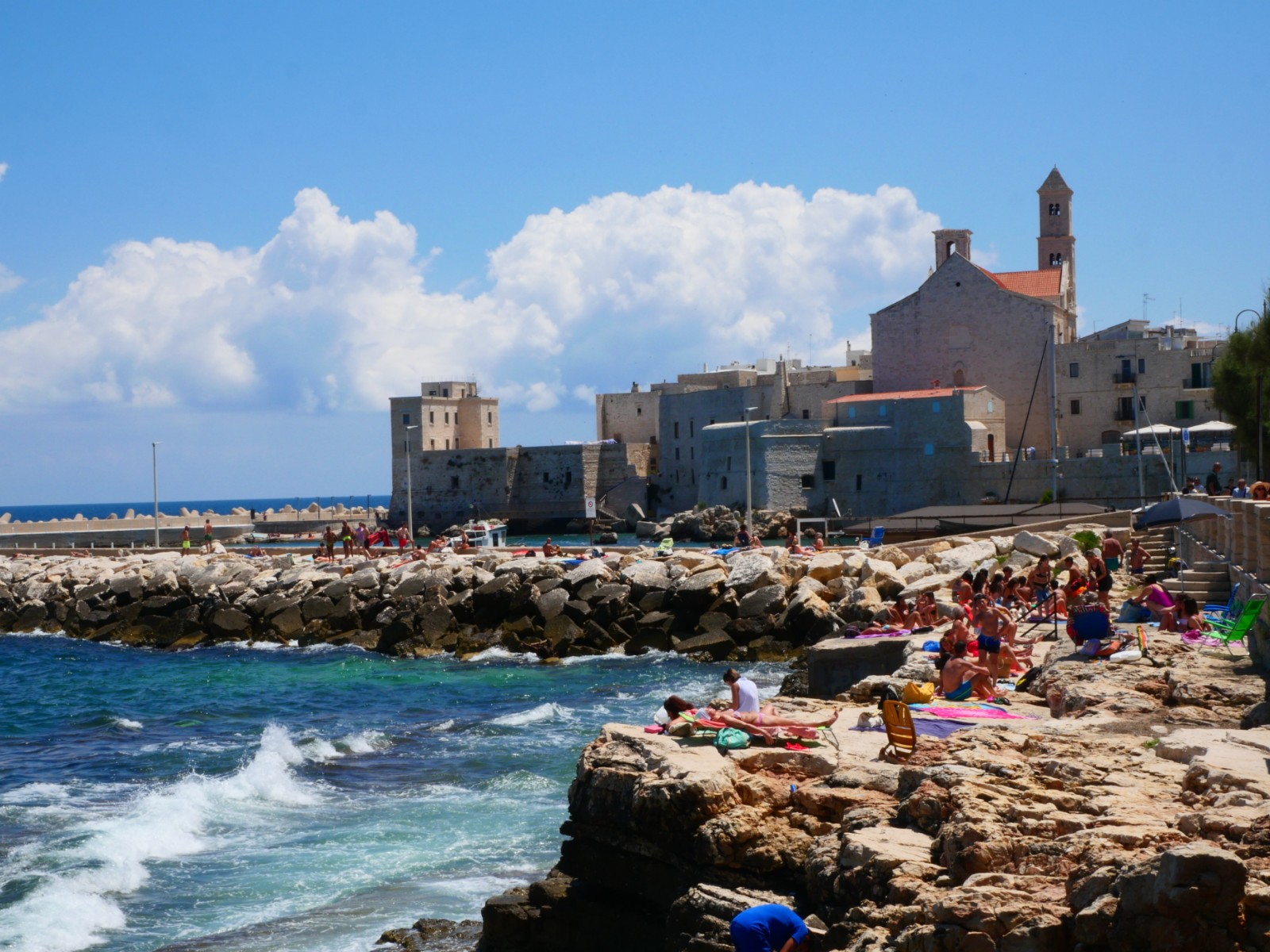 The Town of Giovinazzo turned out to be a very pleasant surprise, a small (pop. 19,000) very traditional Italian seaside town which, during the summer months, caters to Italians on holiday (sort of the Italian equivalent of a traditional Jersey Shore town maybe 50 years ago). During the day, activity tends to be centered around the town’s small harbor which is surrounded on three sides by a number of beautiful old buildings including the 18th century Cathedrale de Santa Maria Assunta, a nice enough Romanesque church, but beautiful in this setting. A nice walkway extends west along the coast from the harbor with small cafes, bars, and restaurants across the road and rocks below which become surprisingly crowded with swimmers and sunbathers during the day.