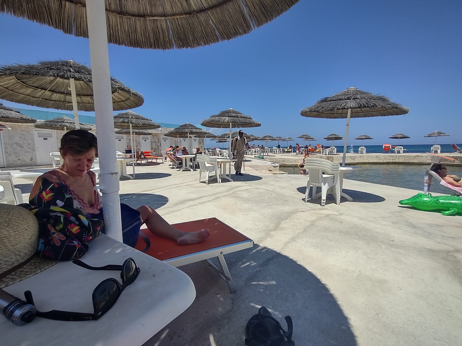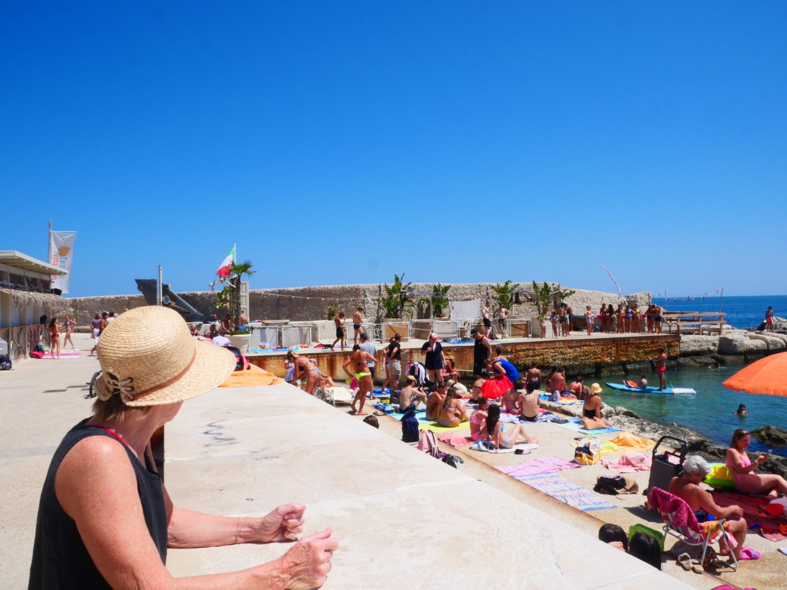 However, beginning in Morocco and continuing through Italy, our normal approach to beaching has been challenged considerably and we have started to find ourselves doing something we never imagined we would – paying to rent beach chairs and an umbrella (sometimes at “private” beach clubs!). In our defense, it has been difficult to find uncrowded public beaches in Italy, including in Giovinazzo, where the beaches are rocks which get pretty crowded and where there is little, if any, shade available. (Also still getting over the sting of paying $30 for an umbrella and two chairs in Giovinazzo when they cost $3 in Taghazout, Morocco!)