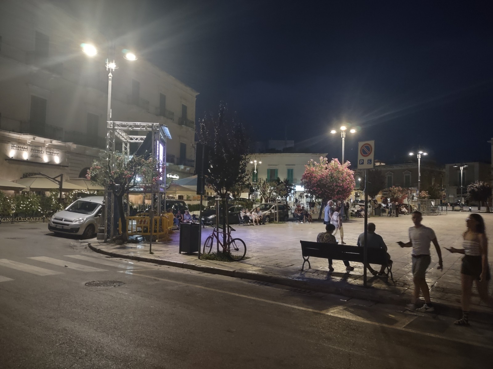At night, while the harbor and seaside remain active, things pick up one block south in the town’s square, the Piazza Vittorio Emanuele II, a large trapezoidal square with a beautiful fountain of Triton in the center of its wide end. The town square is overseen by the Church of San Domenico on one side and municipal buildings on the other, with shops, restaurants, gelateria, and upper story apartments scattered in between. In the evening it seemed like most of the town was out sitting or strolling the square or eating and drinking on its perimeter.