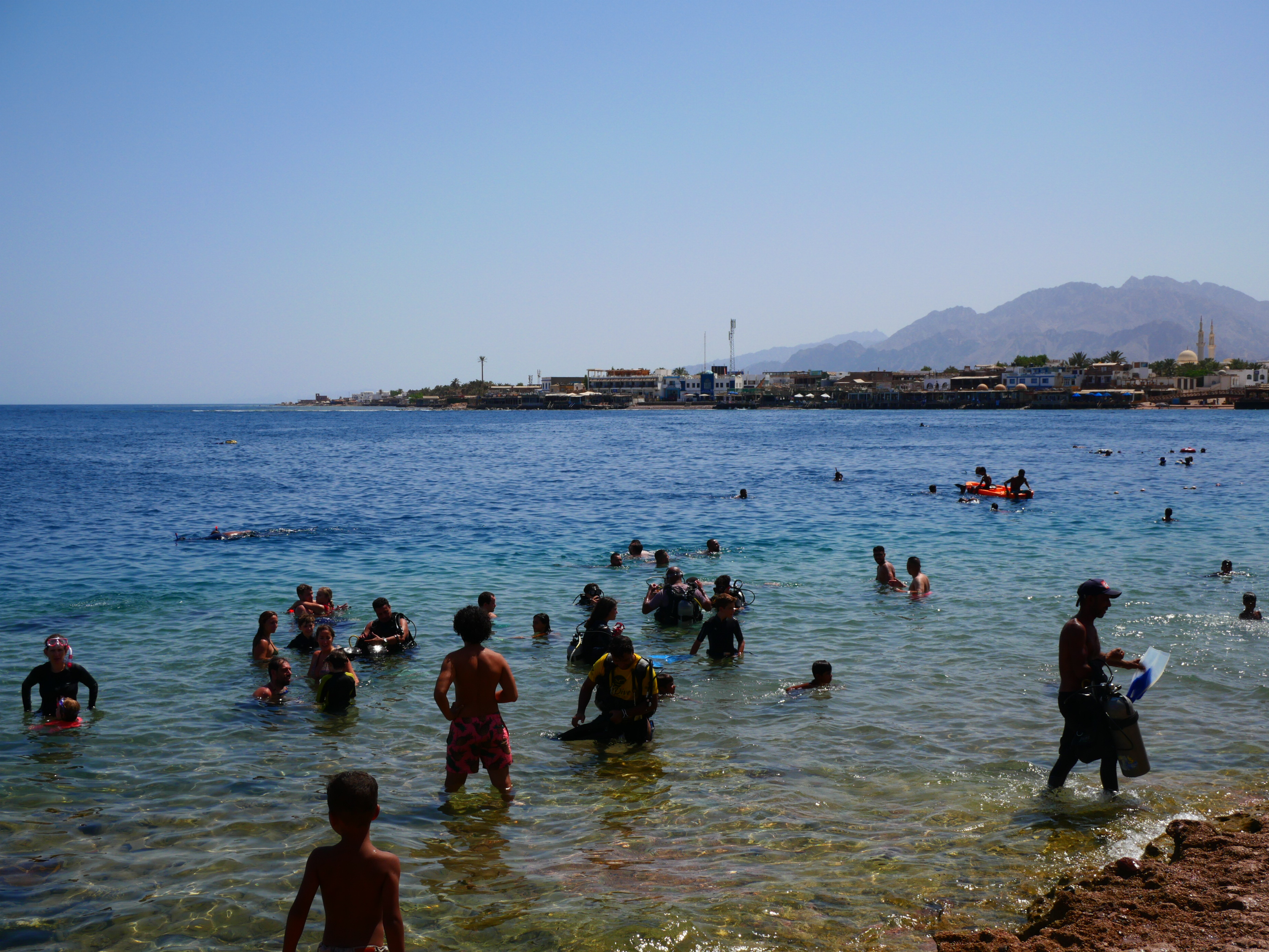 Dahab is a true shore town in that life there revolves around the place where the ocean meets the land and it is this particular intersection of ocean and land that makes Dahab such a unique place. The town sits on a coastal plain which was once the delta of a river with a shallow shelf between its shore and the offshore plunge of the land into deeper water of the Gulf of Aqaba with beautiful coral reefs along its edge, making it an ideal place for snorkeling and diving with the reefs so easily reached from the shore. Even the shallow shelf immediately off the beach teems with colorful tropical fish, though not in the numbers you see when snorkeling along the large coral reefs at the shelf’s edge. One of the best dive spots in Dahab is a place called the Lighthouse which was located about 50 meters from the public beach at the center of town where there was a steady stream of snorkelers and lots of divers entering and exiting the water throughout the day and even a few doing night dives.