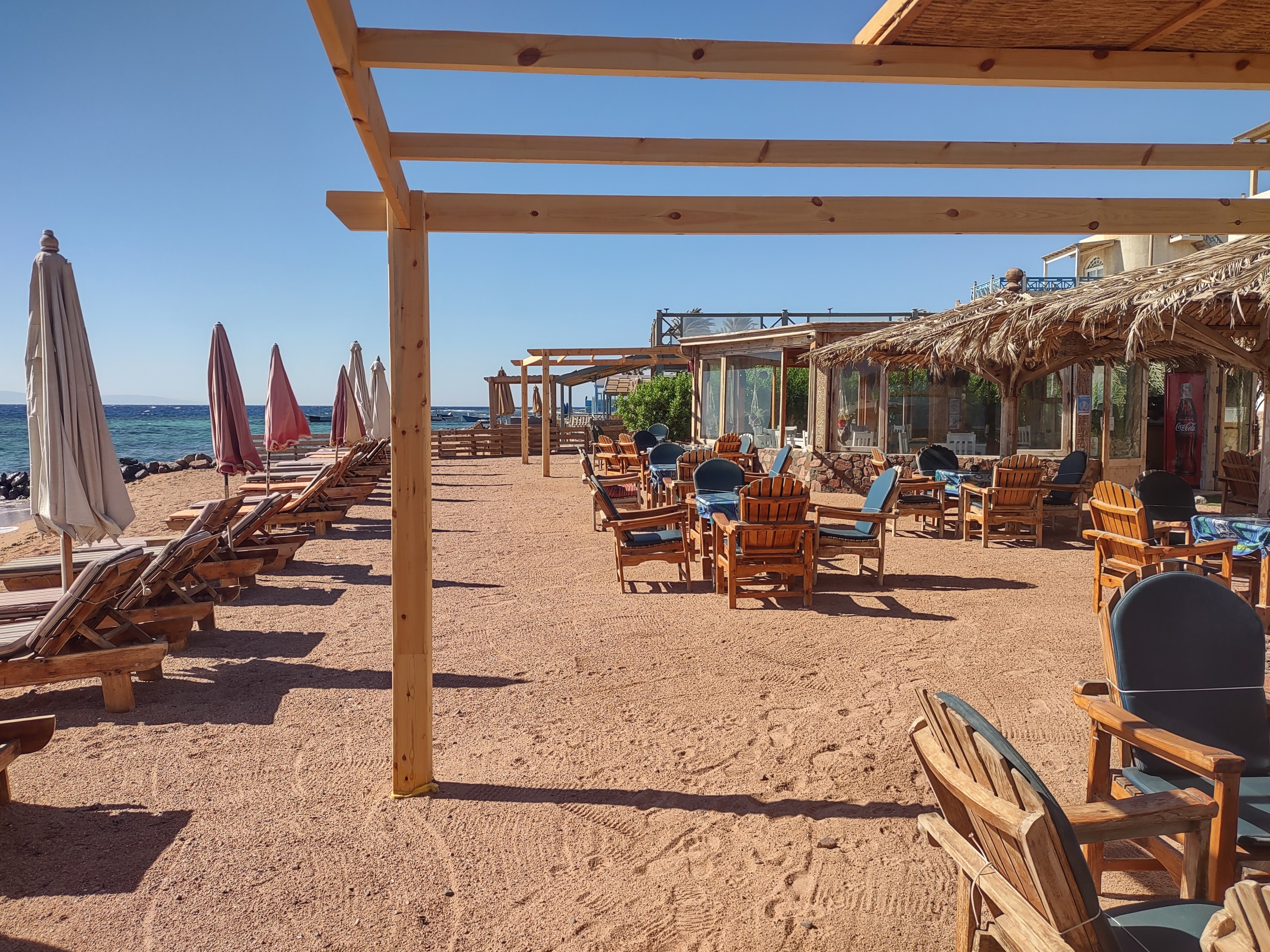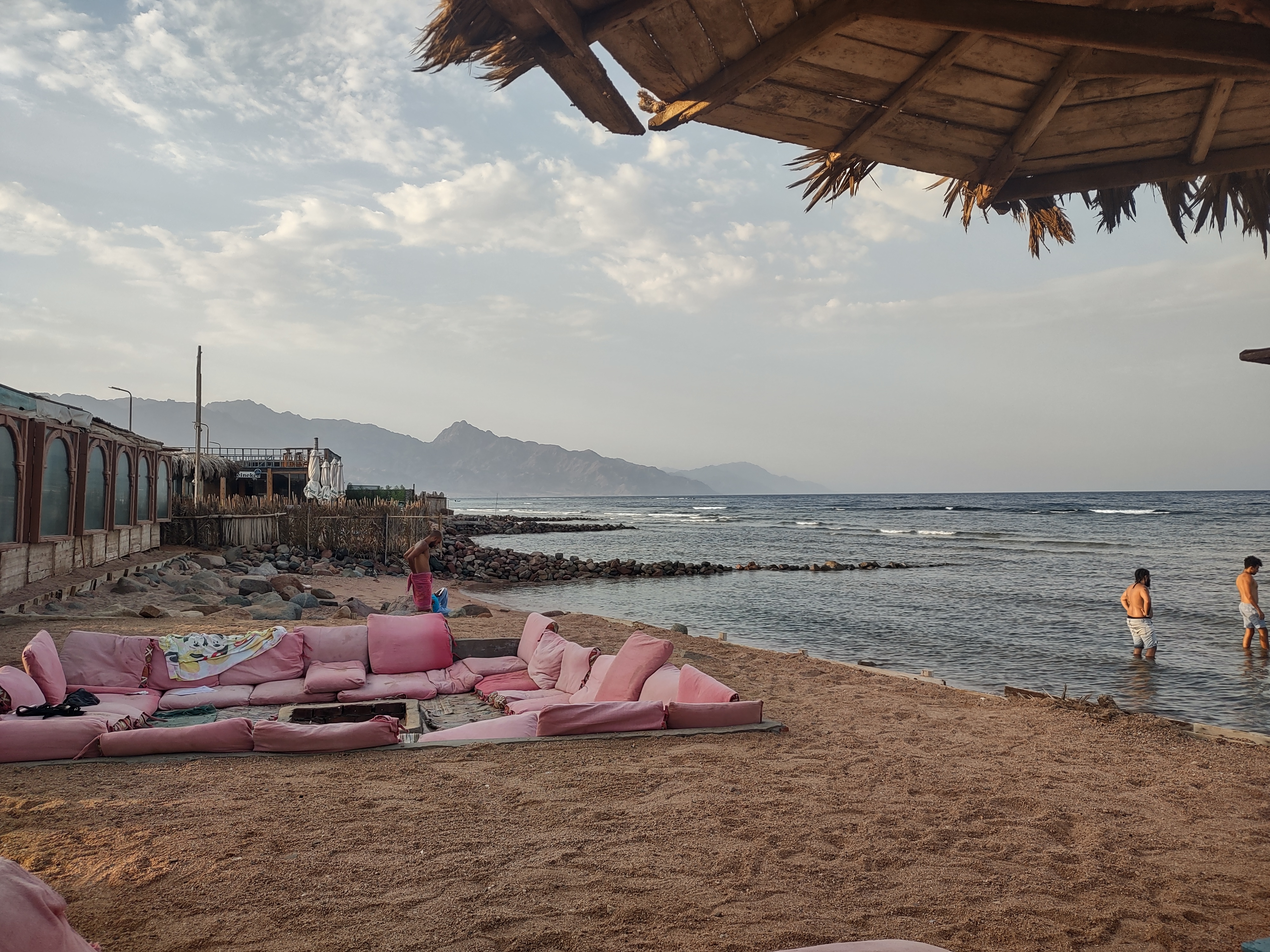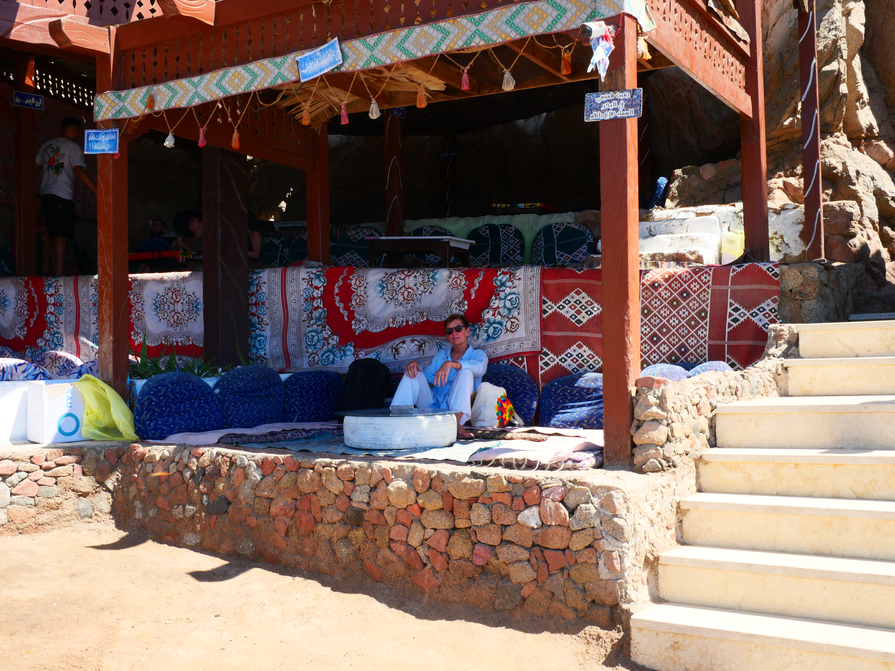 We came to Dahab looking for some deep relaxation, but it took us just a little while to find our stride feeling a bit like the story of Goldilocks and the Three Bears. Over the course of our first week in Dahab, we sampled a good number of the hang-out spots up and down the promenade, which varied quite a bit from one another both in terms of food and ambience. South of town, the beach-side lounges were nice but tended to be very Arab (meaning few or no women and no women in western bathing suits). The ones in the center of town had access to some great snorkeling but no beaches, with their sun loungers packed together side by side. They also had a tendency to play louder more obnoxious music as the day progressed.