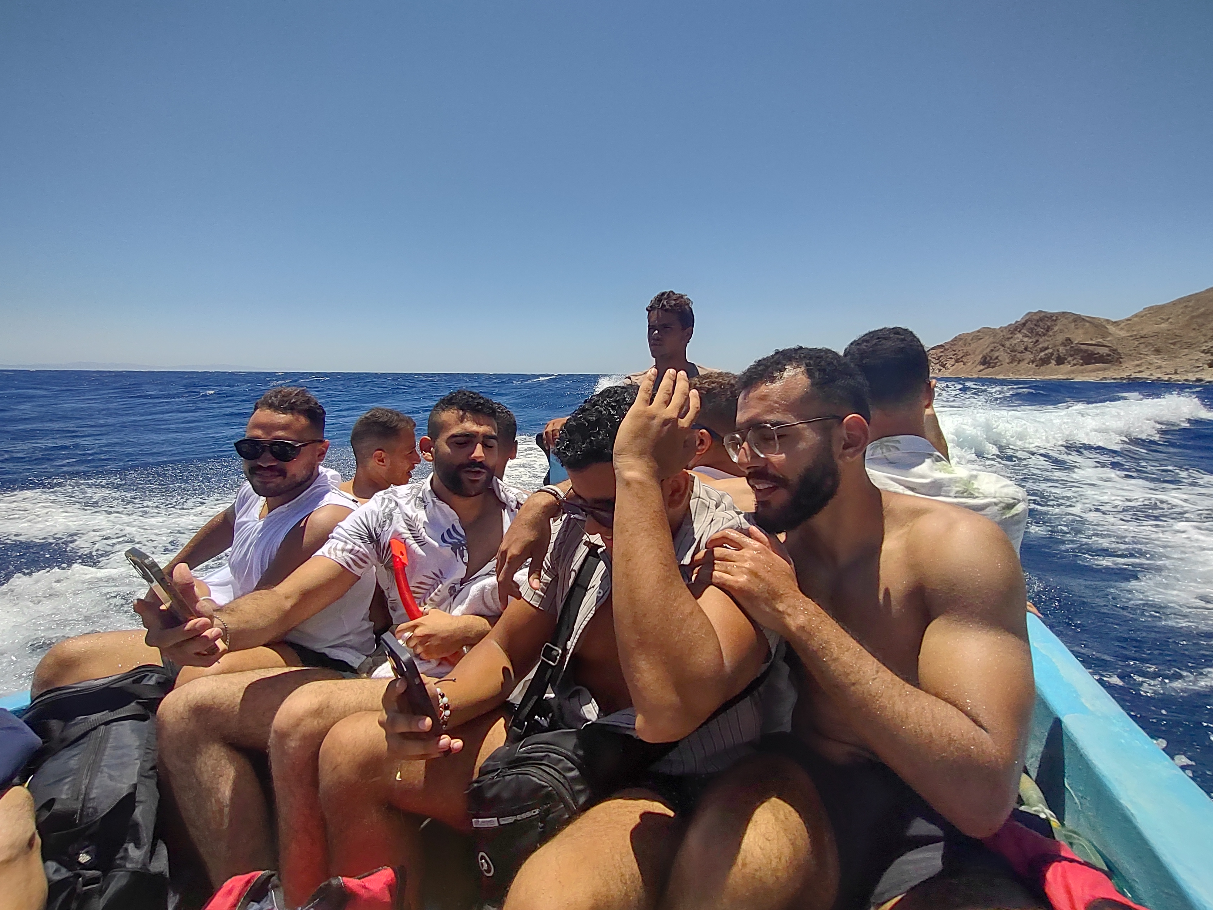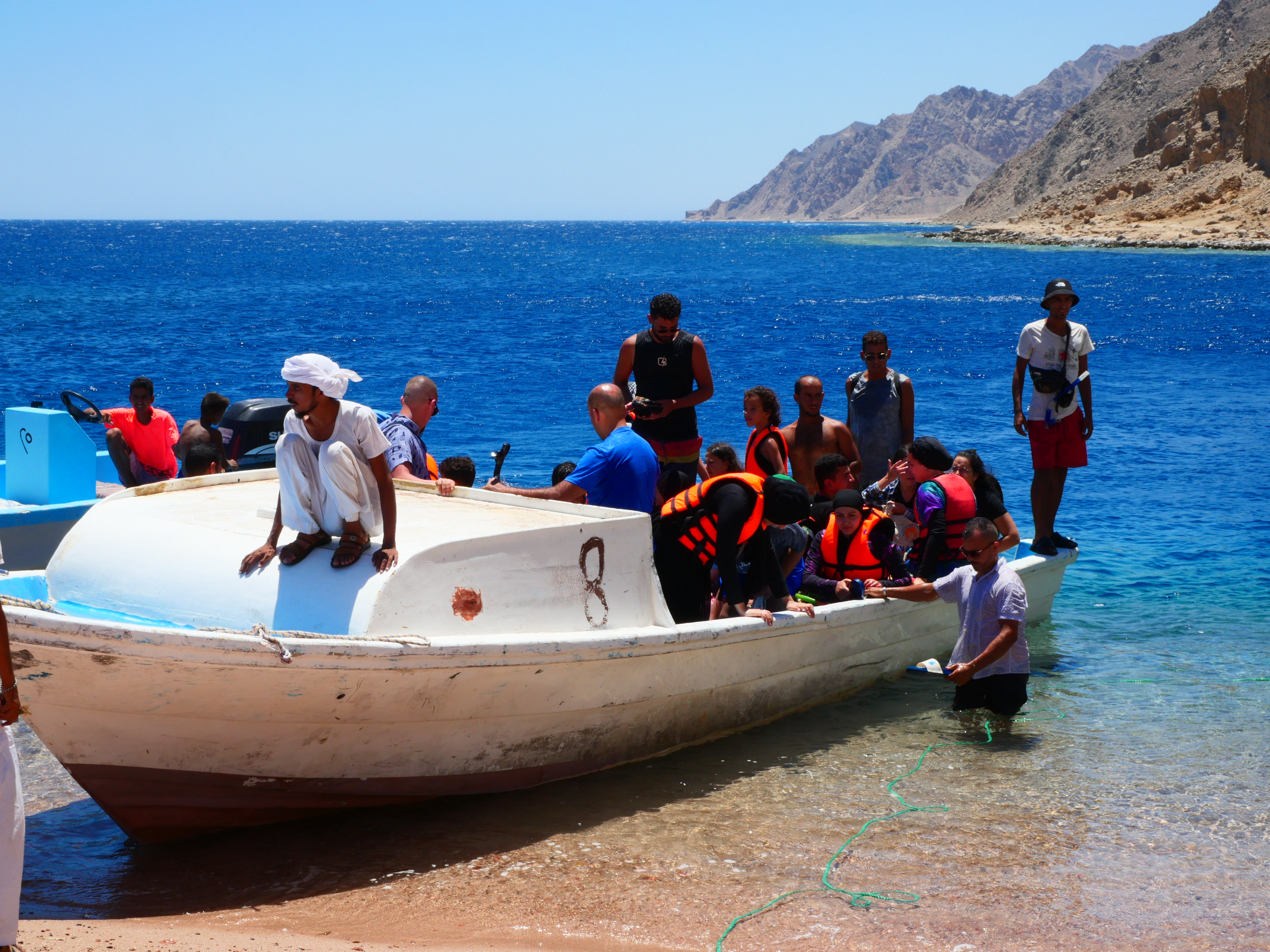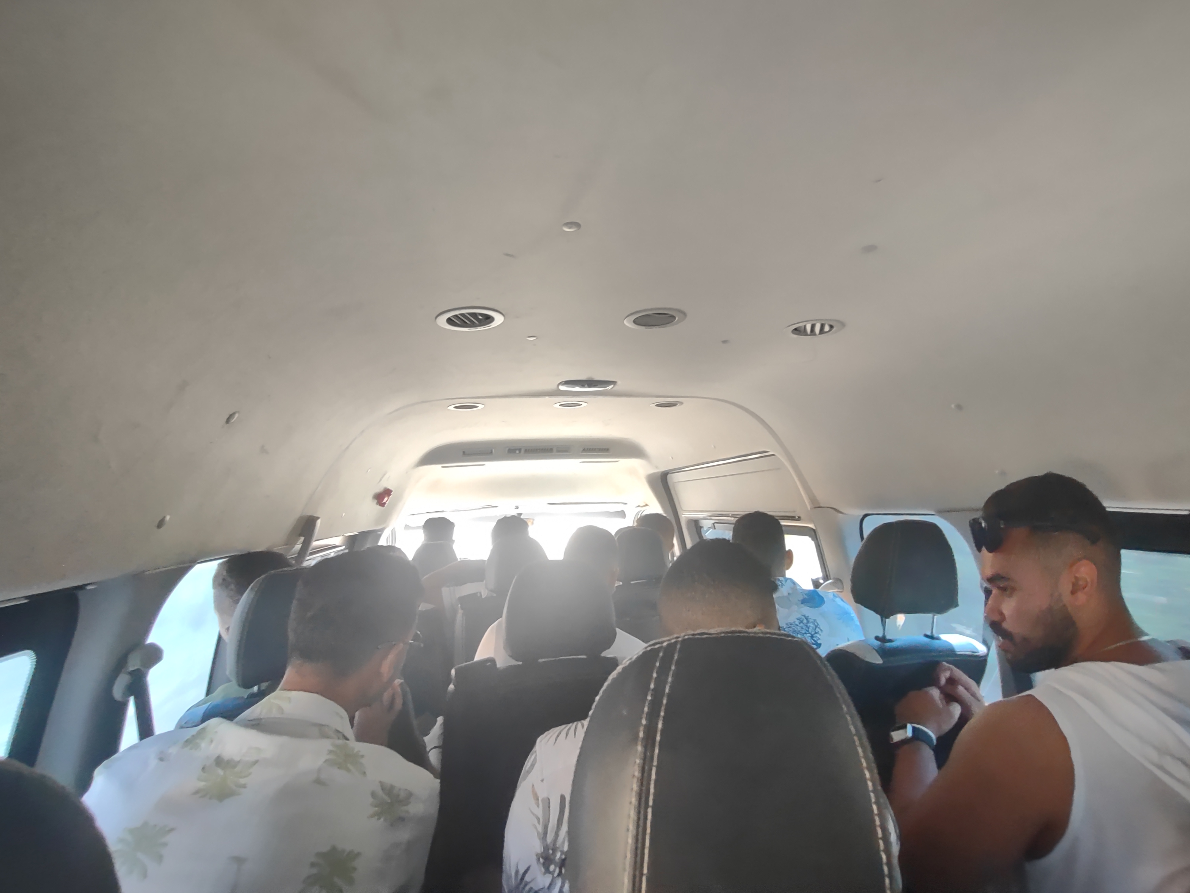 As we neared the Blue Hole and approached a security gate, everyone in the van began talking and gesturing and we eventually figured out that we should have brought our passports and, along with Melanie, were sent to the last seat in the back of the bus and told to keep our heads down. After a bit of scrutiny by someone in a security uniform and a bit of conversation we were sent on our way. As the Blue Hole and its shanty town came into view up the coast, you could feel a rise in energy in the mini bus (perhaps at least partly due to the Red Bulls which some of the bachelor boys were shooting).