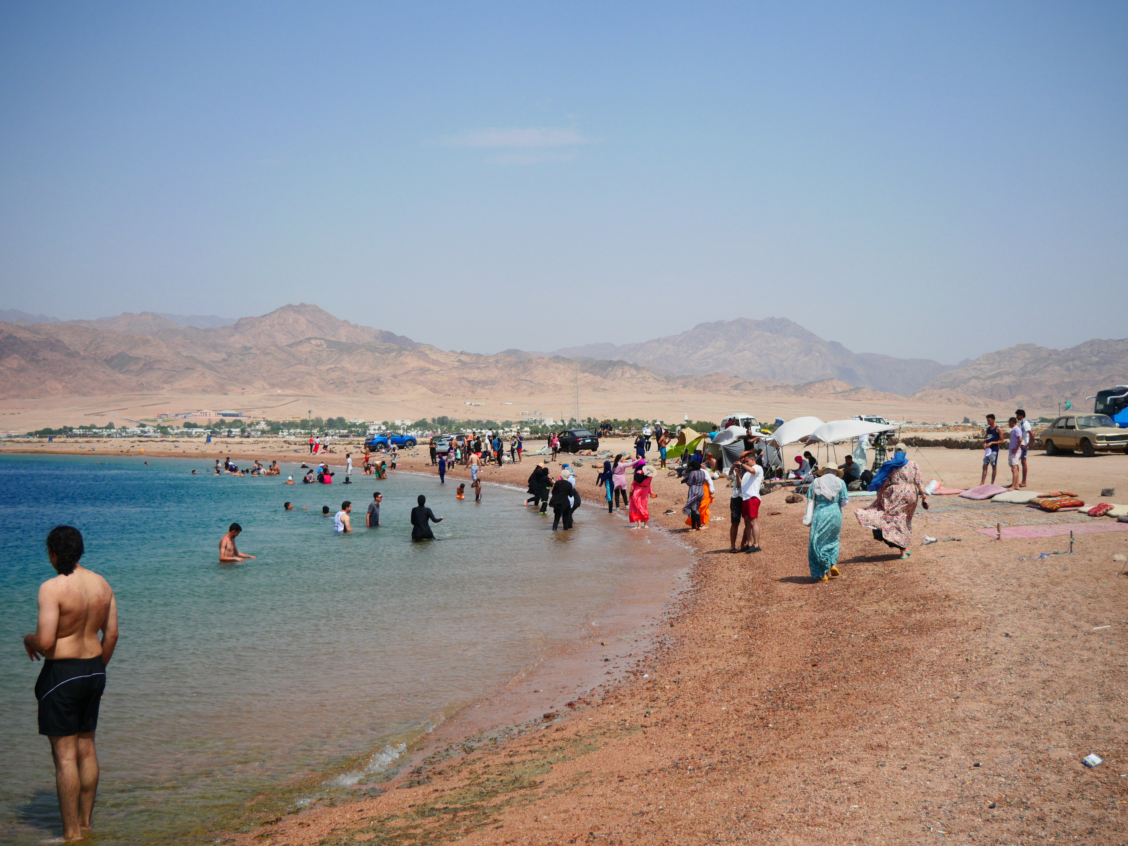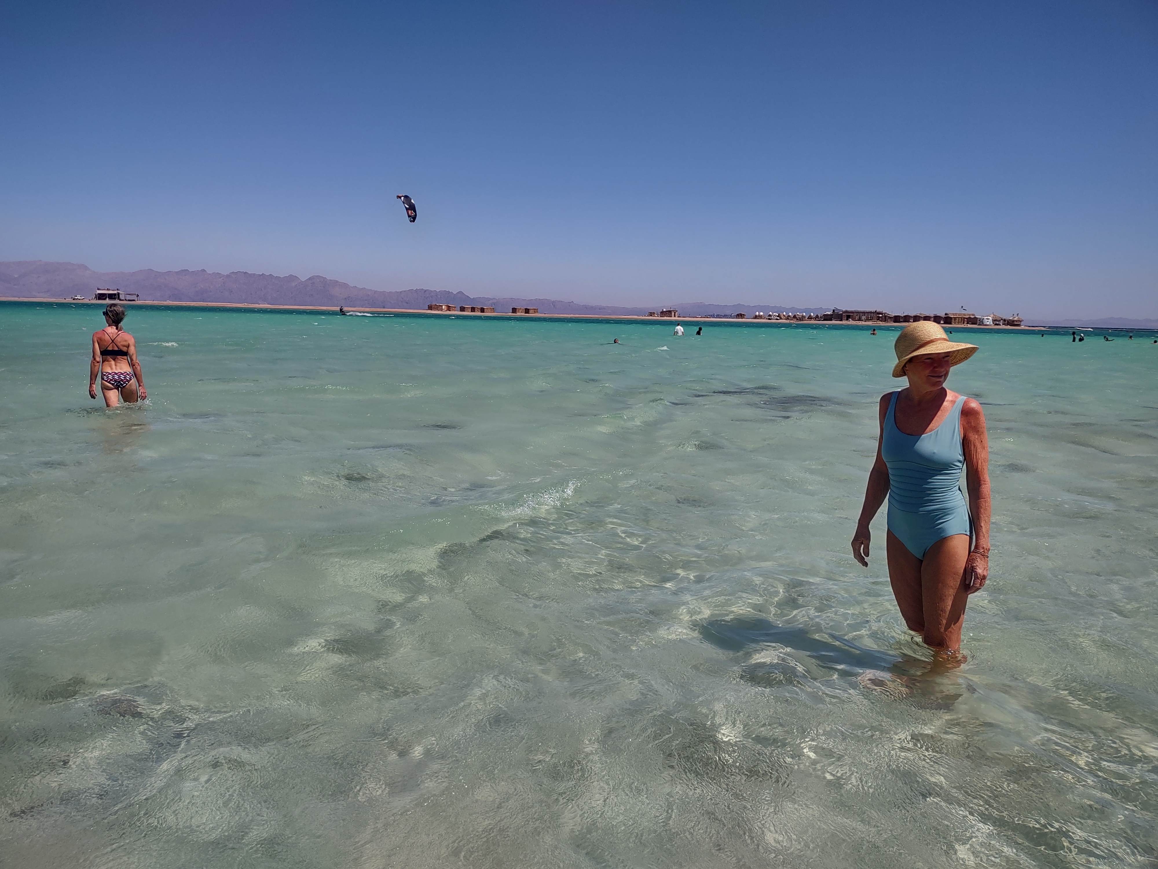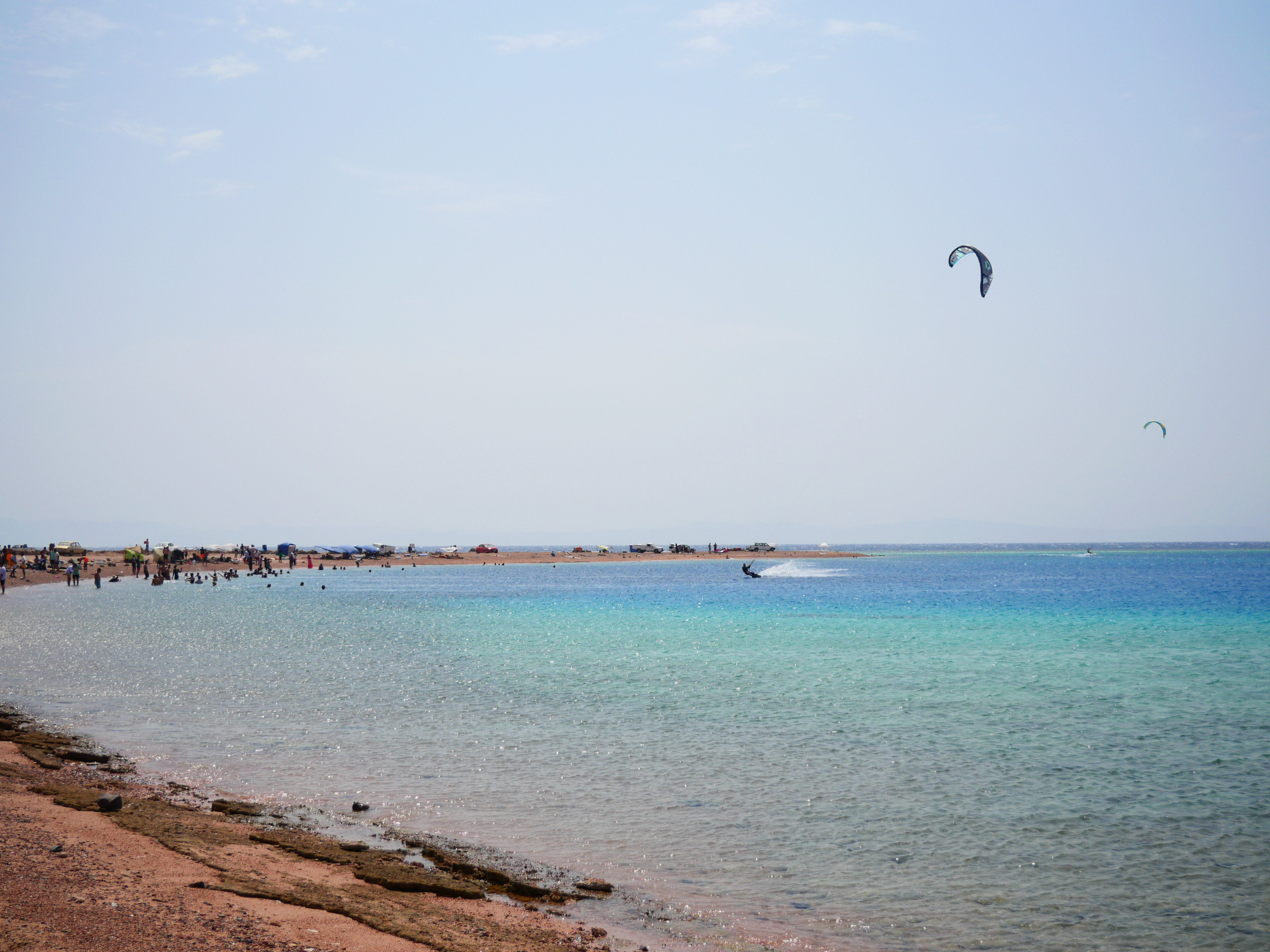A bit later in our stay, we rode our bikes south to a place on the far south side of Dahab called the Laguna Beach, a picturesque spot with a sand spit and a large tidal pool behind, which is one of the more popular spots in the area for sail boarding and kite surfing. We rode to Laguna Beach early on a Sunday and finding it fairly deserted, we rented a makeshift shelter from a nice Bedouin lady and settled in but, as the day moved on and the tour buses began to arrive, we discovered that the Blue Lagoon is a very popular spot for Egyptians (we only saw one other non-Arab couple there).
