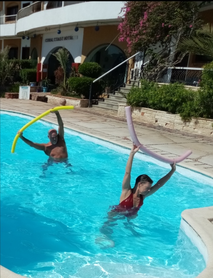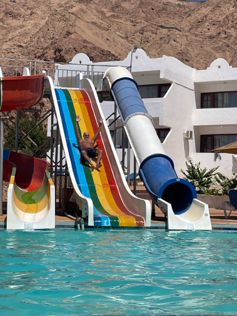 Our other go-to hangout in Eel Garden was the Coral Coast Hotel which was located just around the corner from our place. We actually had our first dinner in Dahab there and didn’t particularly care for the food, but they had a regular yoga program which Colleen utilized and also a three-day-a-week aqua fitness program which both of us became regular participants in. As I mentioned earlier, the aqua fitness program not only provided exercise but also allowed us to hang out a Coral Coast’s pool (an important part of our keeping cool program) 3 mornings a week and we became friends with the instructor Jessi, a British expat who came to Dahab seven years ago and never went back.