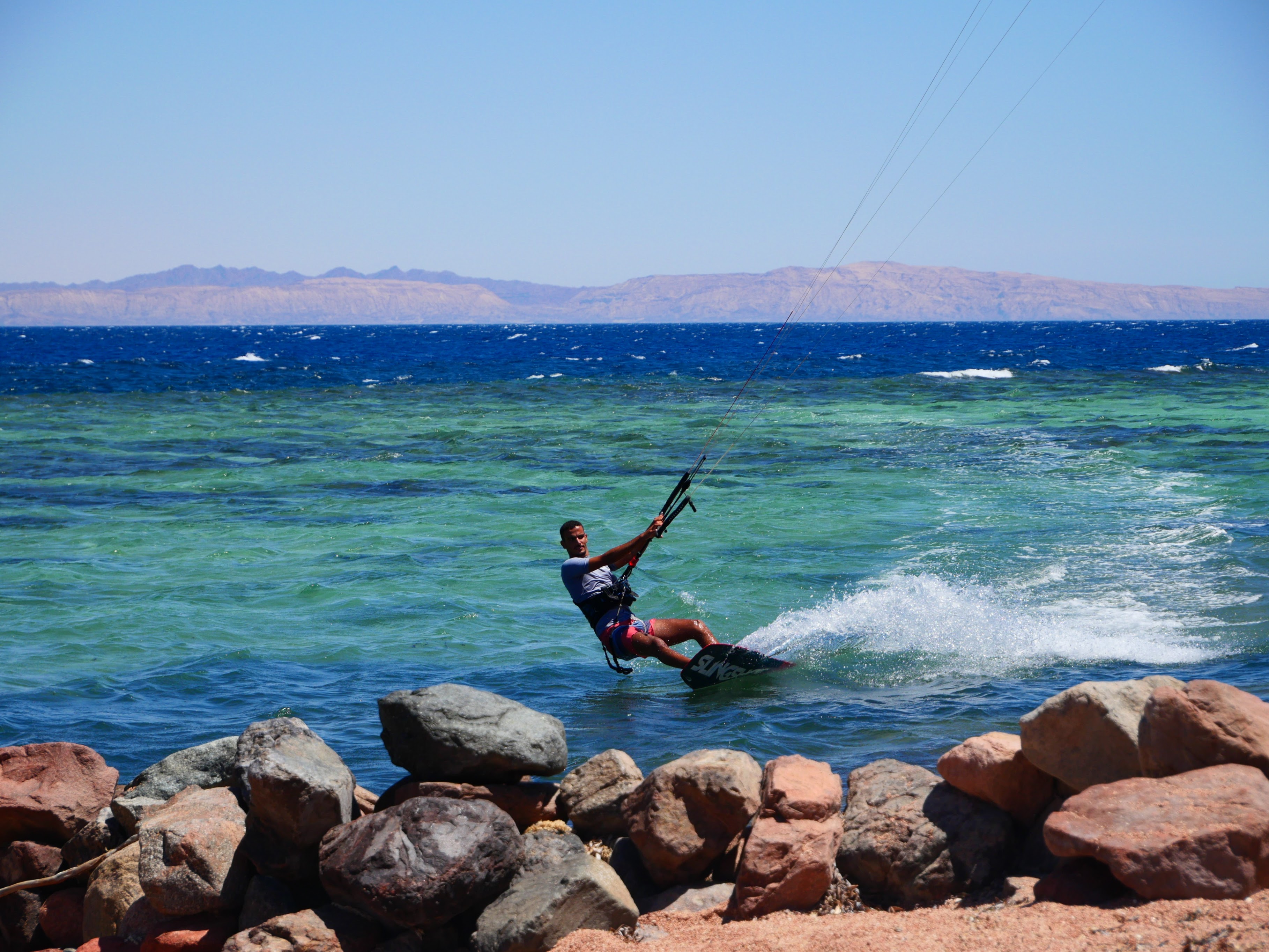 Dahab, Egypt is a small shore town with about 15,000 residents located in a fairly remote part of the South Sinai peninsula on a coastal plain which projects from the adjoining Sinai Mountains into the Gulf of Aqaba off the Red Sea, with the mountains of Saudi Arabia rising from the far shore about 20 miles away. Dahab had existed as a fishing village for centuries before being discovered by world-wandering hippies in the 60’s. Dahab’s development went a bit on hold during Israeli occupation of the South Sinai, but resurged during the 1980’s and 90’s as it became a world-renowned diving, snorkeling, windsurfing and (more recently) kite surfing destination. While Dahab has grown and developed as a tourist destination, it still has a very bohemian feel and is considered by some to be the hippest place to be on the Red Sea.
