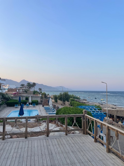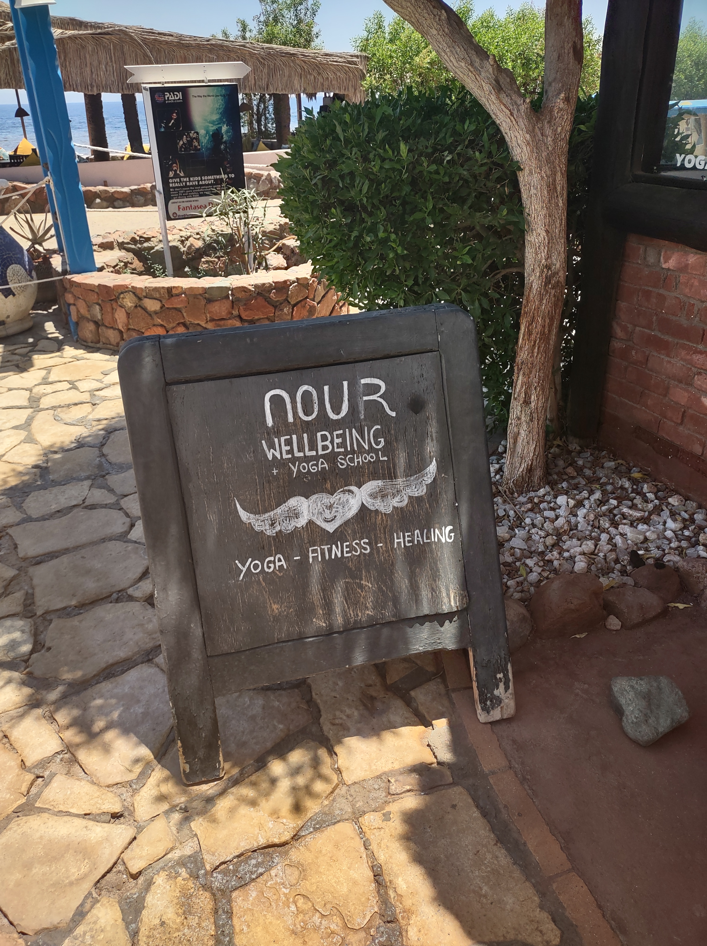 Knowing that we were to spend a month in Dahab, finding yoga was high on my list of to do’s. Right off the bat I came across Nour Wellbeing, which was a yoga and fitness organization running out of a seafront hotel, the Coral Coast Hotel, a mere 2 minute walk from our place. Turns out Nour Wellbeing offered a whole range of yoga and fitness related classes, several different ones every day! I don’t think I missed many days during our 30 day hiatus. The range that was offered included Hatha yoga, Yin yoga with sound healing, and a vigorous Vinyasa class, in addition to a stretching class and a strong favorite, aqua fitness (it was in the 100’s for many days of our Dahab stay). The yoga studio on the top of the hotel, with magnificent views of the sea, and large windows opened to allow the at times very strong breeze to blow through was one of the best yoga shalas I have practiced in, and at this point, that is saying a lot!