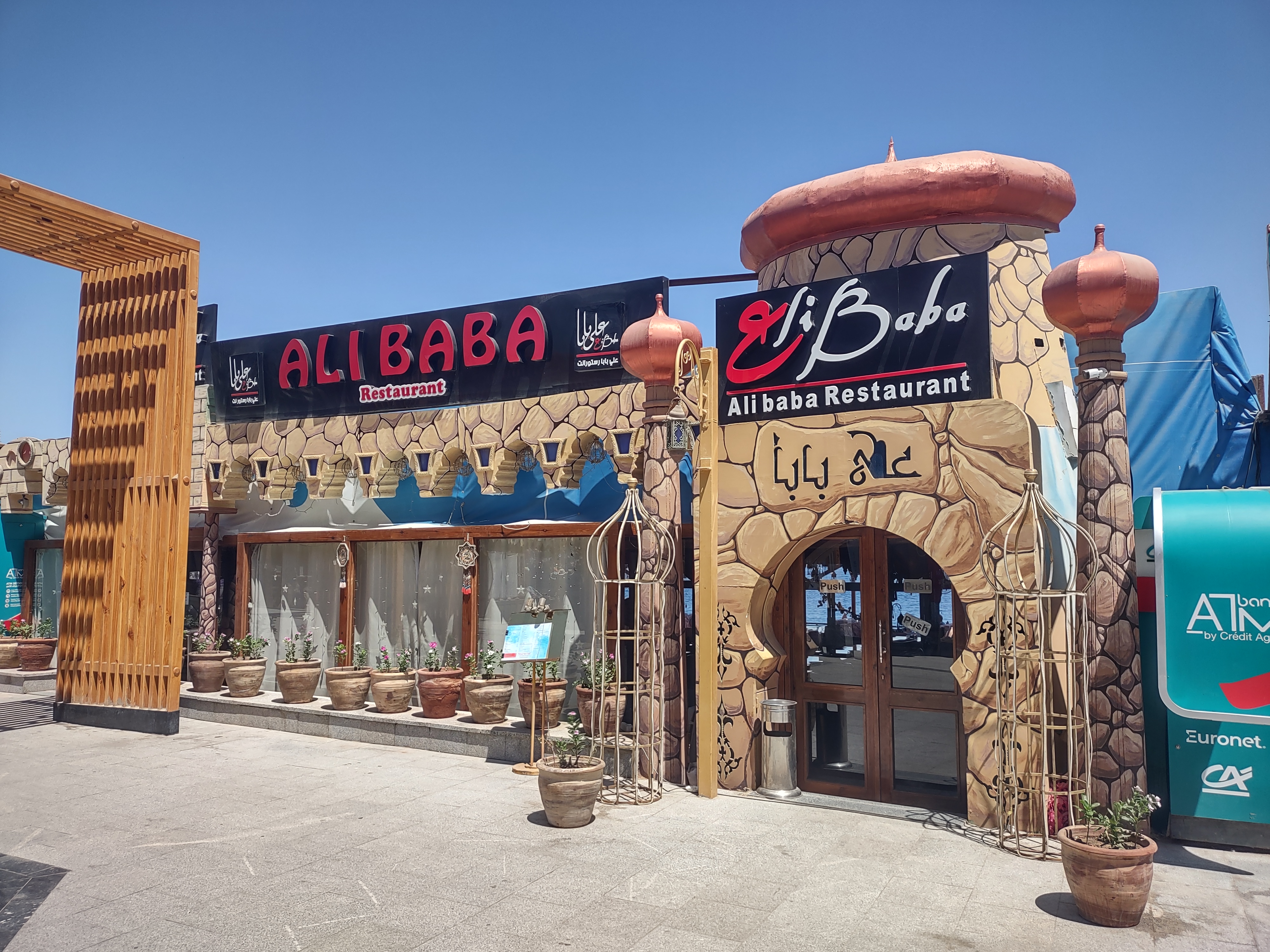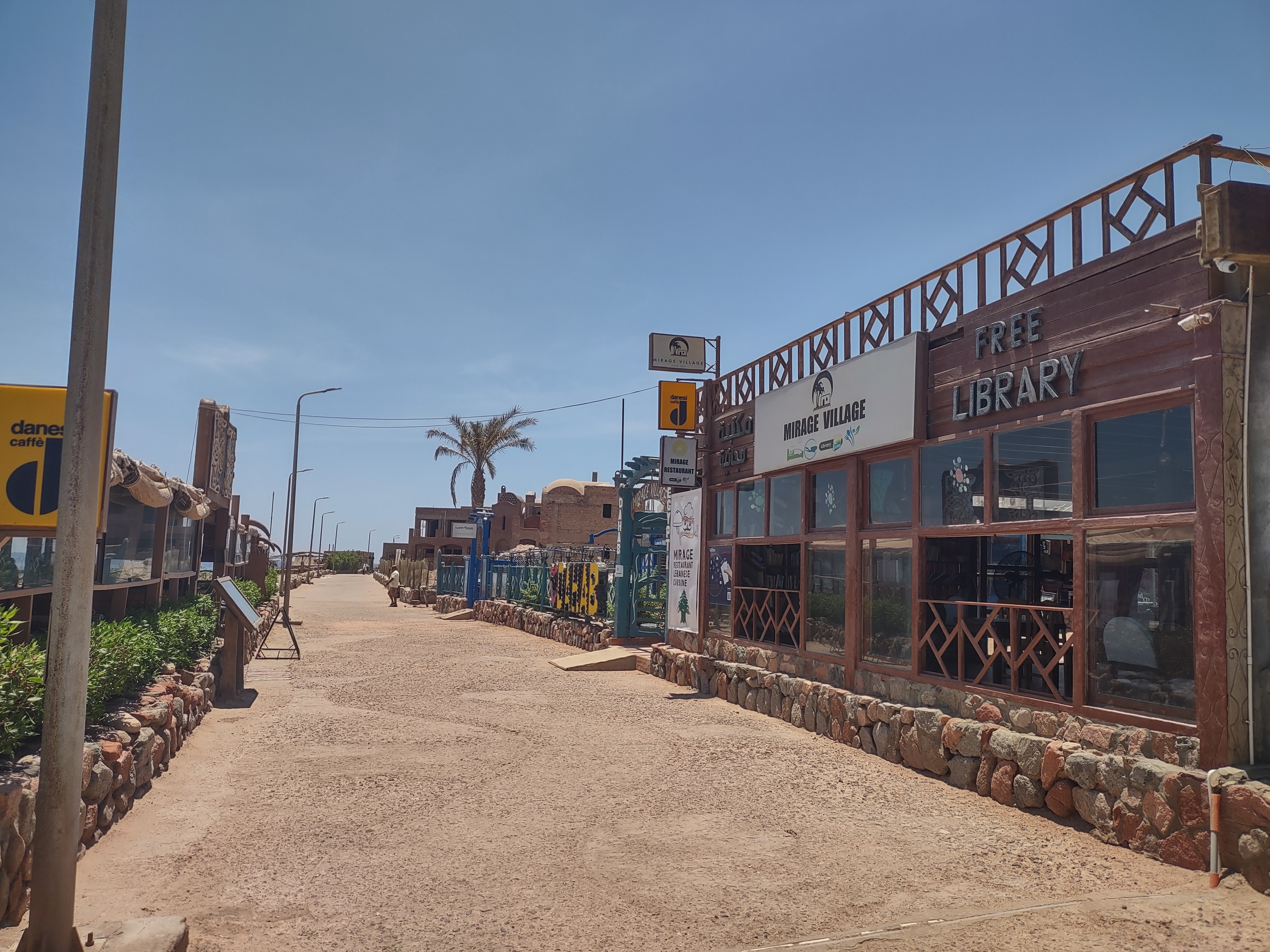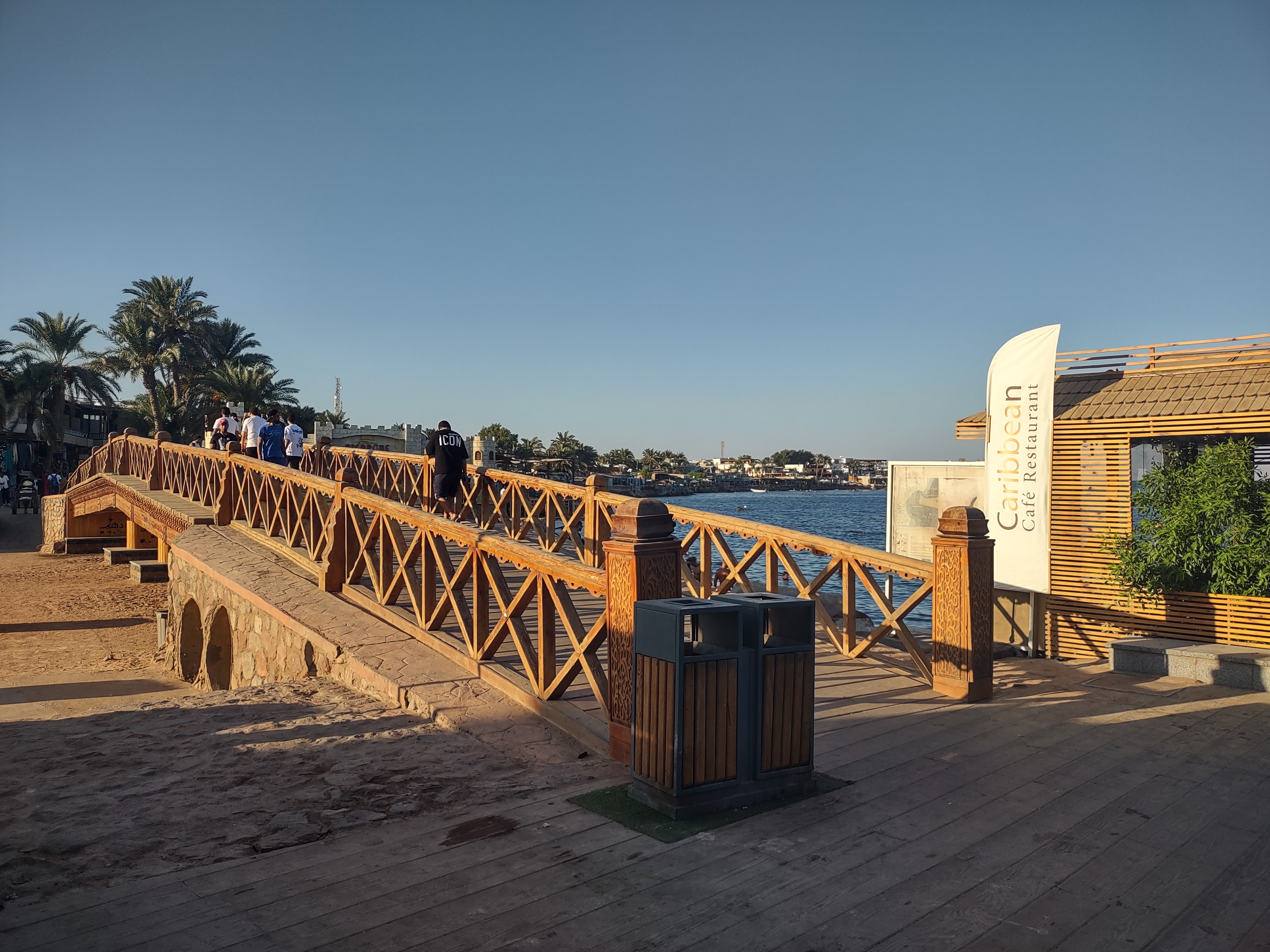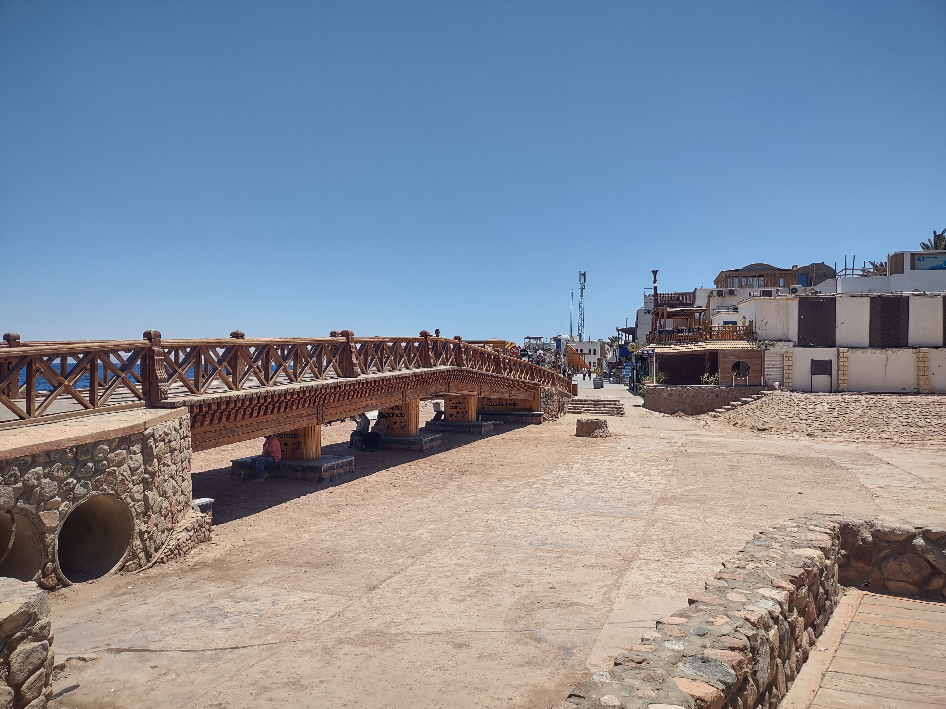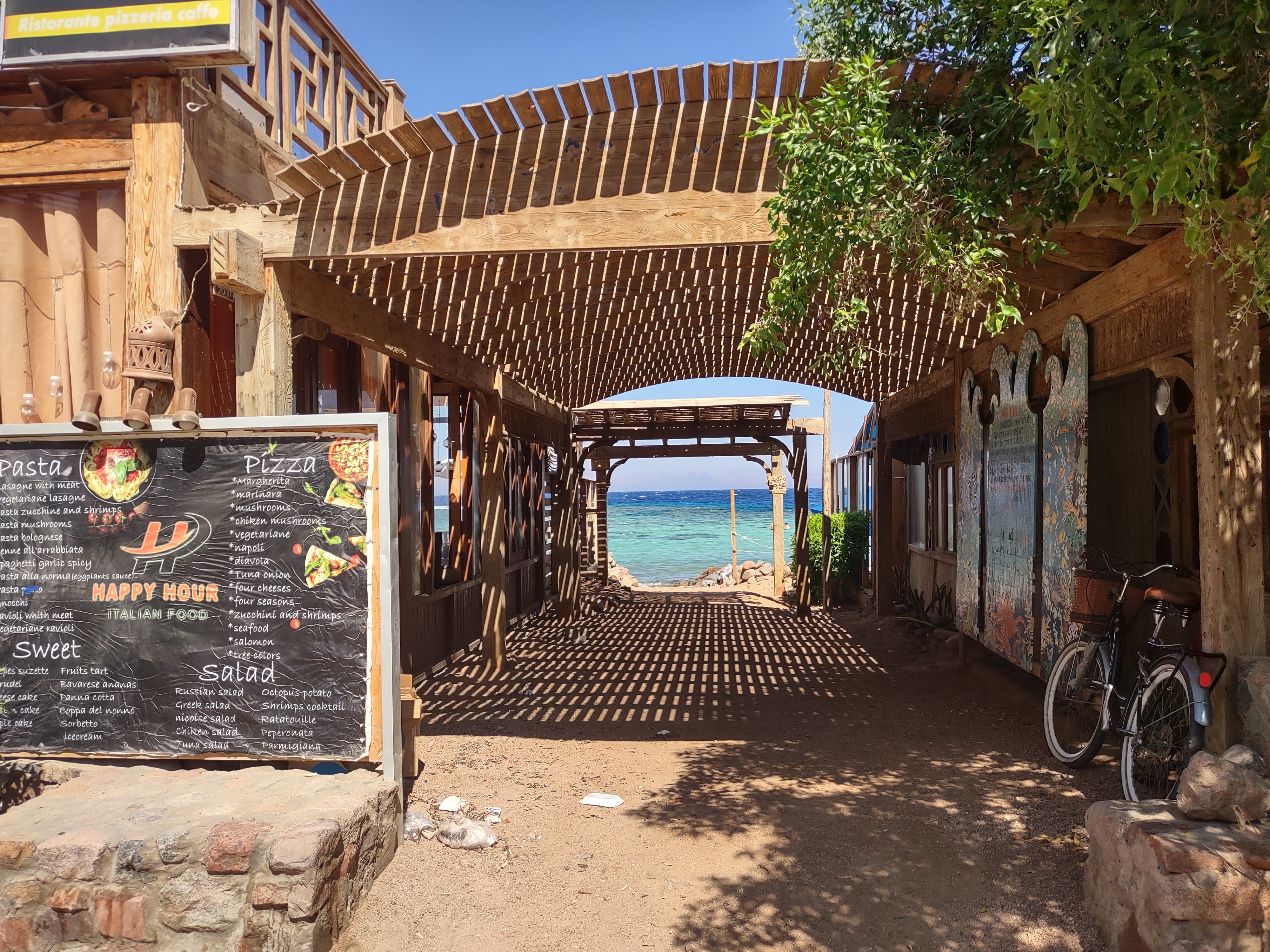 Dahab’s most noteworthy feature is a Promenade which runs along the coast starting in the suburbs north of Eel Garden, takes a loop around the old harbor and beach at the center of town, and then continues down the coast to Laguna, a large sand spit and lagoon at the southern end of town. For most of its length, this Promenade is closed to vehicular traffic and is lined with hotels, restaurants, and shops. North and south of the center, the most typical arrangement is for the hotel to be located on the west (land) side of the Promenade with a main entrance from the adjoining street front and a separate shaded dining area on the east (ocean) side of the Promenade, many with a beach area equipped with loungers and umbrellas. While the water-front dining and sunbathing areas are intended for use by hotel guests, they are also available to restaurant customers, sometimes with a minimum charge per person.