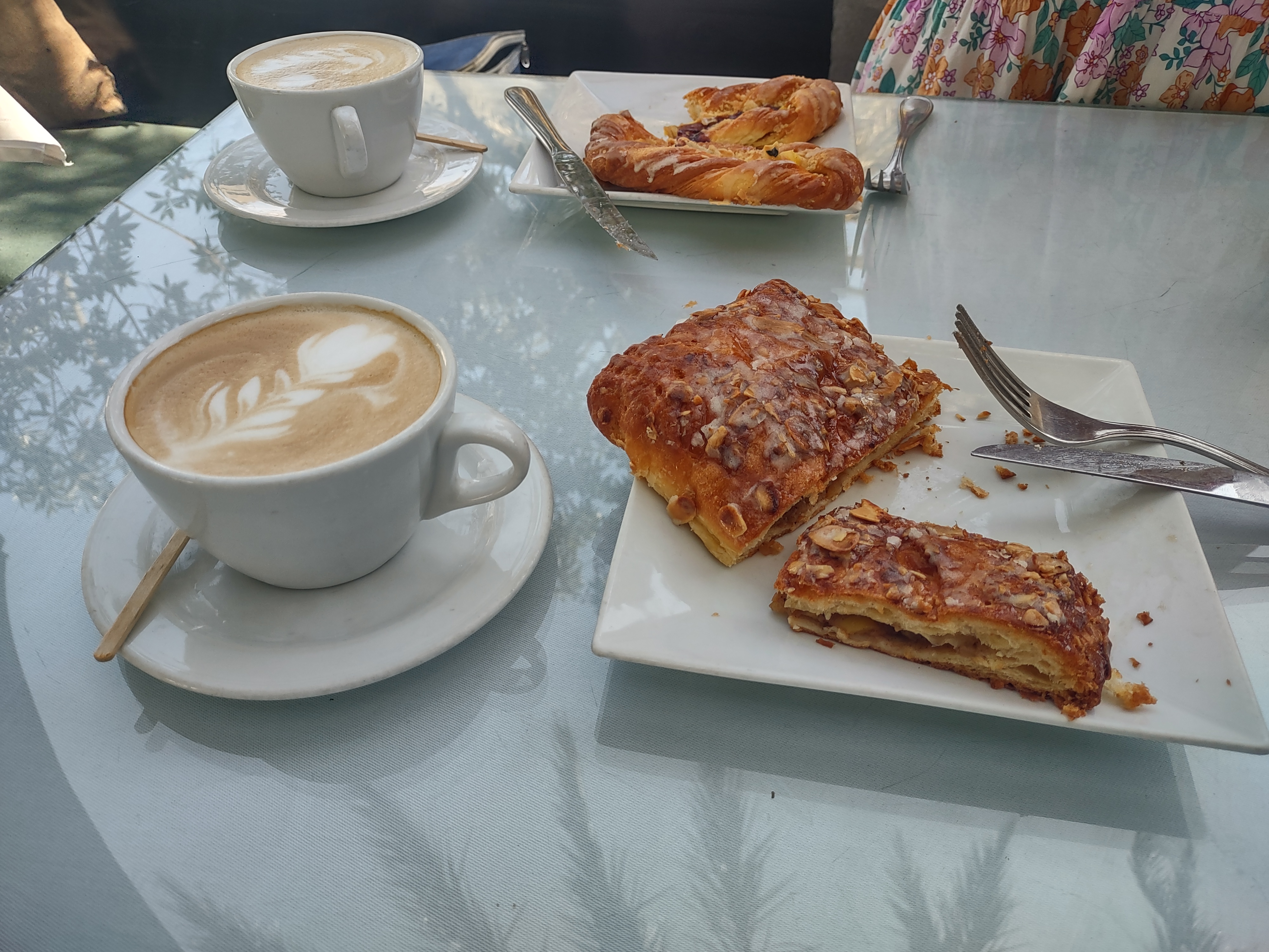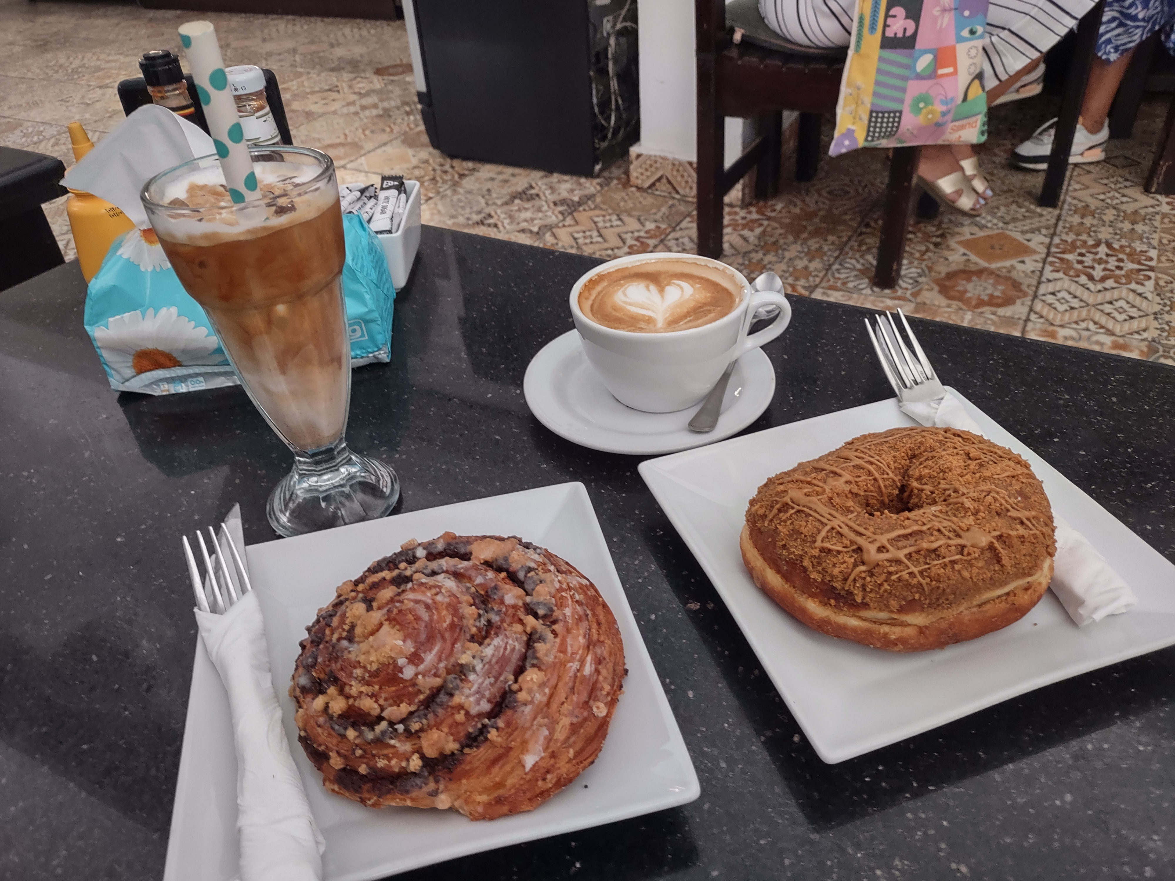 We found two great places for breakfast, each of which we hit about once a week. There was a place called Ralph’s German Bakery which had great coffee and a delicious line-up of pastries (the Lotus Donut – on the right in bottom right photo below was the best!) as well as some good breakfast platters and, best of all, they had a location in Eel Garden near our place as well as another near the center of town. The one in town had a gym above which led to some interesting juxtapositions of people and activities.