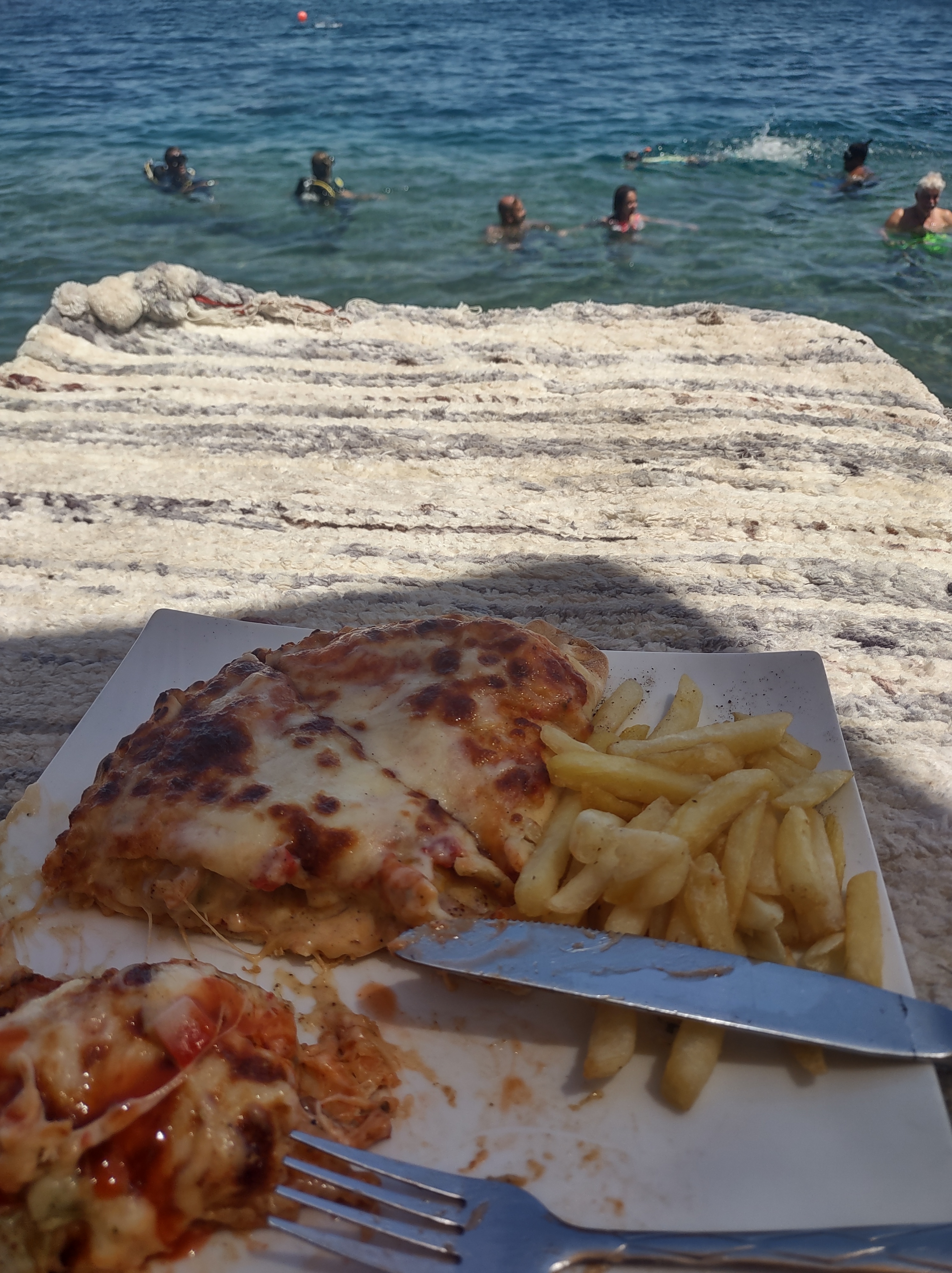 Lunches, which we usually ate at Dive Urge or one of the other waterfront restaurant/lounges, were kind of challenging. While most of the places offered similar lunch and snack items (sandwiches, pizza, calzones, etc.) none of them were particularly good and it was hard not to end up having a too-big-for-lunch entrée. I spent the entire time there unsuccessfully trying to satisfy an urge for a good burger and finally gave up after three or four attempts. I ended up eating a lot of grilled calamari in salads and other forms for lunch. Oh, and French fries (the ubiquitous “chips”) come with pretty much everything at lunch (if you order chips, they come with chips).