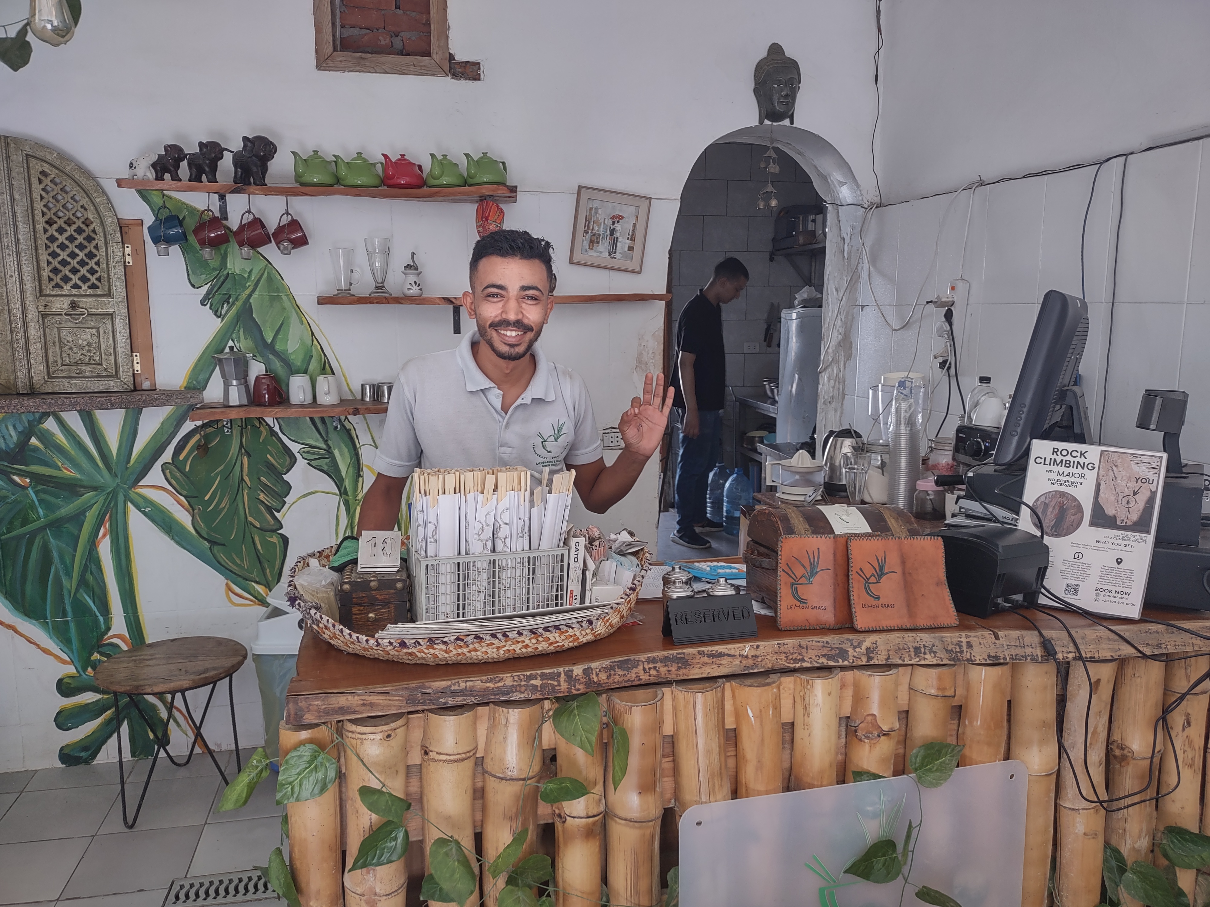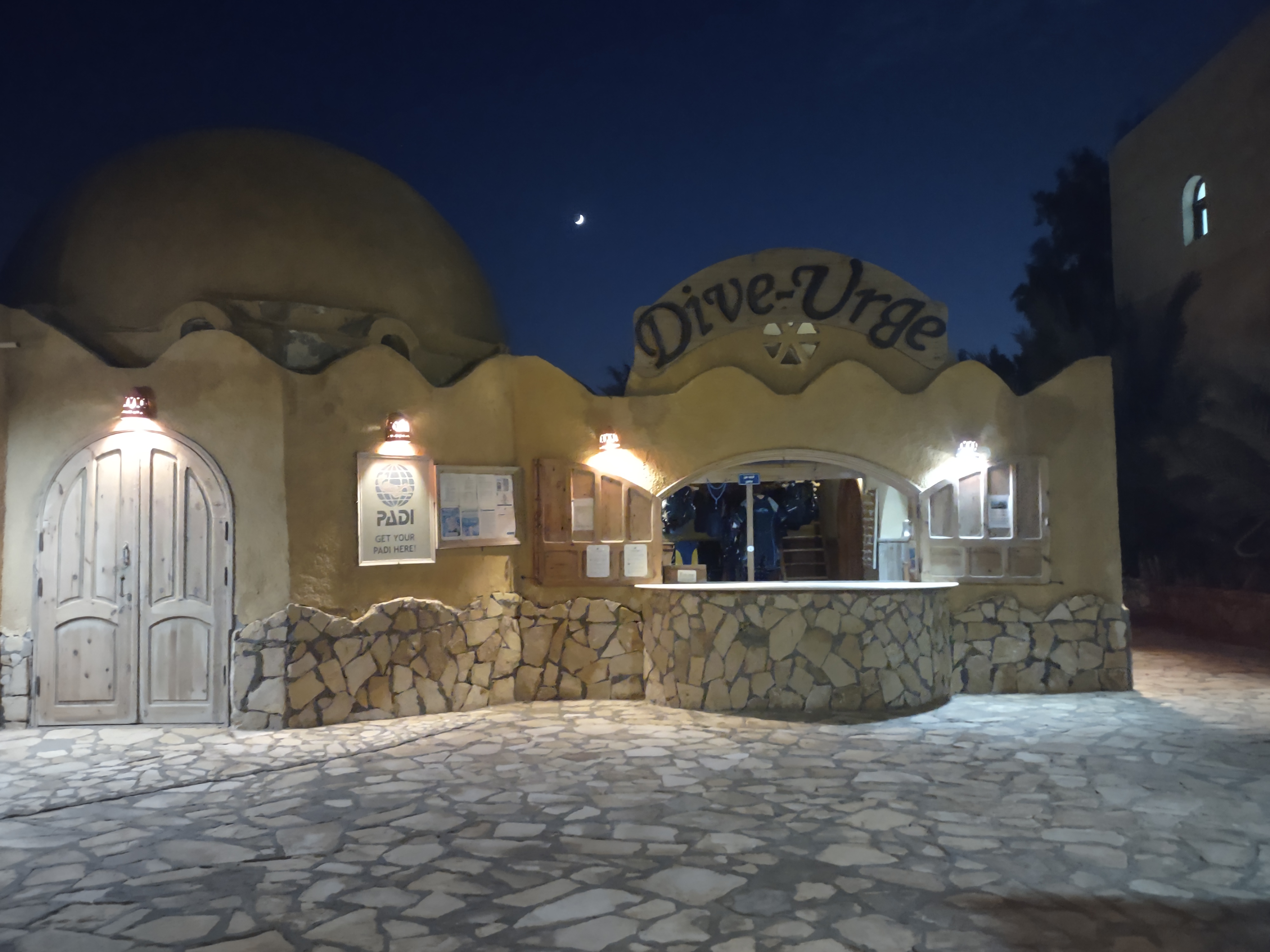 So, for us, Eel Garden Beach in the north turned out to be the best spot for hanging out at a place called Dive Urge. Dive Urge had a nice small beach with sun loungers and umbrellas as well as a shaded sitting and dining area. (Once we settled in there as regulars, we had our own corner with both sun loungers on the beach and an adjoining shaded seating/dining area.) But beyond doubt the best thing at Dive Urge was Atwa, the manager, who was incredibly kind and attentive and with whom we became friends of sorts. It was great that Colleen was very comfortable hanging out at Dive Urge by herself on days and at times when we were doing different things.
