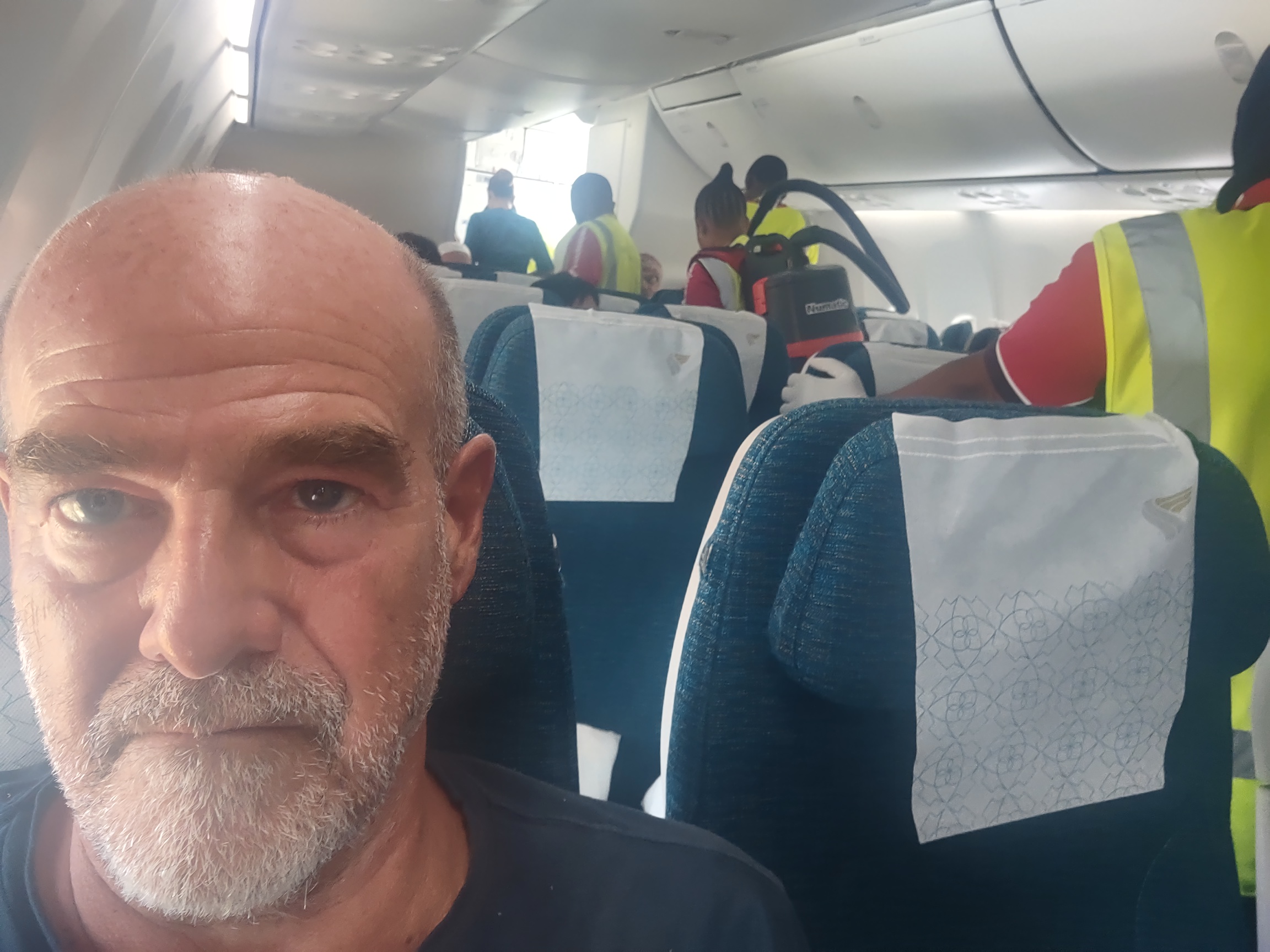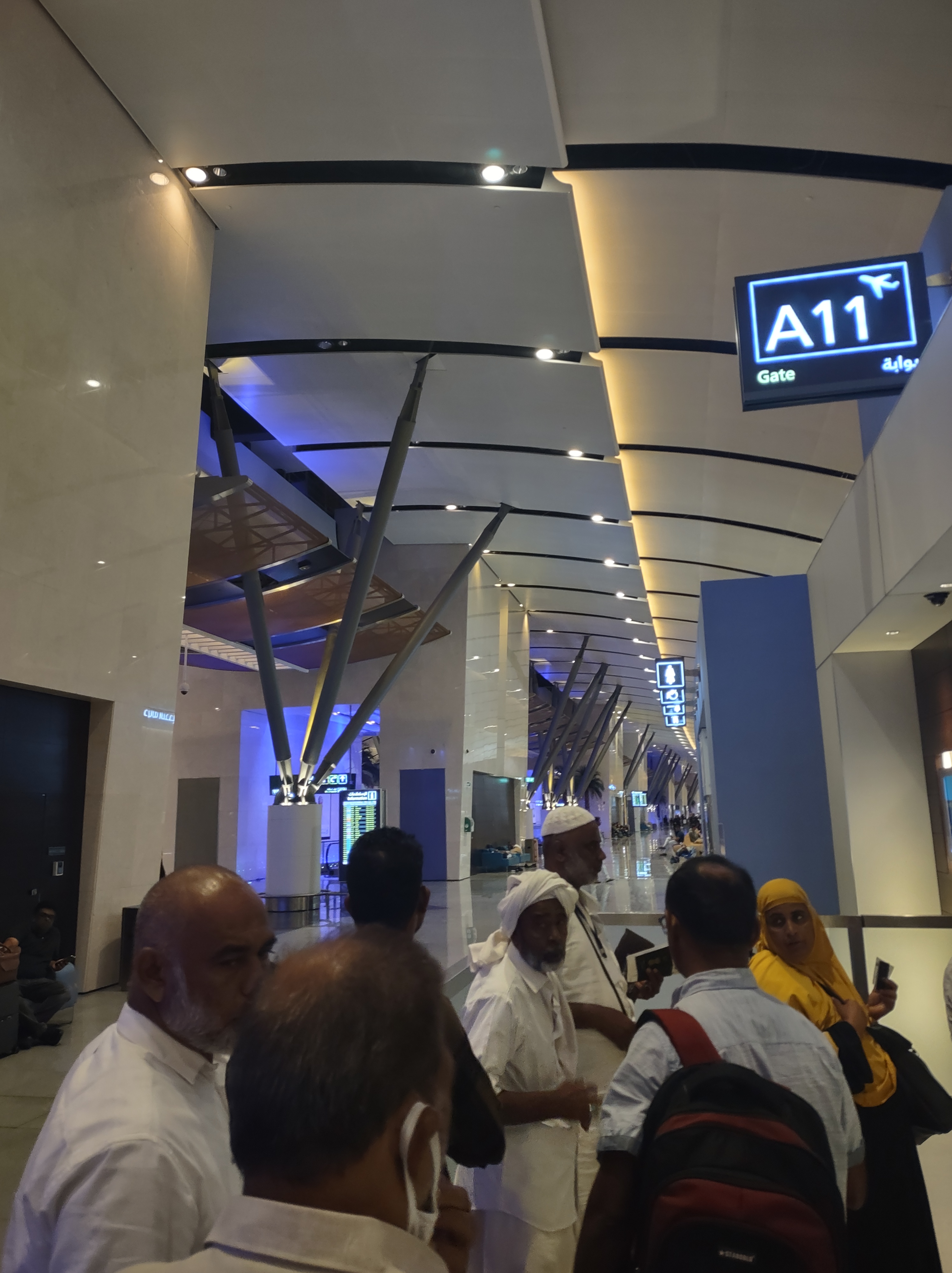 While we were sad to leave Zanzibar, we were very excited to see India, but we did have some trepidations about the trip because it involved an overnight flight which, in the past, have generally not been good for us trending mostly to bad. Our journey began in the afternoon of Saturday September 23, with a short flight back to Dar Es Salaam where we stayed on the plane while it was serviced (presumably to facilitate a quick turnaround, the plane was swarming with service crew!) before taking on more passengers and continuing on to Muscat, Oman where we arrived around 10 PM with about 3 hours before our next flight.