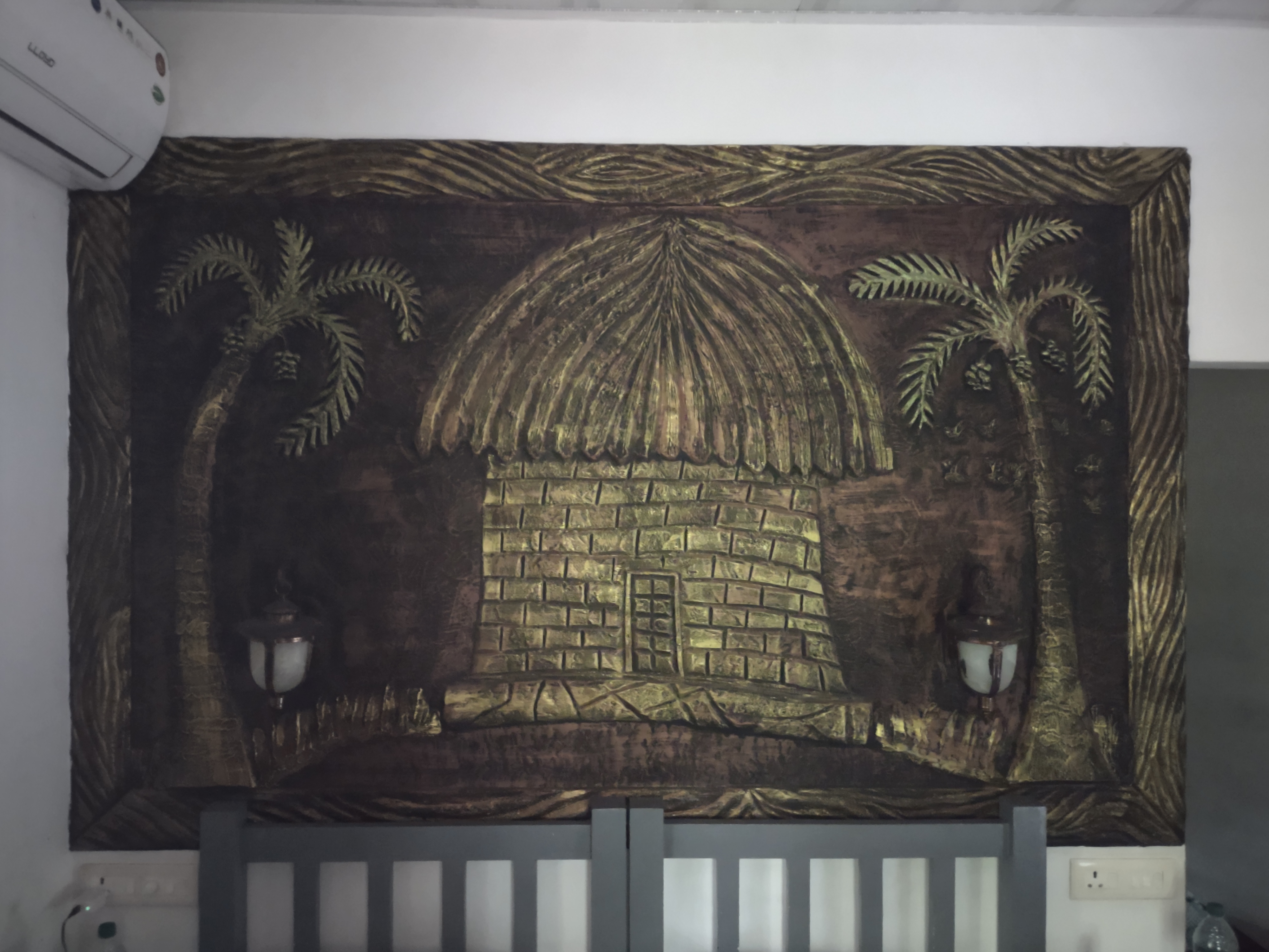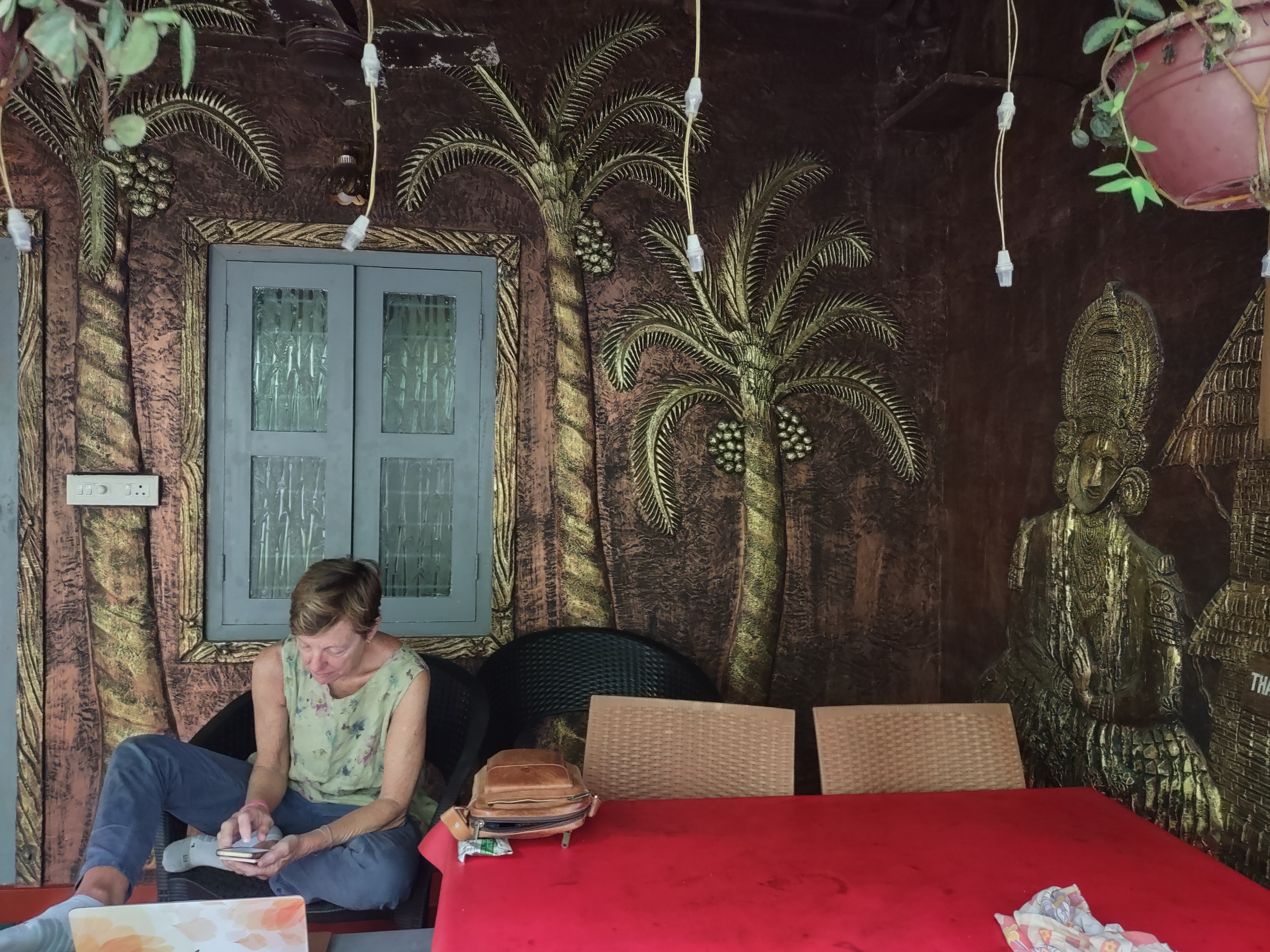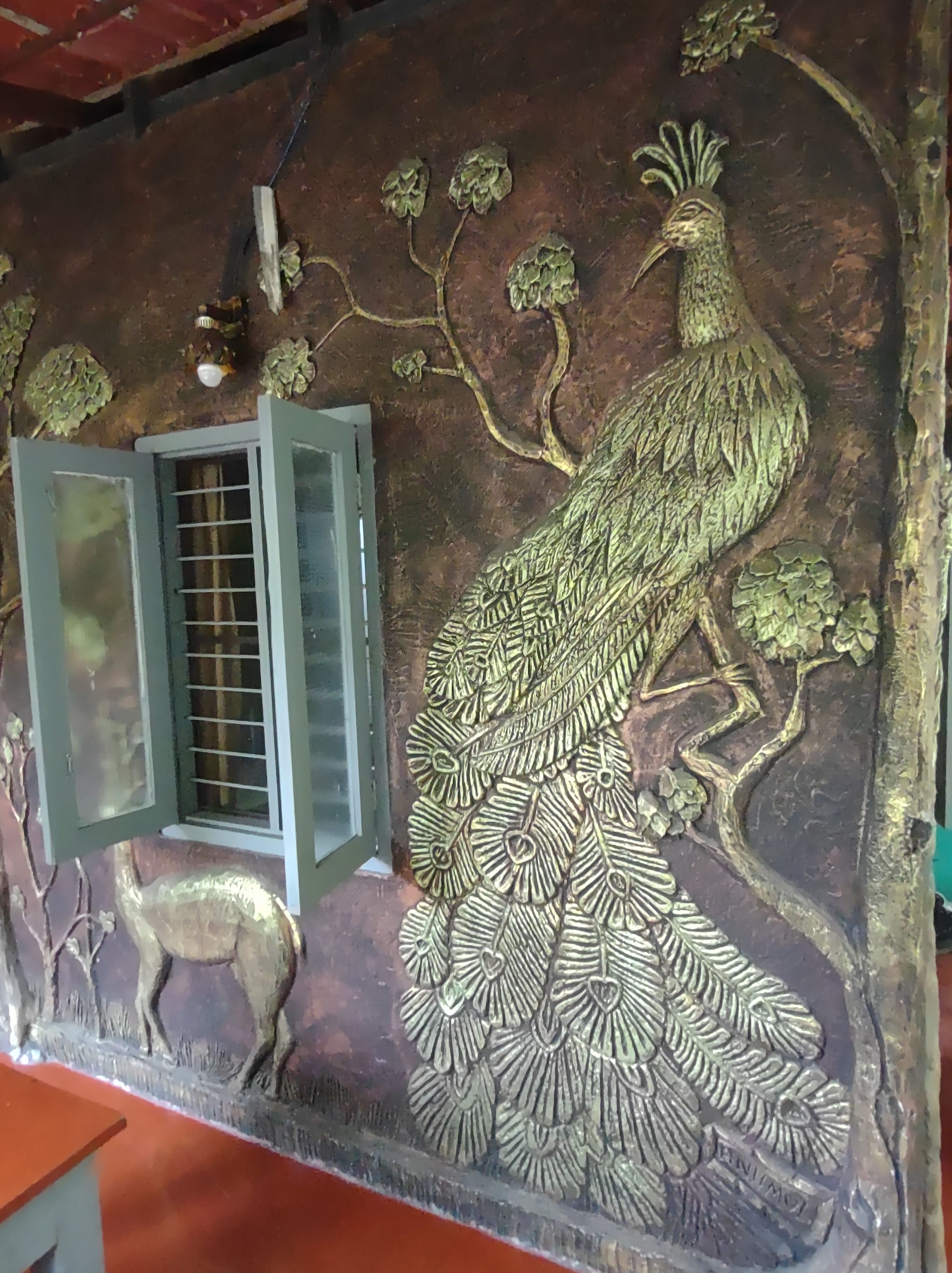 Our bedroom and a second one, each of which had a private bath, was an extension of the family’s home to the rear of the property. The exterior (and some of the interior) walls of the guest wing are clad in a decorative treatment of Binoy’s devise which involves hand carving of a thick facing of plaster as it sets up to create images in bas relief which are then hand painted utilizing another technique Binoy has developed. The end result of all of this is pretty amazing.