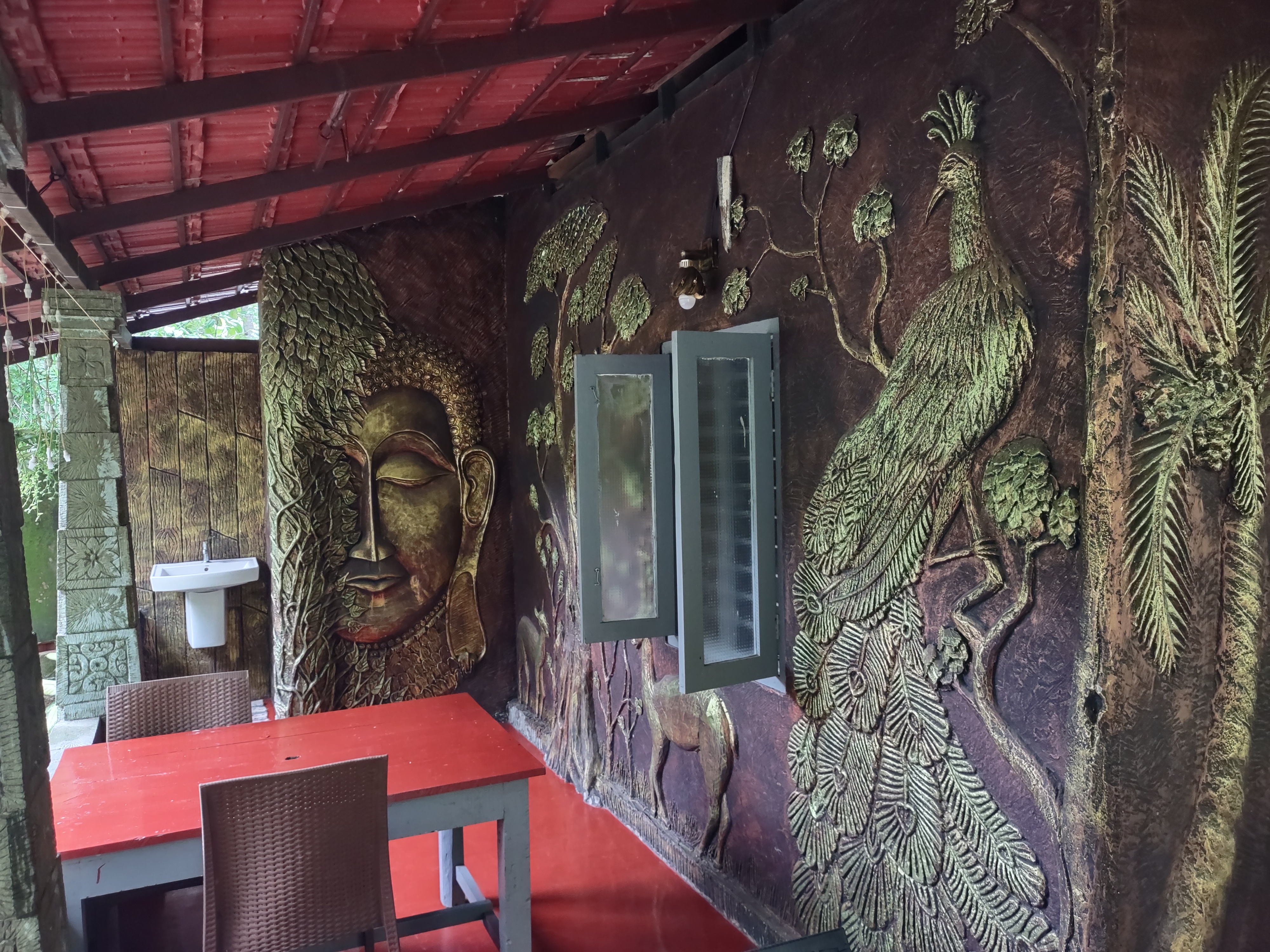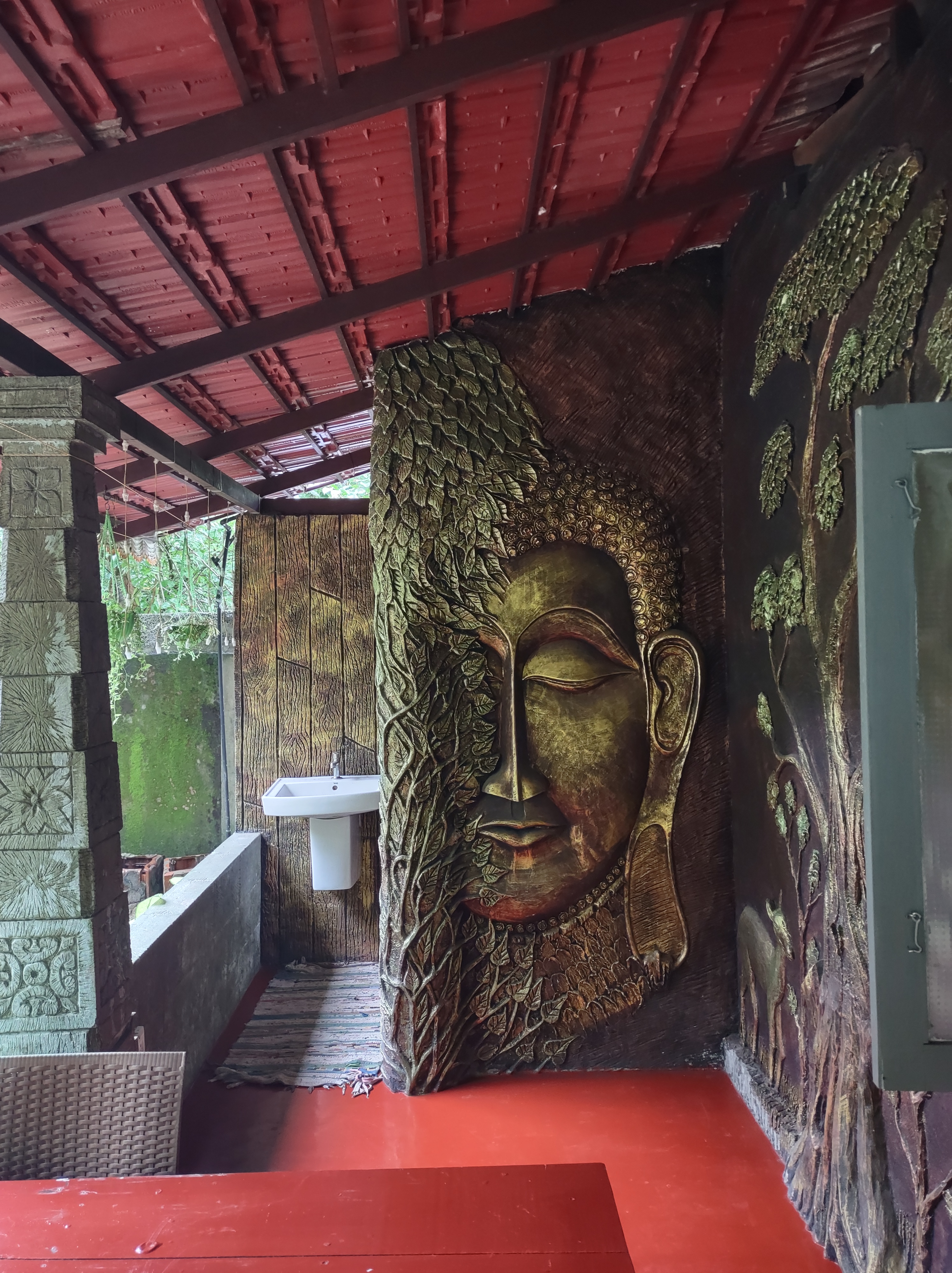 The exterior walls of the guest wing were wrapped in panels depicting scenes which included palm trees, grass huts, Buddhas, and a beautiful peacock. A similar panel with a grass hut and palms served as the headboard in our bedroom. For some surfaces, such as the columns supporting the terrace roof, Benoy utilizes a similar technique which involves carving the plaster without painting it. We dined on the terrace outside our room once or twice a day and hung out there for relief from the sun or rain, depending upon the weather) reading, writing, and relaxing (not to mention playing with Aquino) and so had the opportunity to really appreciate the detail and beauty of Binoy’s work.
