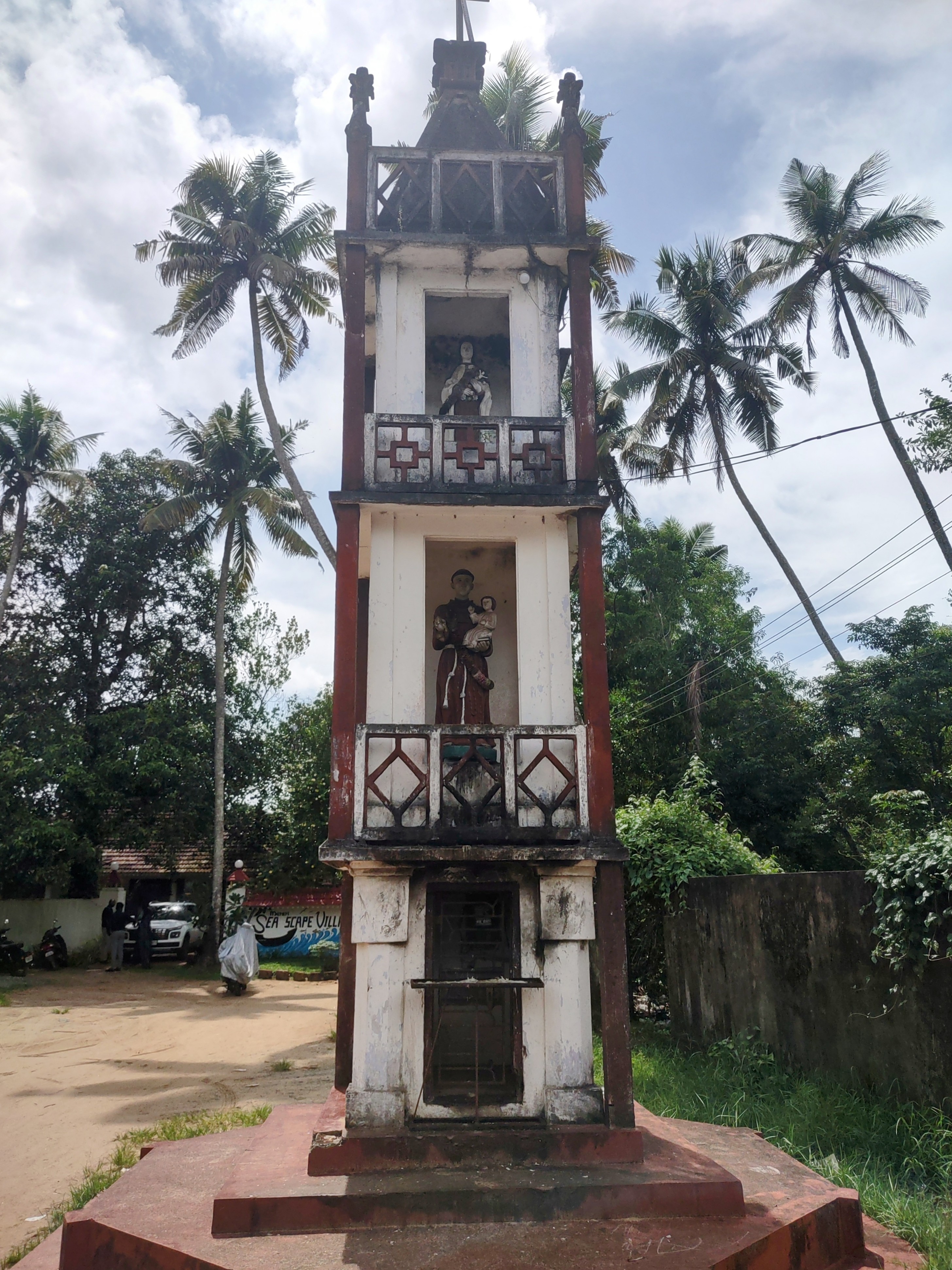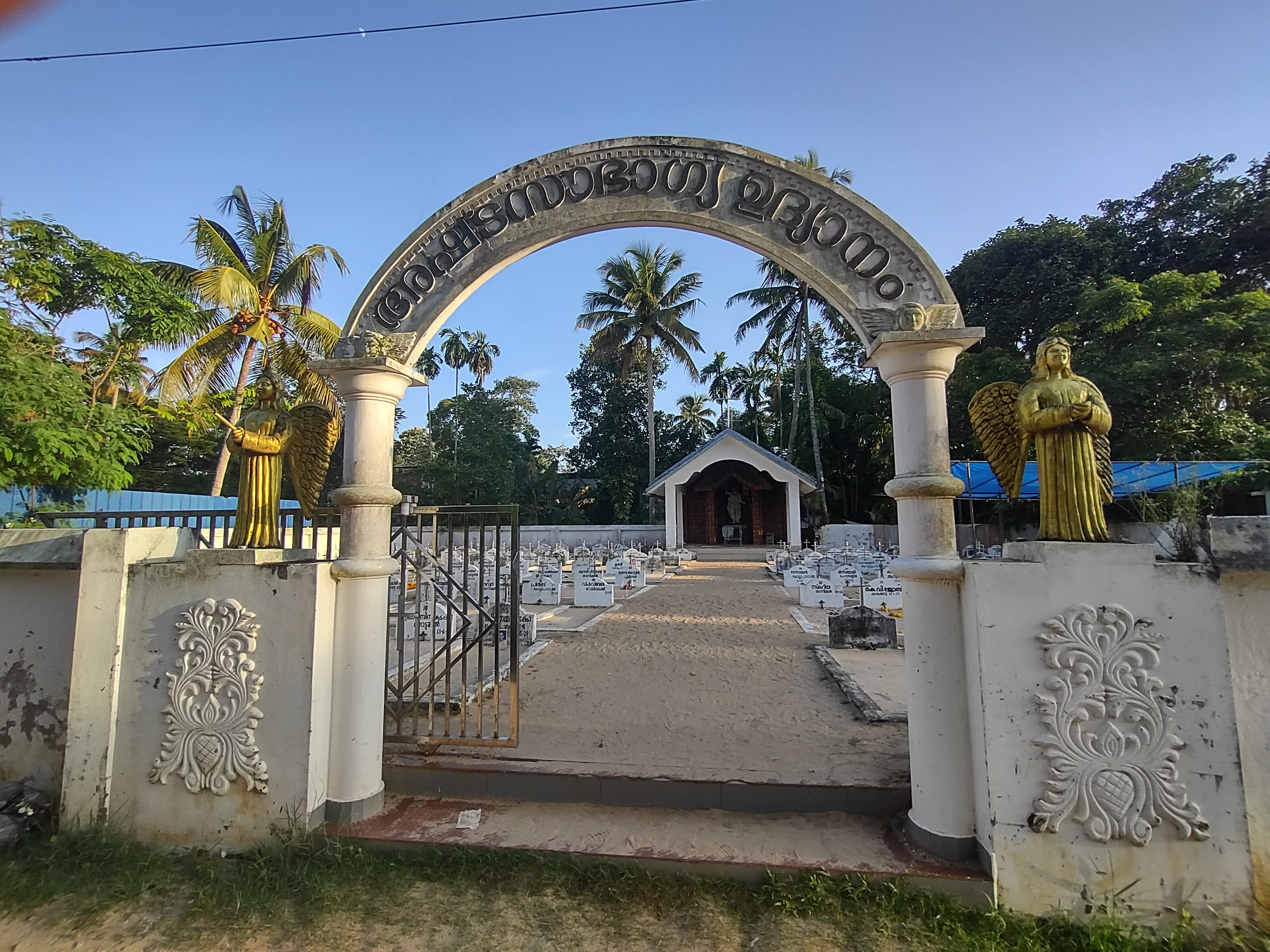 St. Augustine’s, the parish church which Swapna’s family attended, which was located across the highway from our Beach Road, was the most prominent and ornate structure in Mararikulam and, we would discover, very similar to other Catholic churches in the area. It was quite interesting to see how its design not only incorporated details drawn from traditional Indian architecture, but also whole elements which made it seem more like a Hindu temple than a Catholic church.