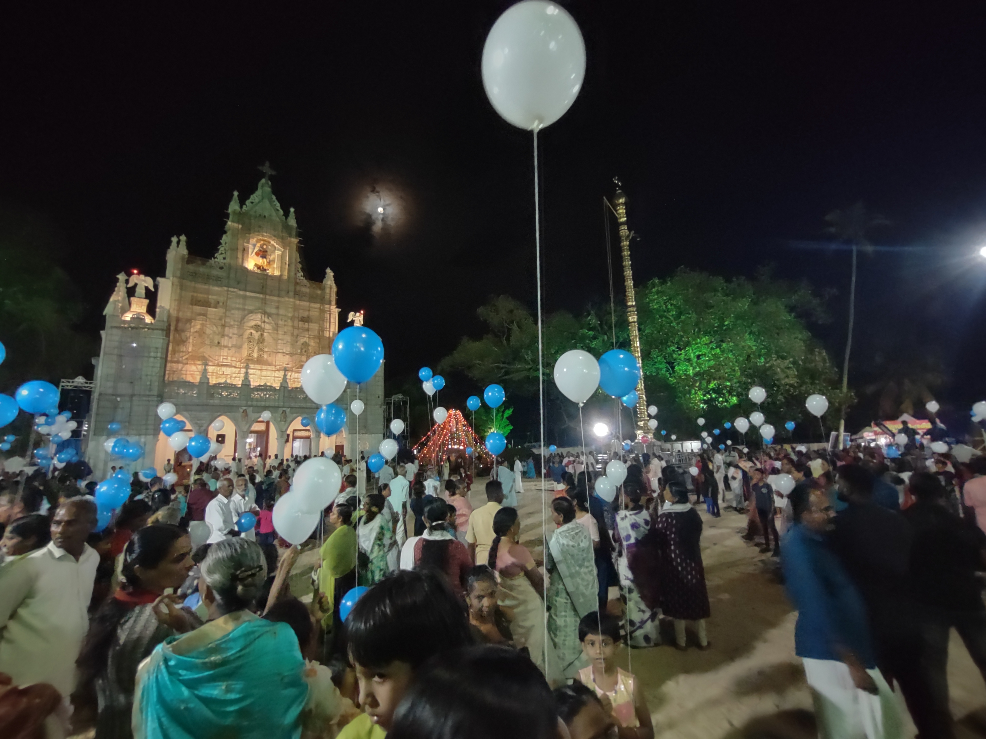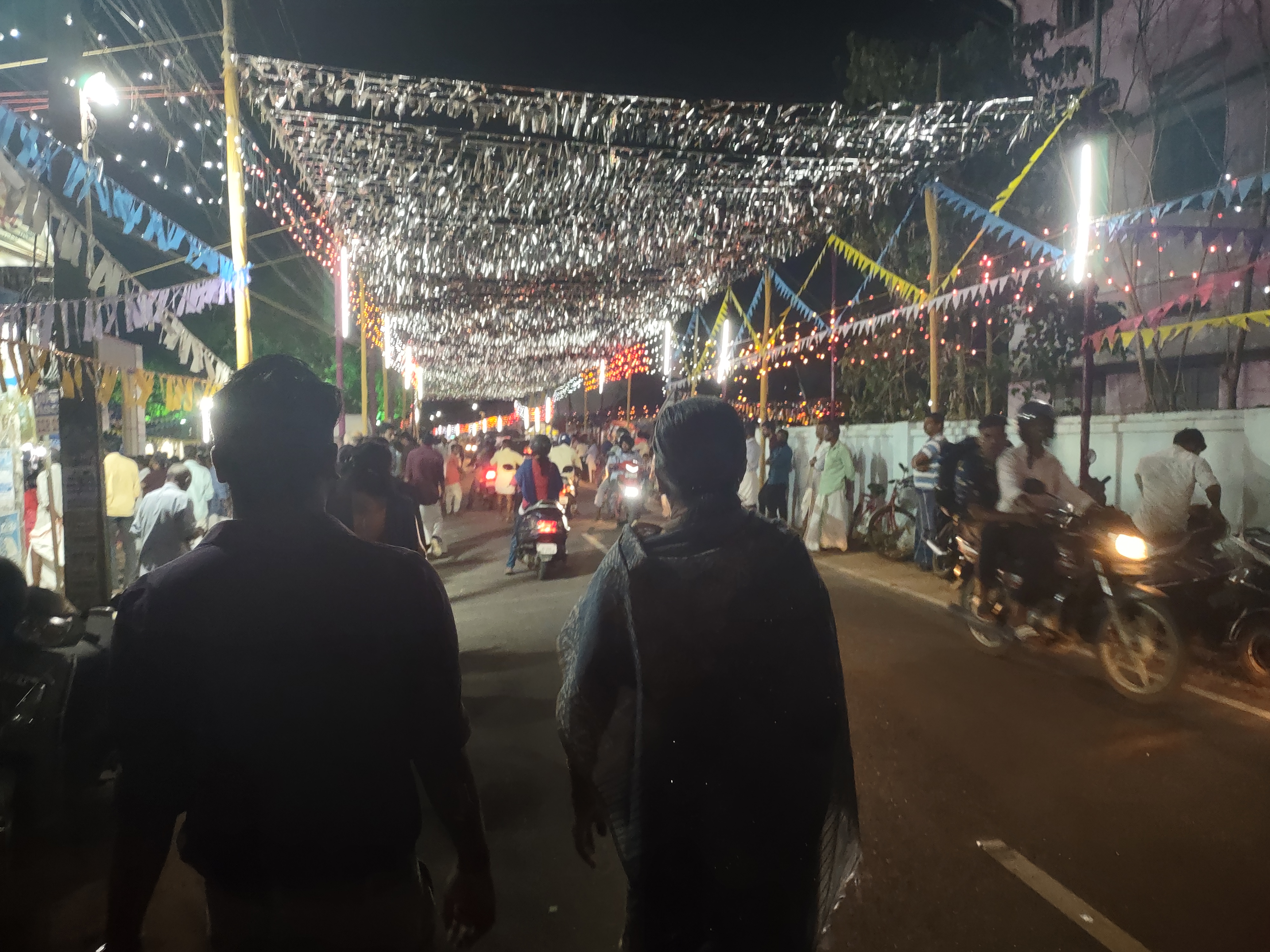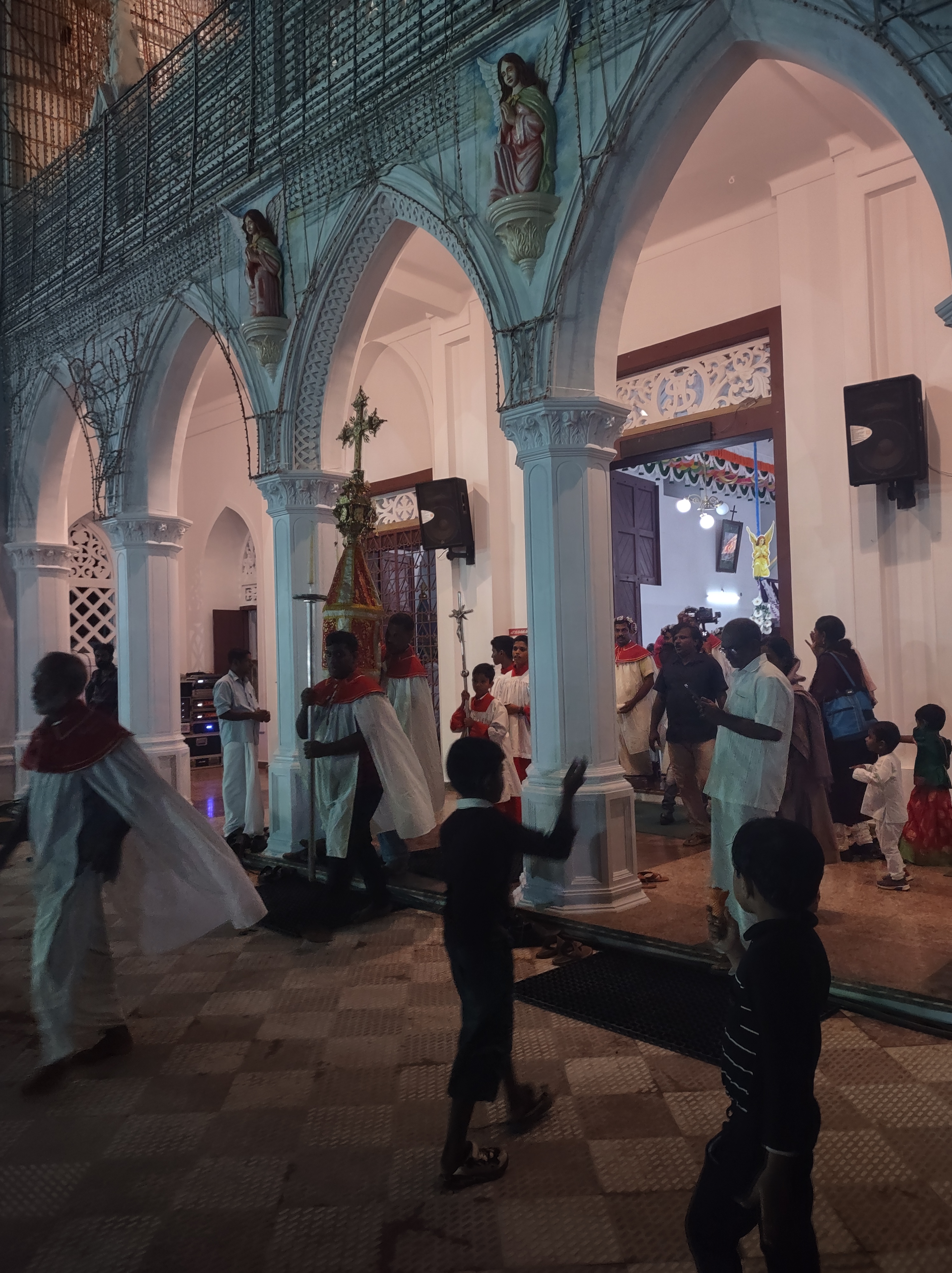 On the day of the Feast, our friend Neville picked us up at our homestay along with Swapna and the kids (Binoy met us at the church later) and we made our way south down the Beach Highway. We had passed by St. Michael’s on a couple of occasions and had seen decorations going up along the highway, but we were unprepared for what we found there that night. Neville had to drop us off several blocks from the church and we made our way there on foot along with a throng of feast-goers passing under the street decorations which were now all brightly lit.