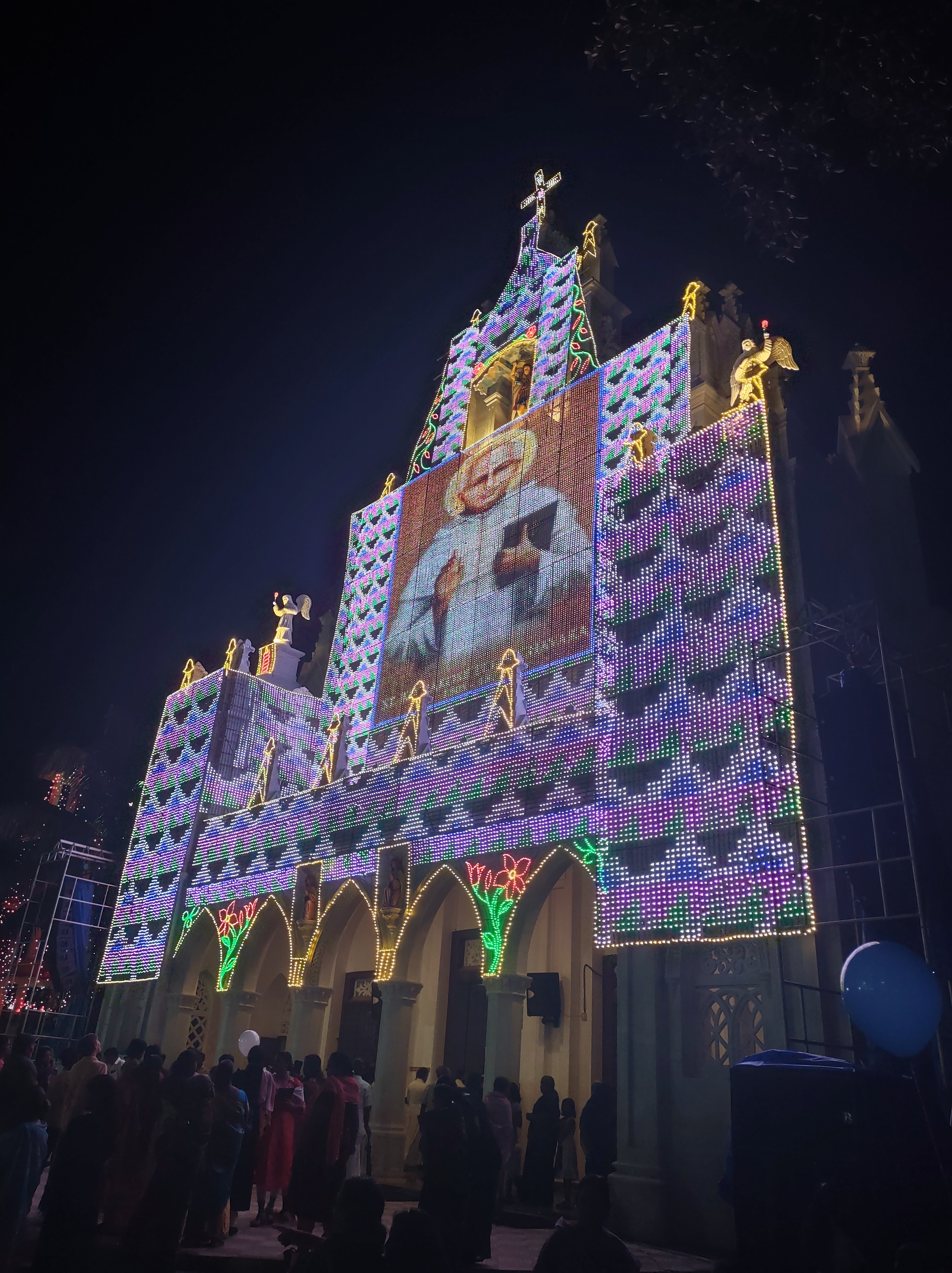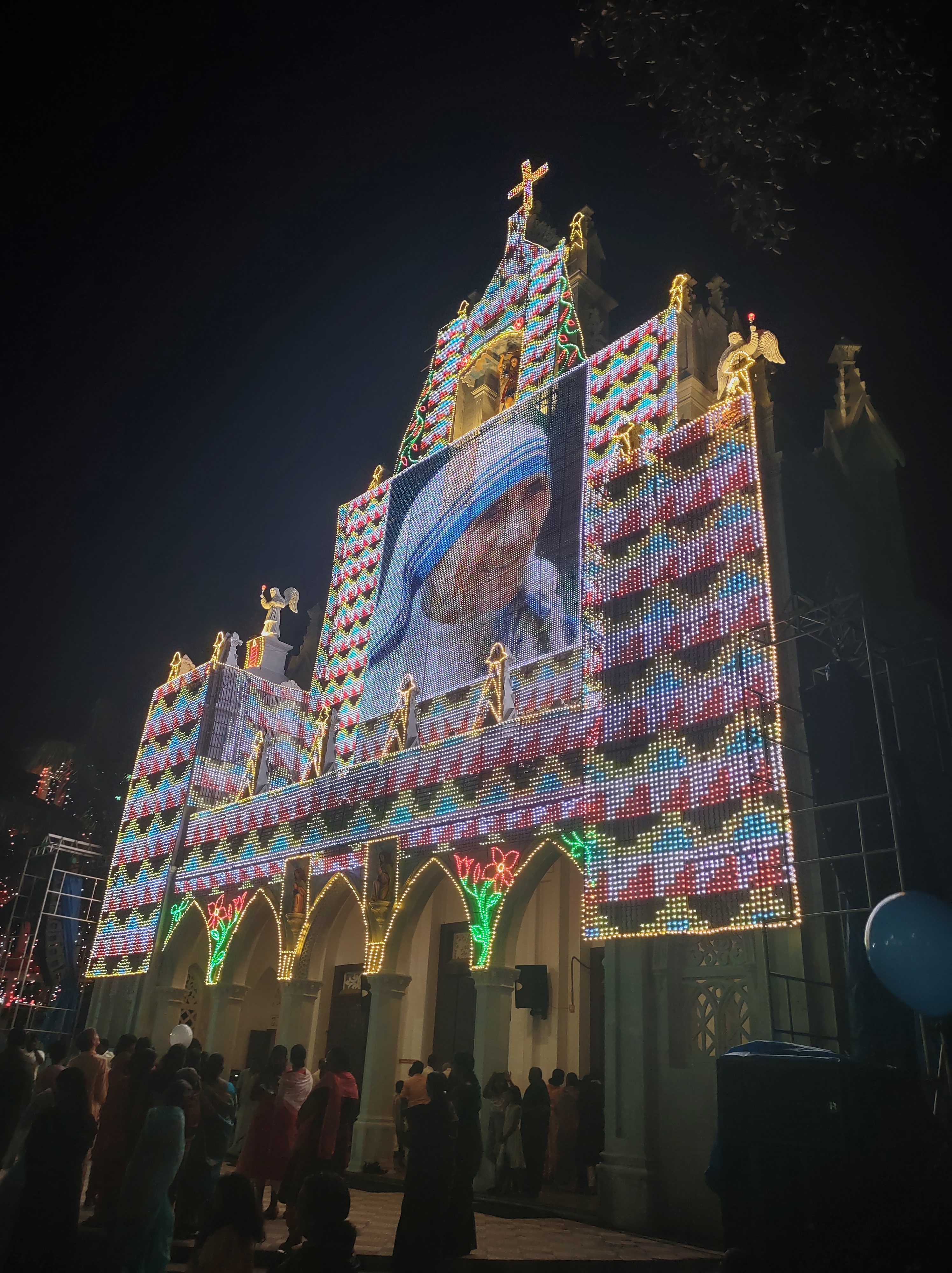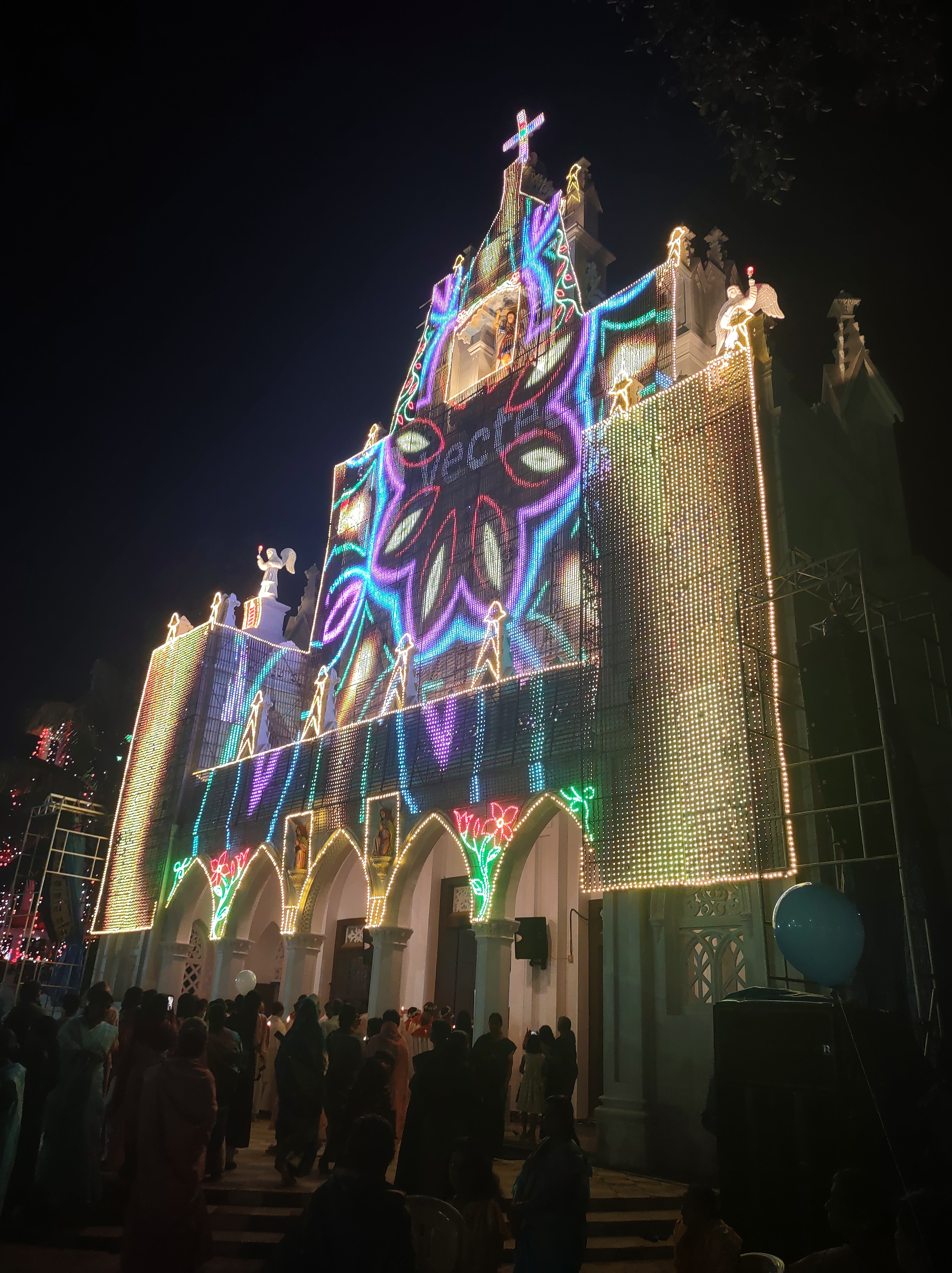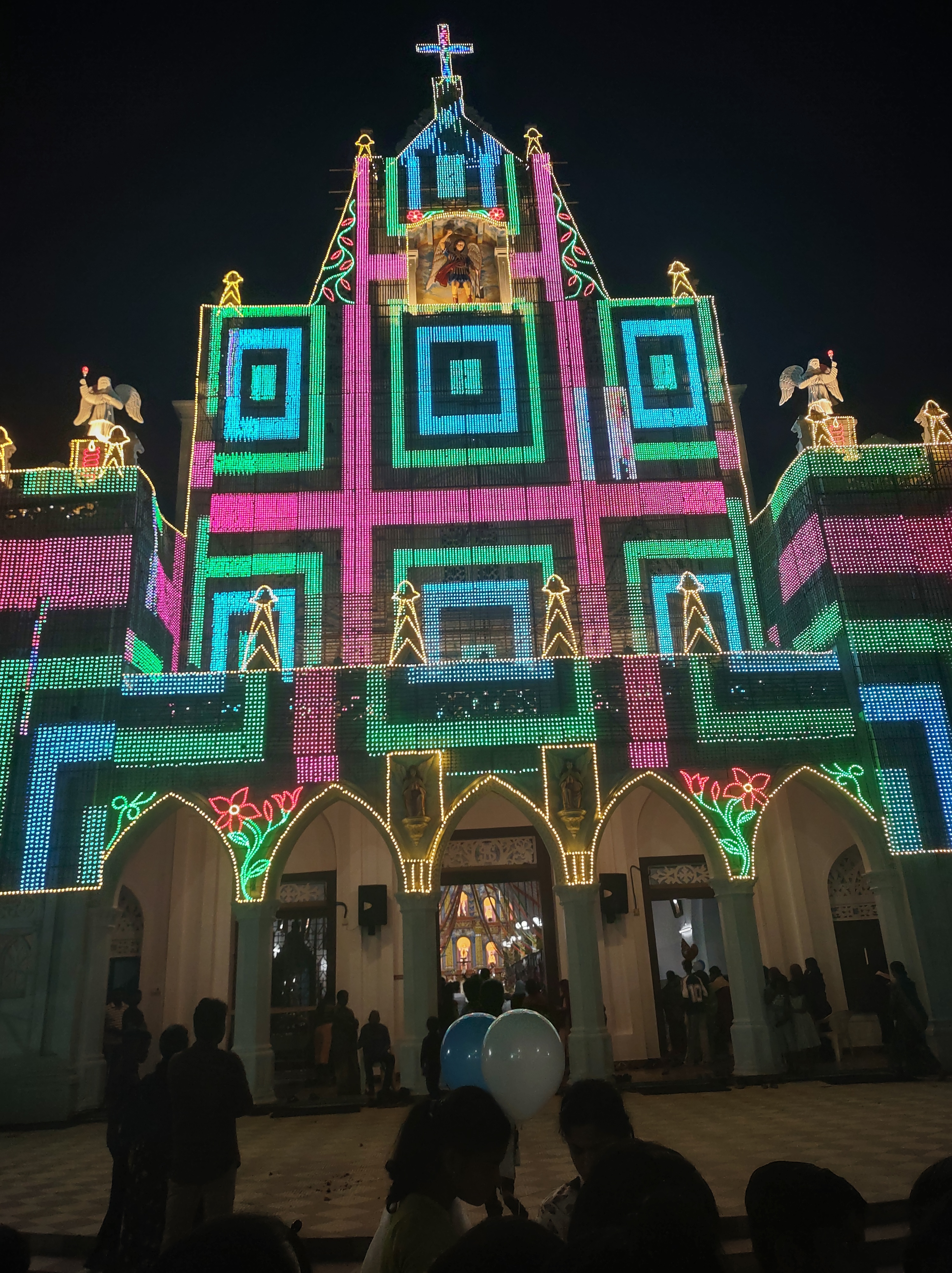 It seemed that the latticework covering the church’s exterior was a fairly elaborate lighting display which allowed almost any pattern or image to be displayed and animated across the façade of the church. In addition to a number of brightly colored moving geometric patterns, the display included the visages of Mother Theresa and the Pope. Swapna explained that the light system was pretty expensive but that some of the men of the church had ponied up for it. (Apparently there is a bit of a rivalry among churches for who has the best saint’s day festival.)