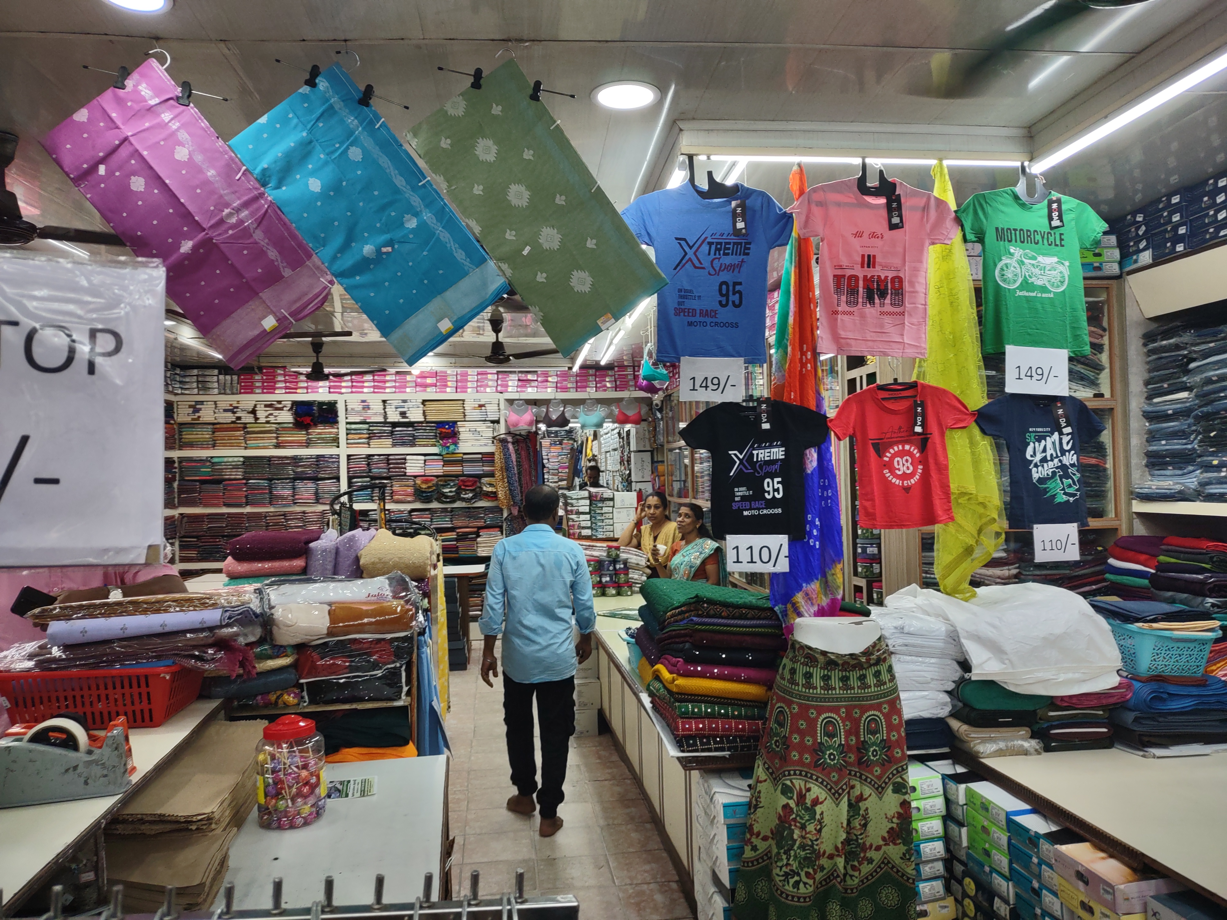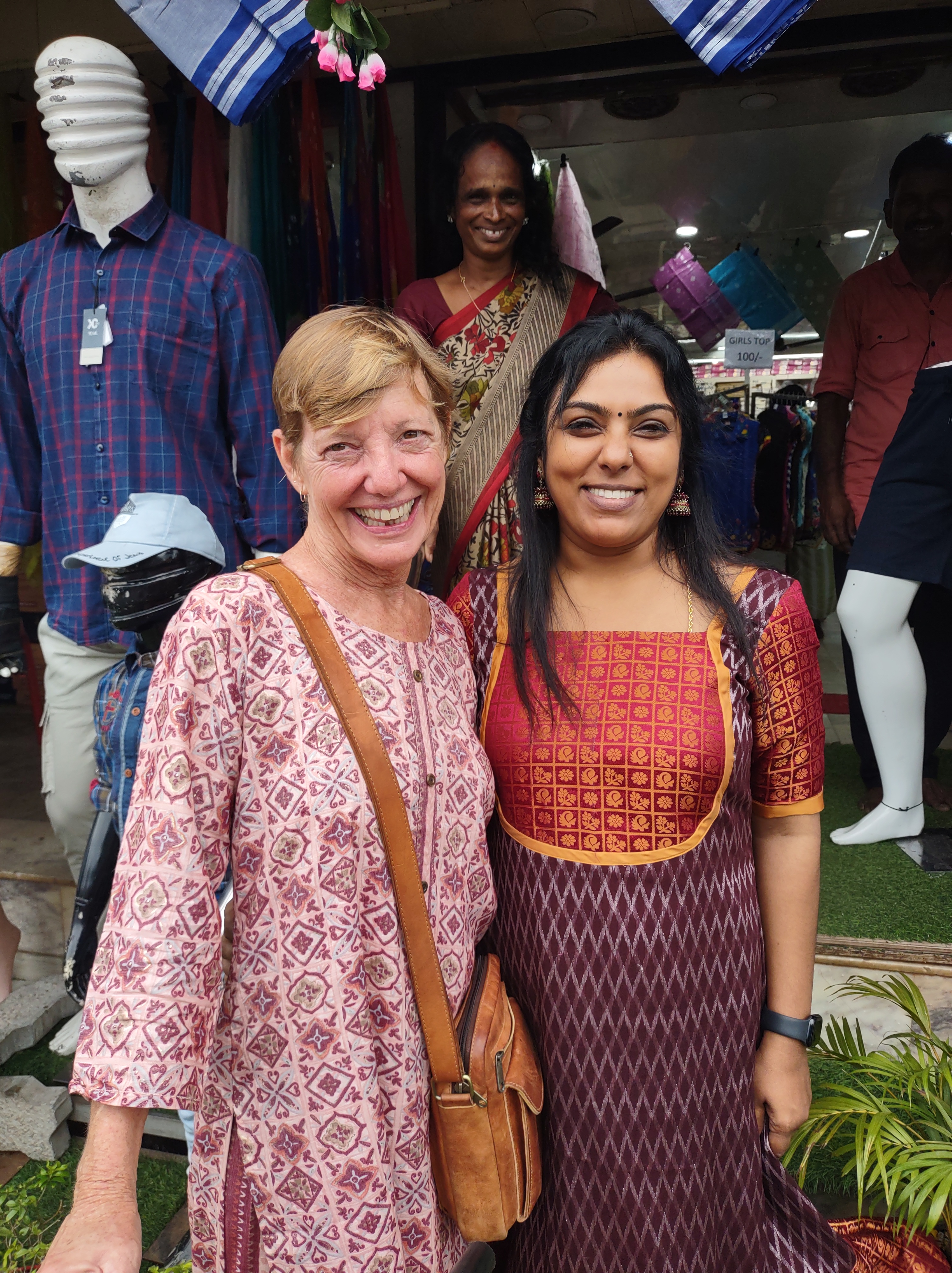So not surprisingly, we also shopped in Alappuzha (Colleen had, in fact, for some time been saying that she was “holding off” on clothing shopping until we reached India, but not surprising in any case.) As it turns out, shopping for traditional Indian clothing is a pretty time-consuming process largely because there are so many different colors and patterns available (not to mention so many stores), but also because of the process. When you enter these stores you stand at a counter facing literally hundreds of outfits which have been folded flat and wrapped in cellophane so that you can see about a ½” sliver of them.