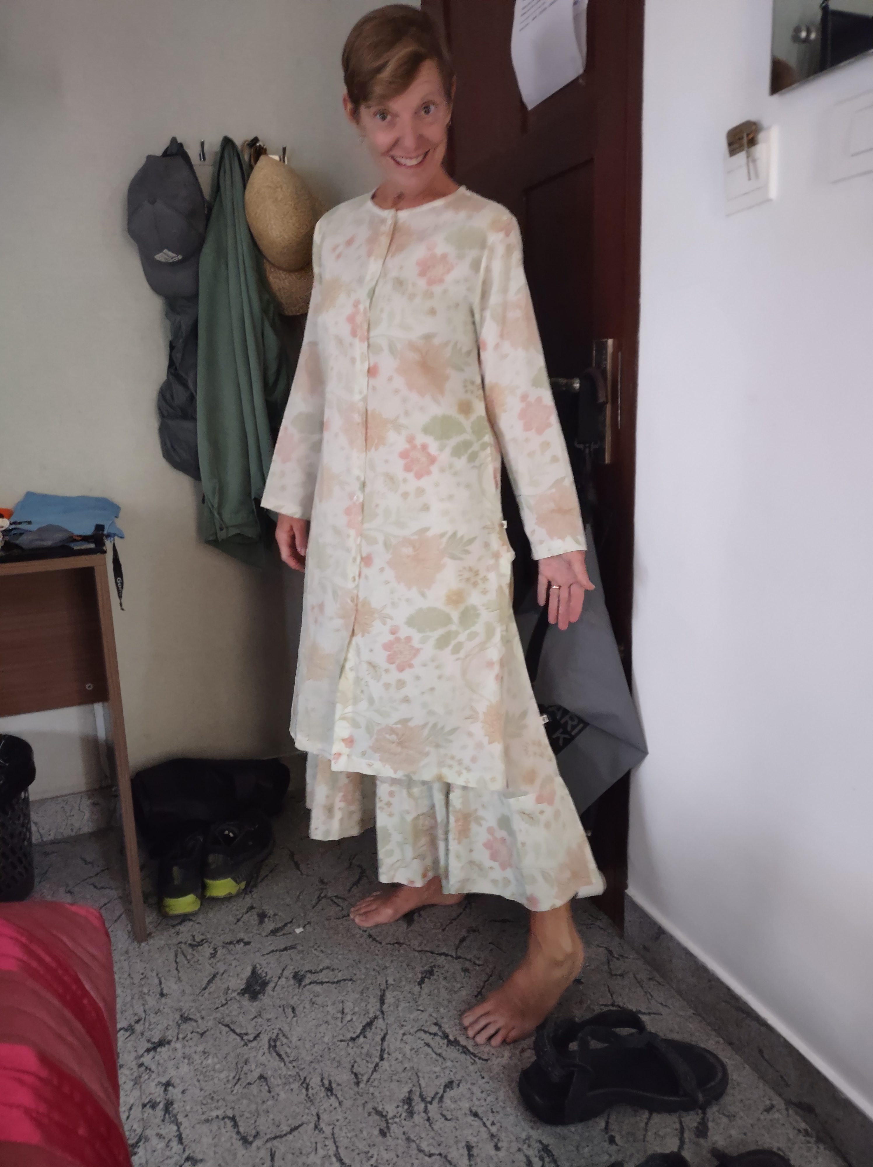 The normal process is a bit of a needle in a haystack approach where sales people behind the counter begin selecting outfits they think (for whatever reason) you might like and then unwrap them and display them on the sales counter. (There are 2 or 3 pieces to each outfit, each with different colors and patterns, so it is necessary to unwrap them in order to determine whether you like them.) Depending upon how good the sales people are at guessing what you might like, this process can pretty quickly result in 20 to 30 outfits being piled on the sales counter, most of which will need to be refolded and rewrapped (which seemed kind of crazy to us but does give the sales crew something to do between customers).