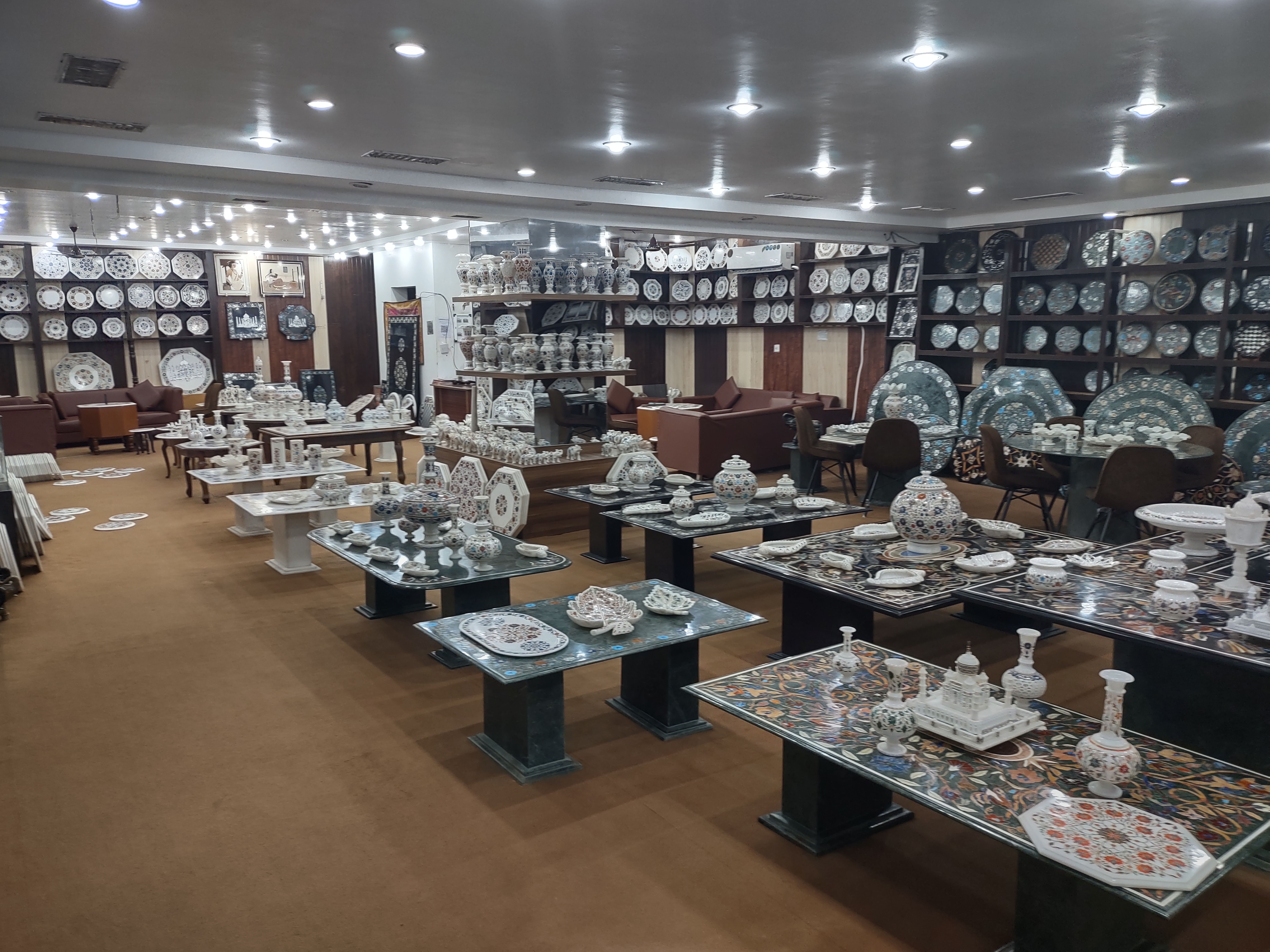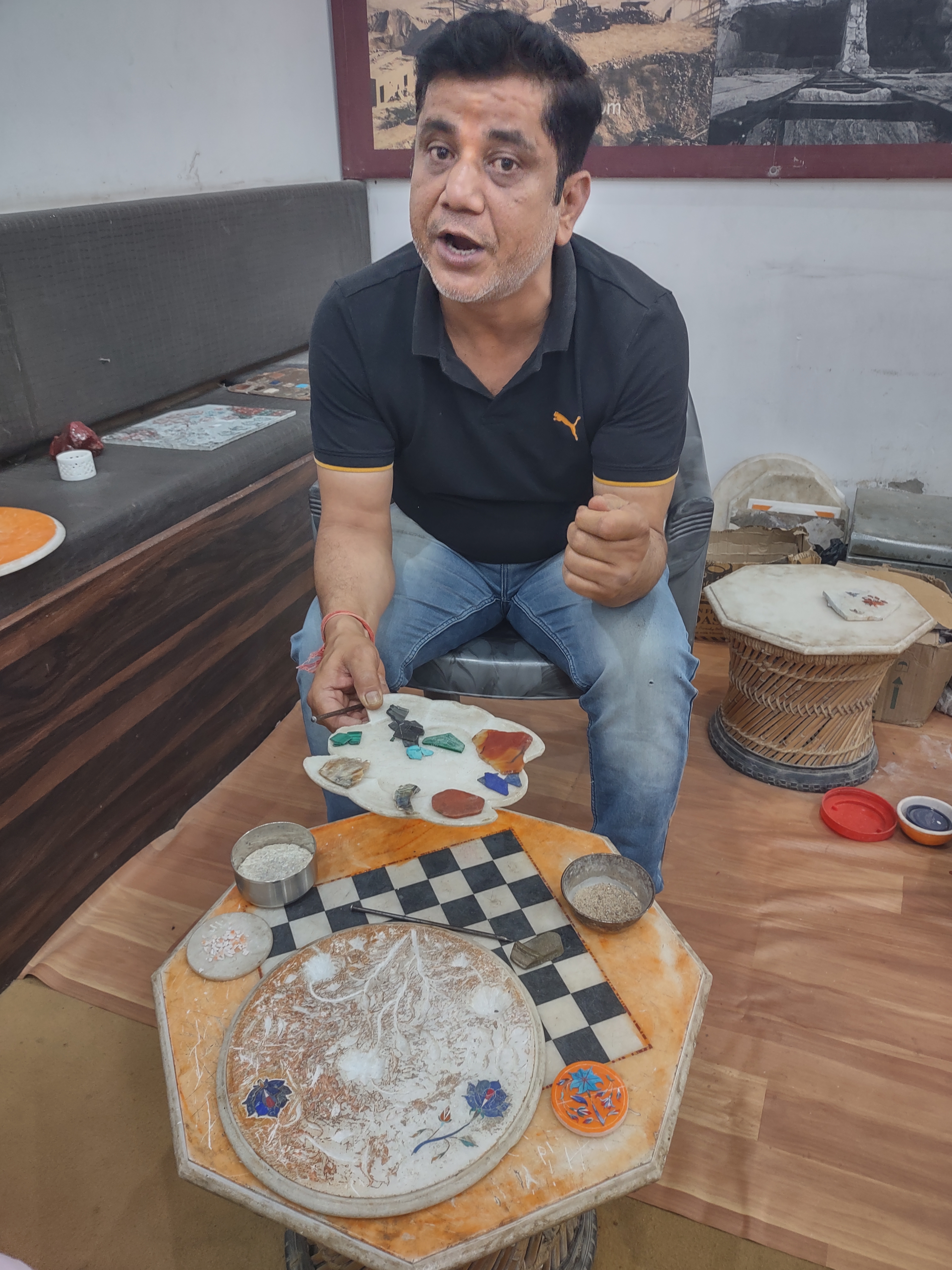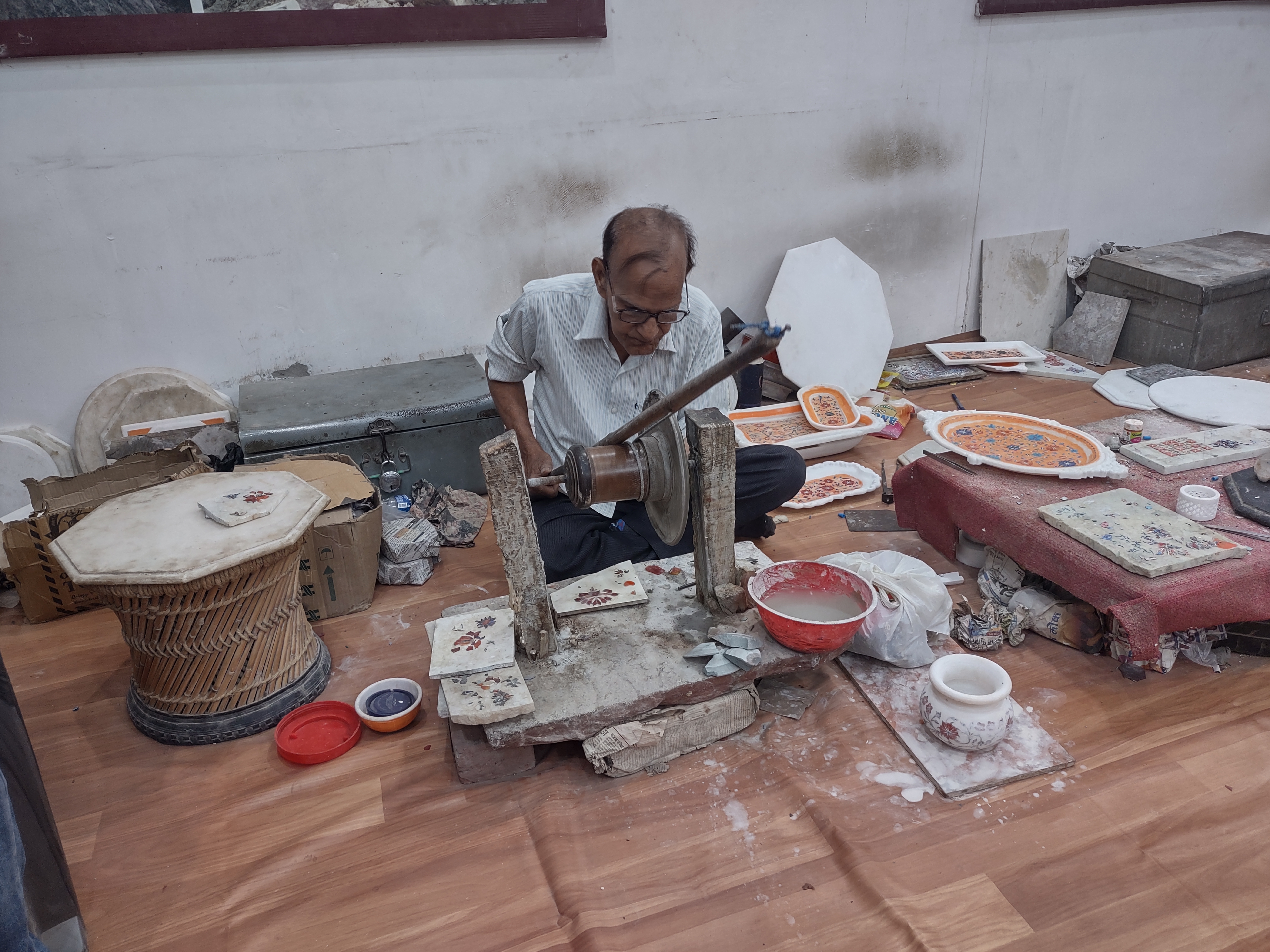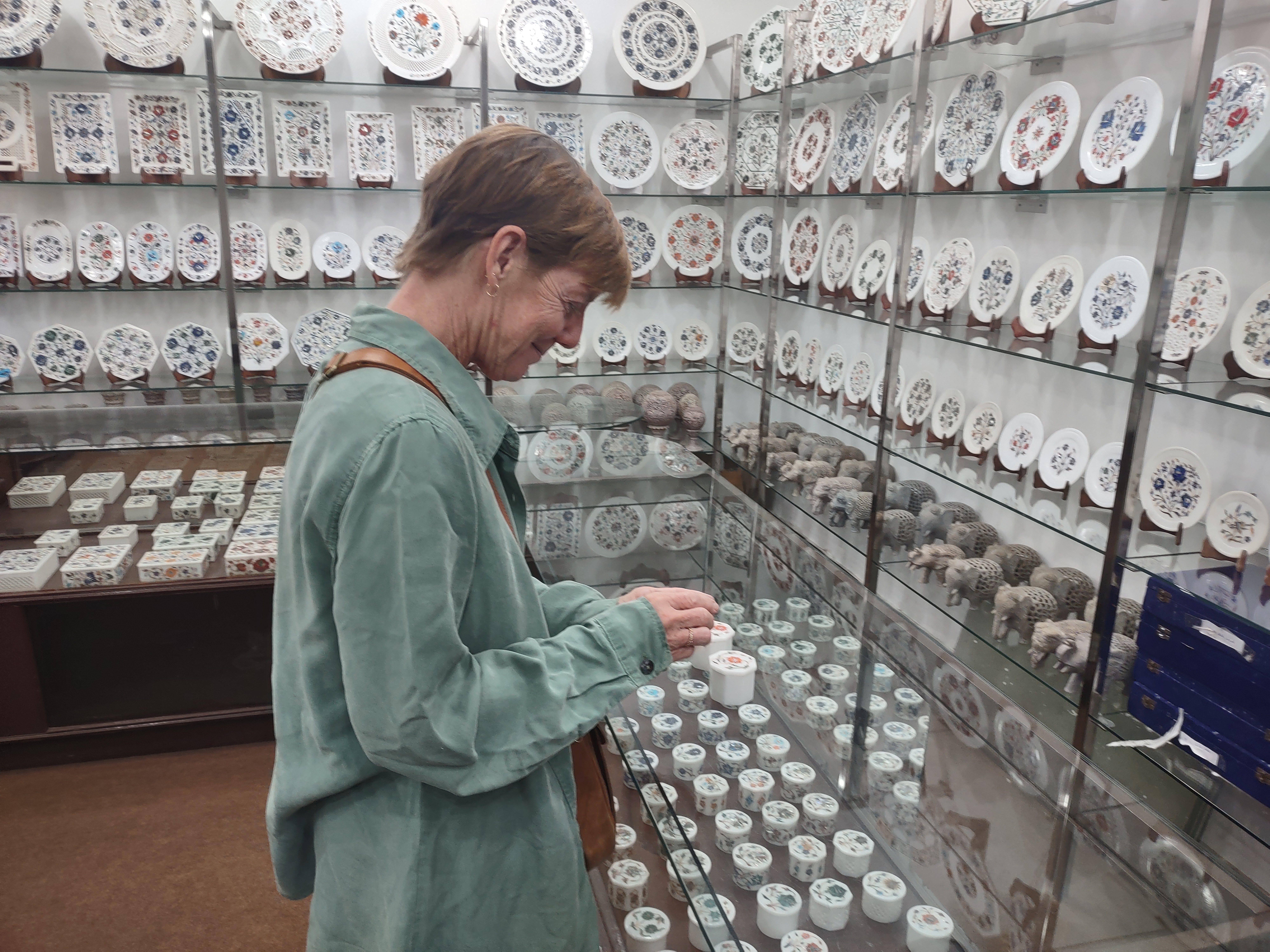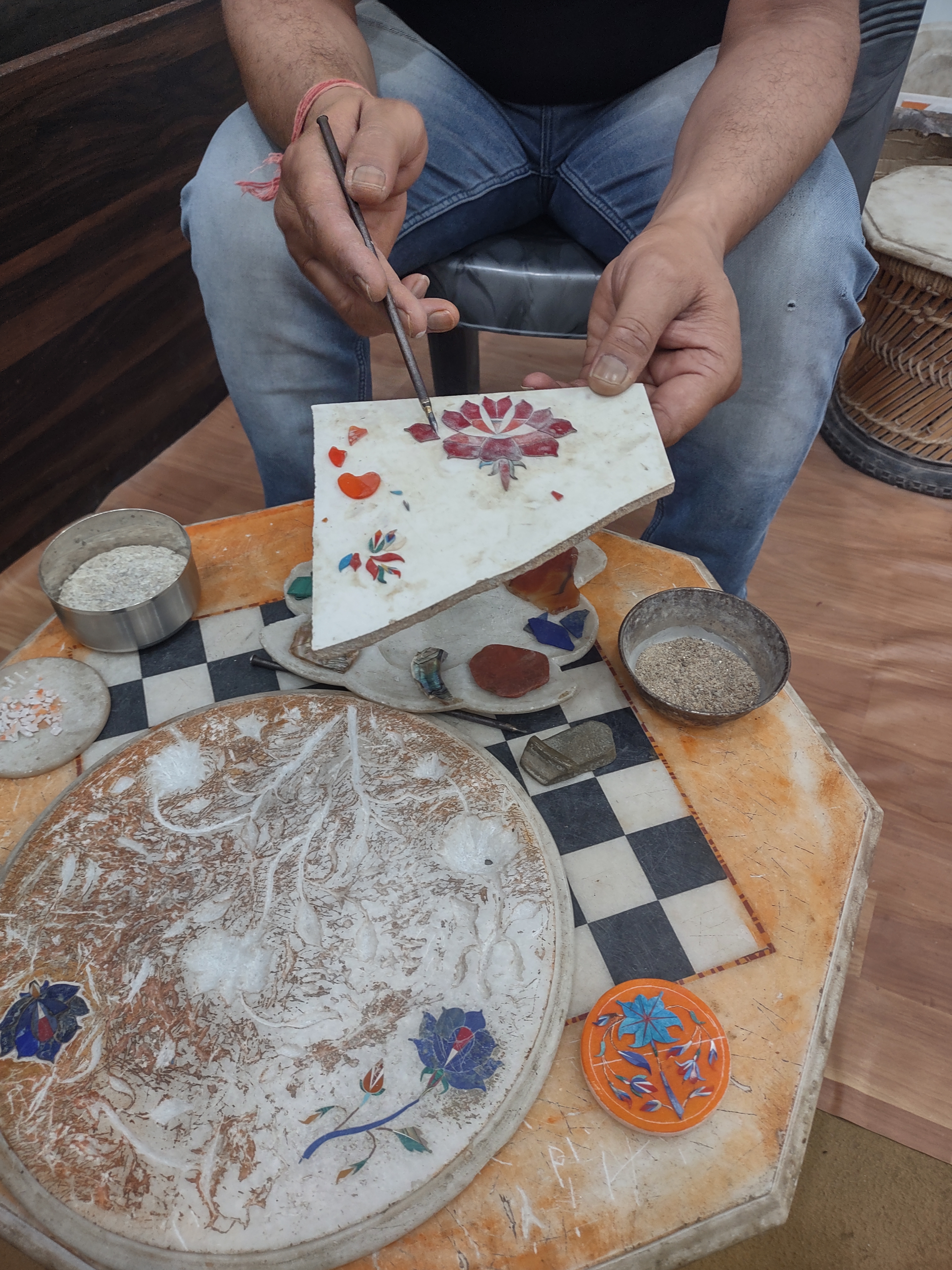 On the way back to our hotel, we visited an artisan’s shop recommended by Tarmenda where they still have masters of the inlaid stone work for which Agra is known. It was all incredibly beautiful and incredibly expensive, but we found a small piece we liked which was only absurdly (rather than ridiculously) expensive and made a hasty retreat back to our hotel before we did anything more stupid or costly.
