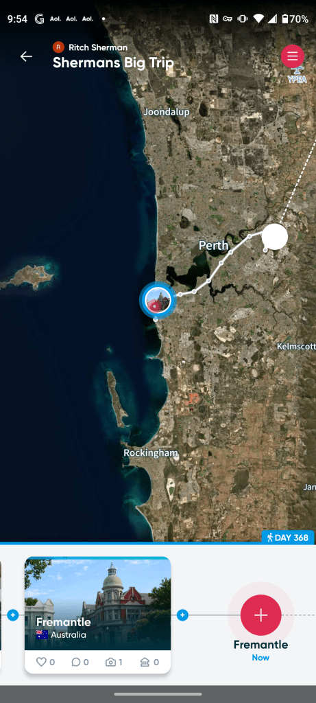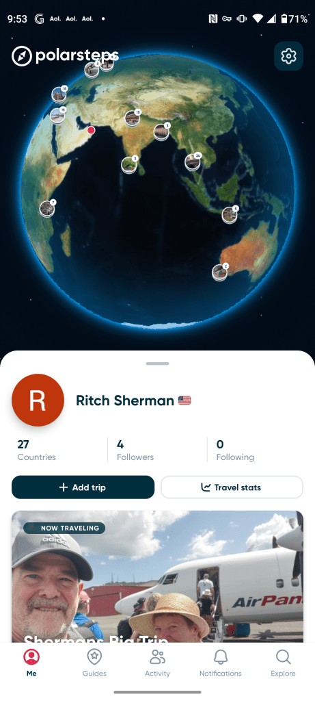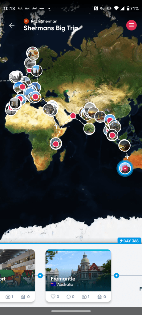 PS – We’ve received comments and questions regarding the planning and logistics of this grand adventure, a subject which probably warrants its own blog segment.  But, in the meantime, if you are interested in more details regarding where we’ve been, download the app Polarsteps and look for Ritch Sherman and Shermans Big Trip.  Polarsteps is a pretty cool app which tracks the details of our trip – dates and places – and has a great graphic representation of it showing our route and stops around the globe.  According to Polarsteps, there have been a total of 139 steps to our trip thus far, including day trips and layovers.  Whew!