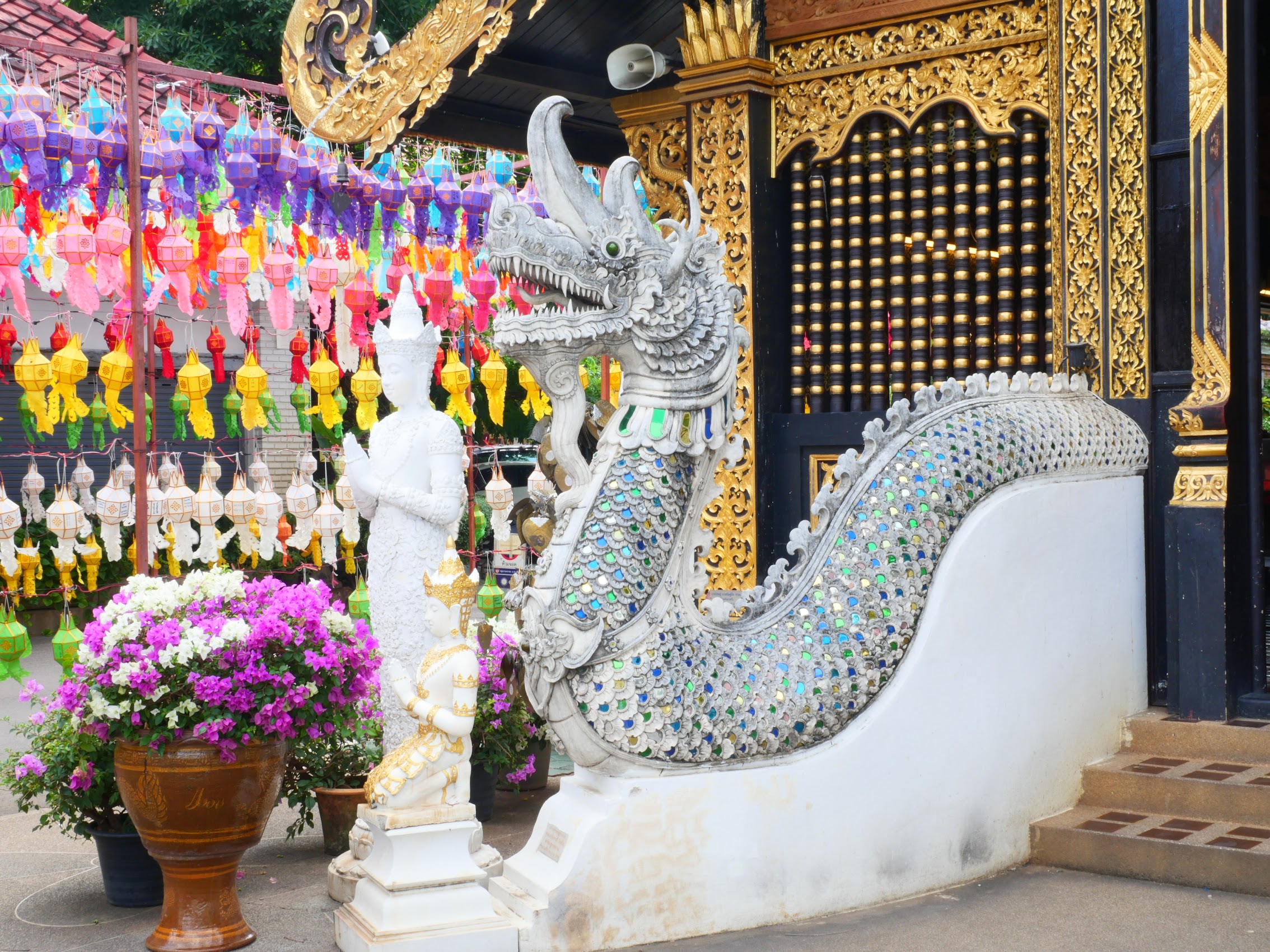 Interspersed among everything there were also an incredible number of temples, seemingly one on every block. (There are reportedly over 300 temples in the city of Chiang Mai and most of them are located in the old city.) It is impossible to go from anywhere in the old city to almost anywhere else without passing a temple, and I lost count of how many we visited in our wanderings. The temples complexes vary considerably in size and you are often surprised at how big they are once you wander in.